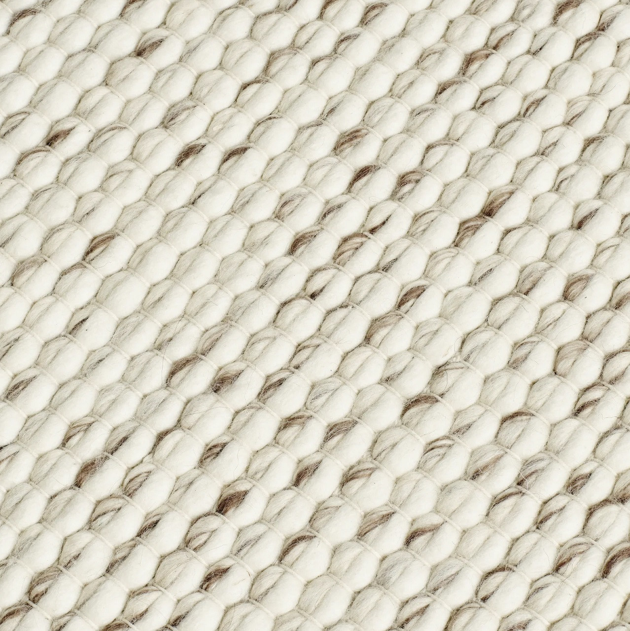Projekt opiera się na charakterystycznej, pętelkowej fakturze, tworzonej przez dwukolorowe, neutralne włókna wełny, które nadają powierzchni lekko sprężysty, „żywy” charakter. Zastosowanie przędzy melange sprawia, że kolory przenikają się w subtelny sposób, tworząc spokojną, ale niejednorodną kompozycję.
