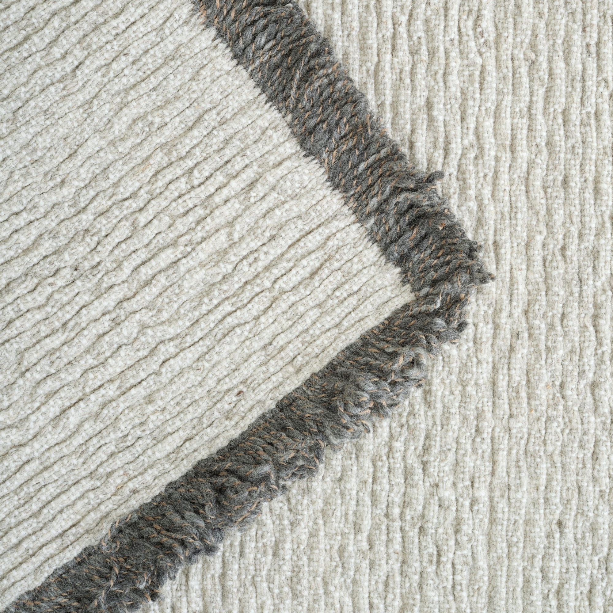 Nowoczesny dywan zaprojektowany przez renomowane studio projektowe Norm Architects dla duńskiej marki Linie Design. Ręcznie tkany dywan łączy elegancję i funkcjonalność, wprowadzając do wnętrza naturalne ciepło i harmonię. Wykonany w 100% z wełny nowozelandzkiej, o gęstości 2200 g/m² i wysokości runa 12 mm, zapewnia miękkość i trwałość na lata. Charakterystyczne frędzle, wykonane w 95% z wełny i 5% z juty, nawiązują do tradycyjnych bordiur japońskich mat tatami, nadając dywanowi subtelnej architektonicznej struktury.