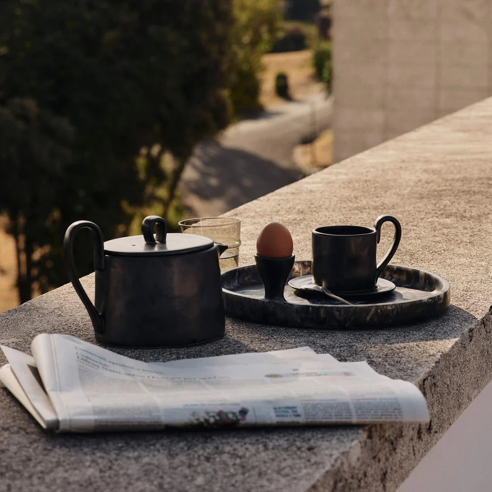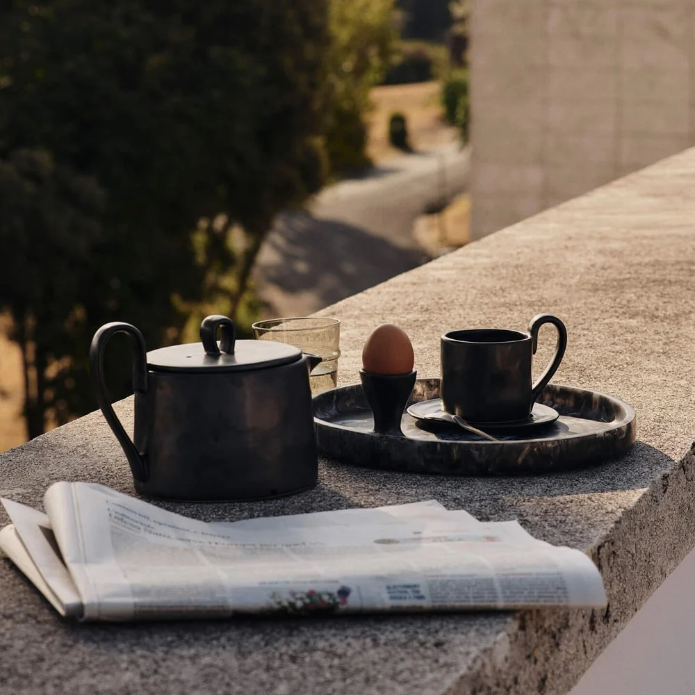 Czajnik z kolekcji Flow duńskiej marki ferm LIVING to eleganckie połączenie współczesnego designu z tradycyjnym rzemiosłem. Wykonany z kamionki pokrytej reaktywną, półmatową glazurą w kolorze czarnym, zachwyca łagodną, zaokrągloną formą i charakterystycznym wygiętym uchwytem, który nadaje mu lekkości i artystycznego charakteru. Każdy egzemplarz jest unikatowy, dzięki czemu codzienny rytuał parzenia herbaty nabiera wyjątkowego, naturalnego uroku.