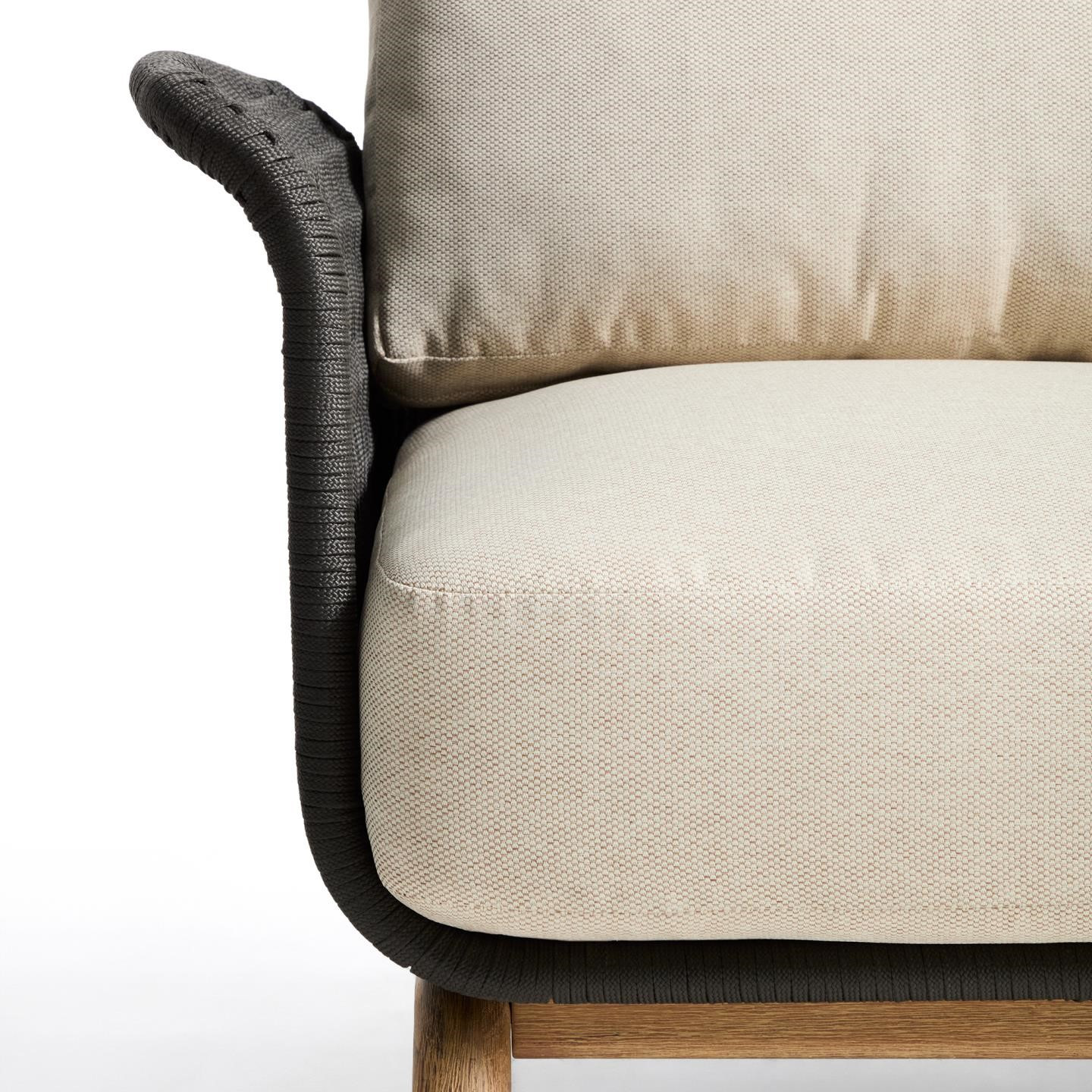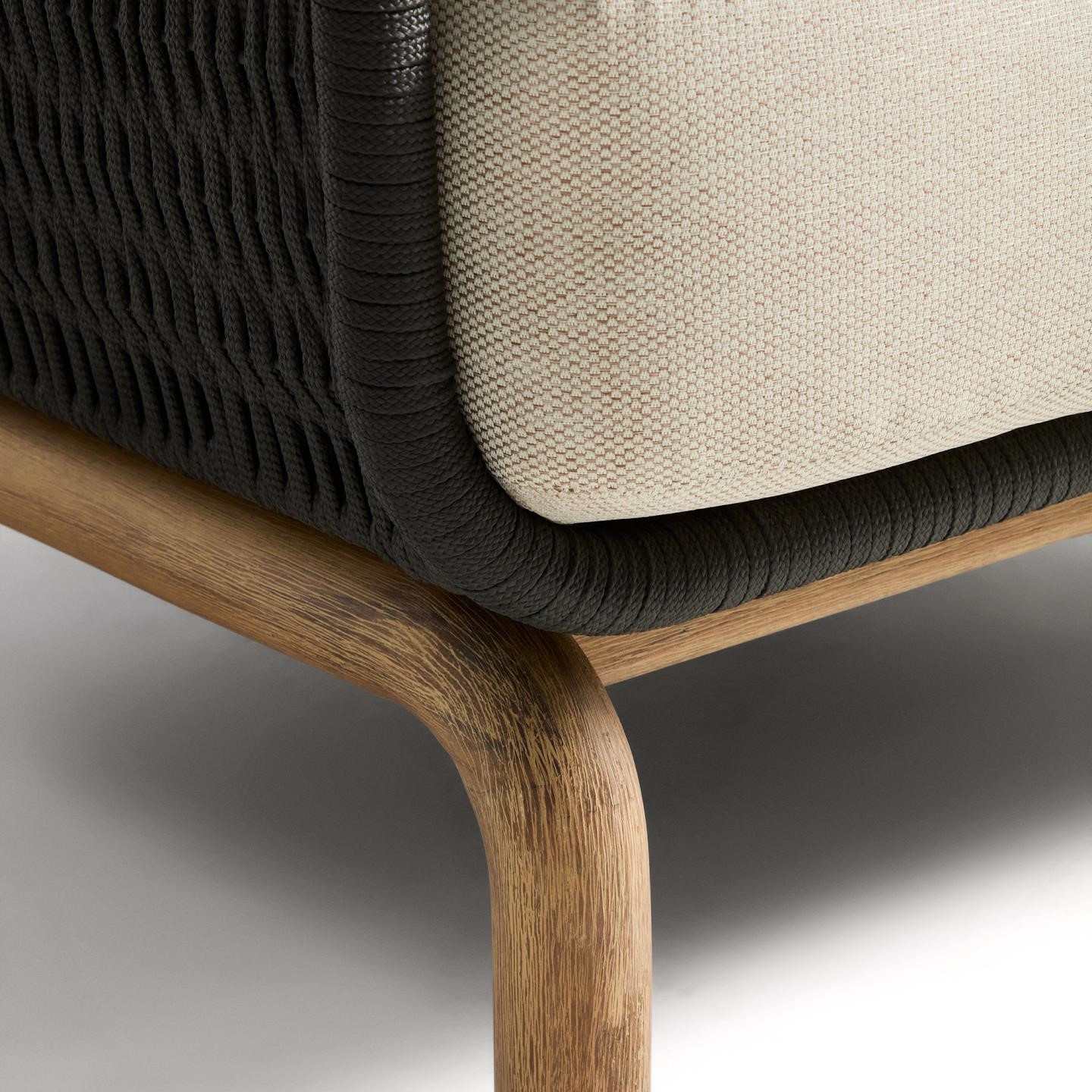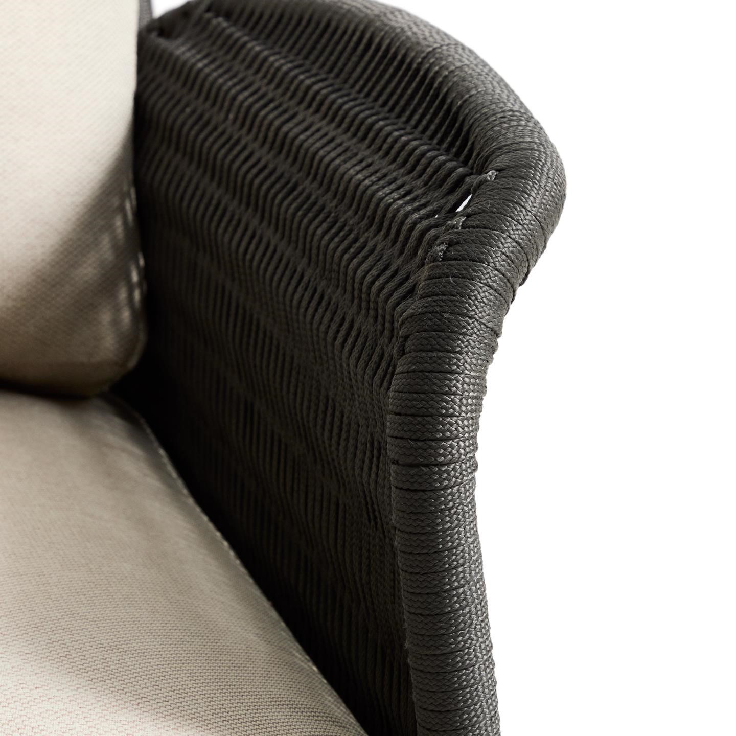 Siedzisko i oparcie zostały wykończone ręcznie plecioną liną w eleganckim kolorze ecru, odporną na promieniowanie UV. Takie rozwiązanie nie tylko podkreśla rustykalny styl fotela, ale także gwarantuje odpowiednią sprężystość i komfort siedzenia. W zestawie znajdują się grube poduszki z wypełnieniem z pianki i włókien poliestrowych, które zapewniają wygodę podczas długiego relaksu. Pokrowce można łatwo zdjąć, co ułatwia utrzymanie fotela w czystości.