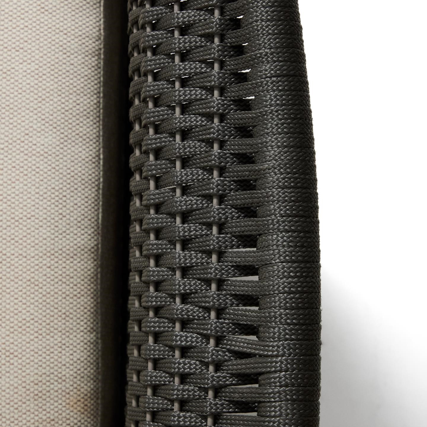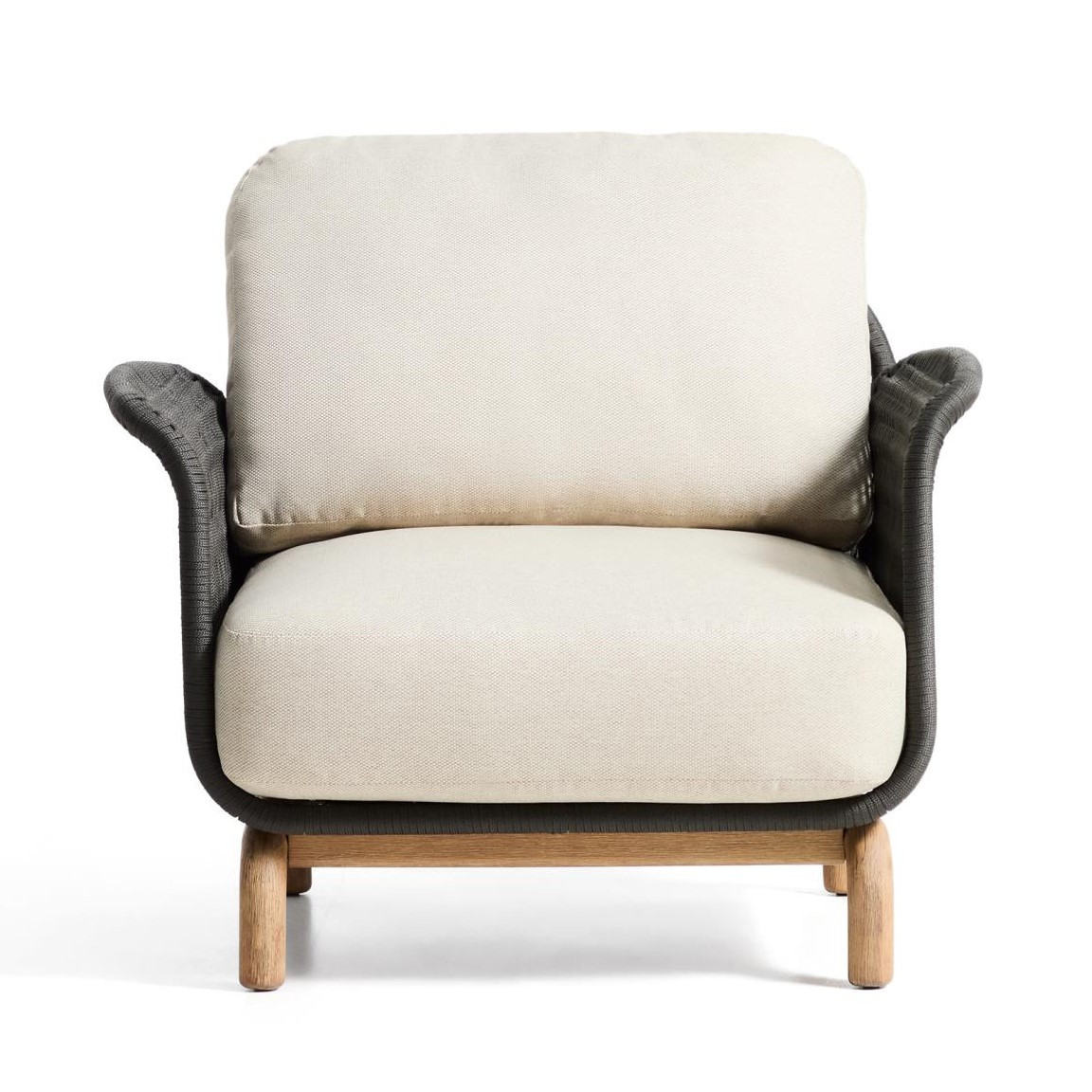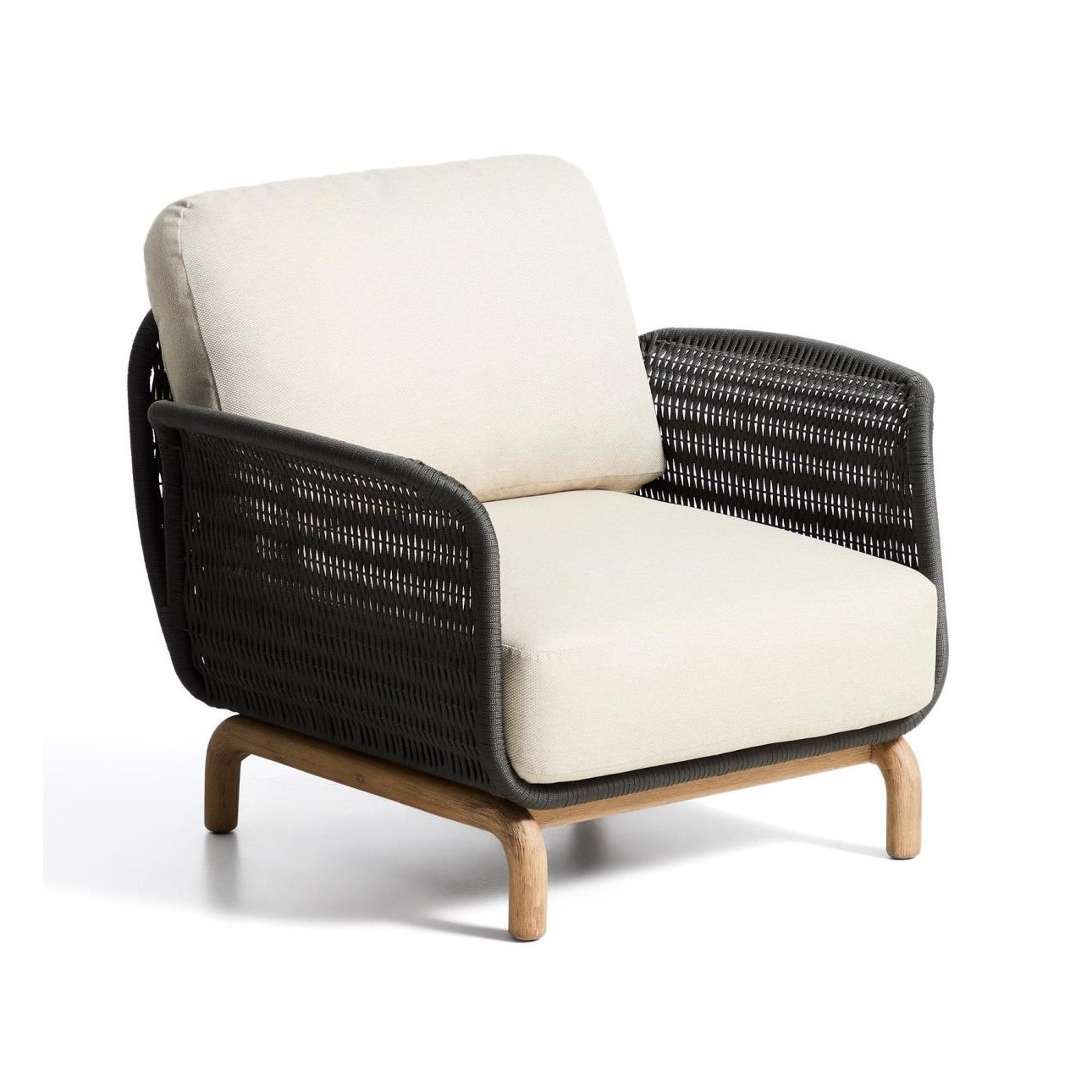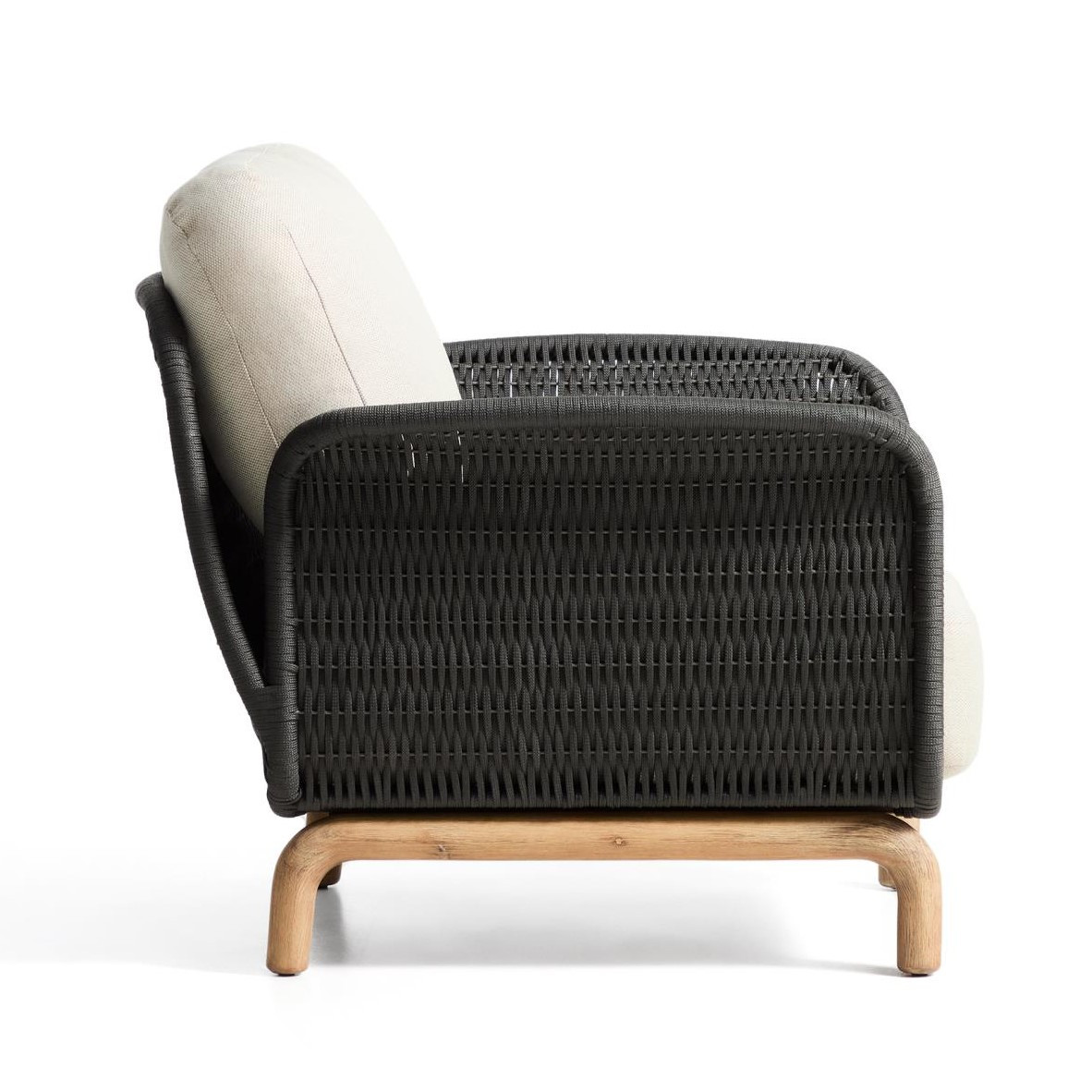 Siedzisko i oparcie zostały wykończone ręcznie plecioną liną w eleganckim kolorze ecru, odporną na promieniowanie UV. Takie rozwiązanie nie tylko podkreśla rustykalny styl fotela, ale także gwarantuje odpowiednią sprężystość i komfort siedzenia. W zestawie znajdują się grube poduszki z wypełnieniem z pianki i włókien poliestrowych, które zapewniają wygodę podczas długiego relaksu. Pokrowce można łatwo zdjąć, co ułatwia utrzymanie fotela w czystości.