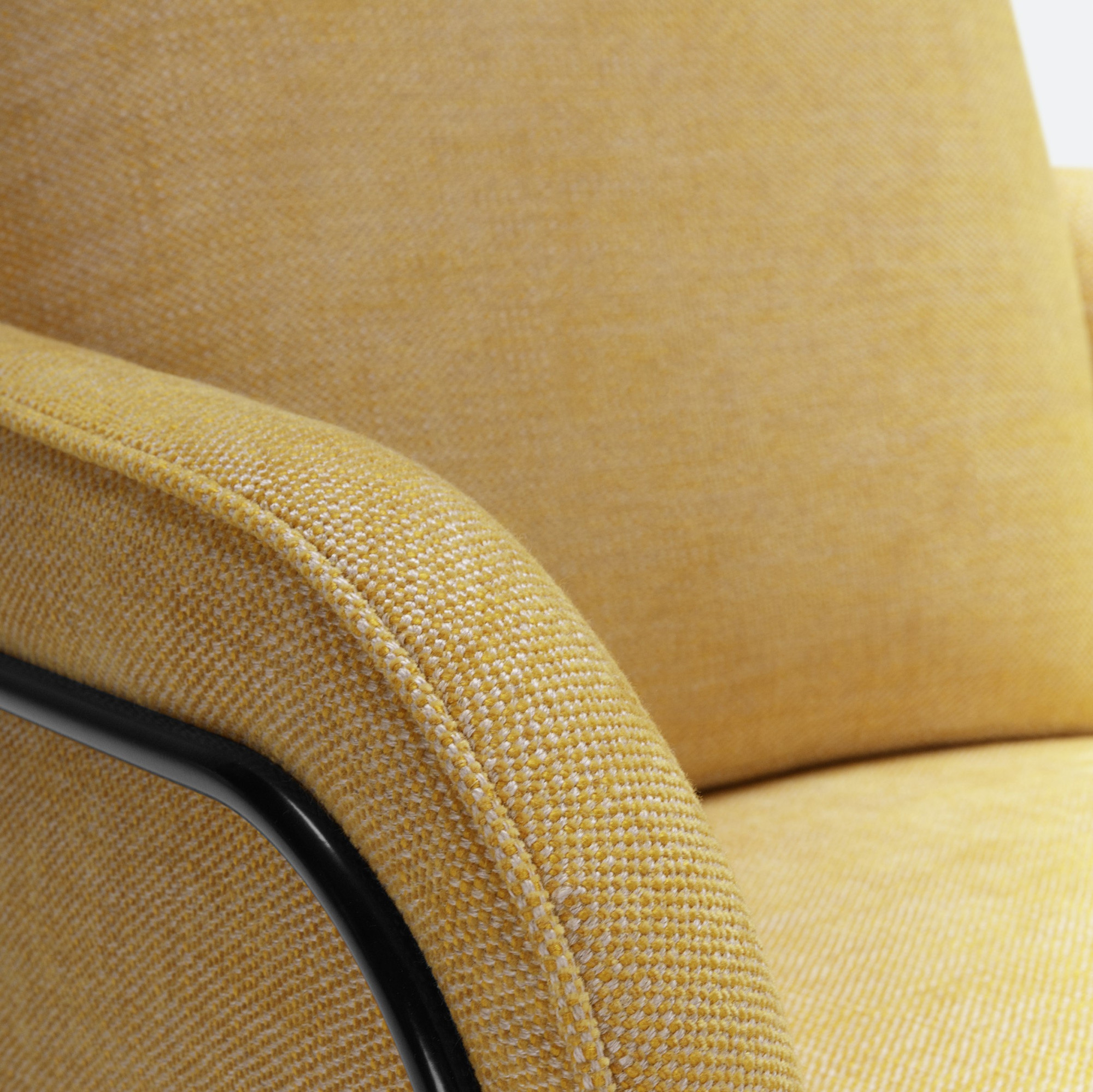 Szenilowa tapicerka w tkaninie Sunny Yellow wnosi do wnętrza energię i świeżość, tworząc mocny, dekoracyjny akcent. Ciepły odcień żółci ożywia przestrzeń i dobrze kontrastuje z chłodną, metalową podstawą, dzięki czemu fotel sprawdza się zarówno w nowoczesnych, jak i eklektycznych aranżacjach.