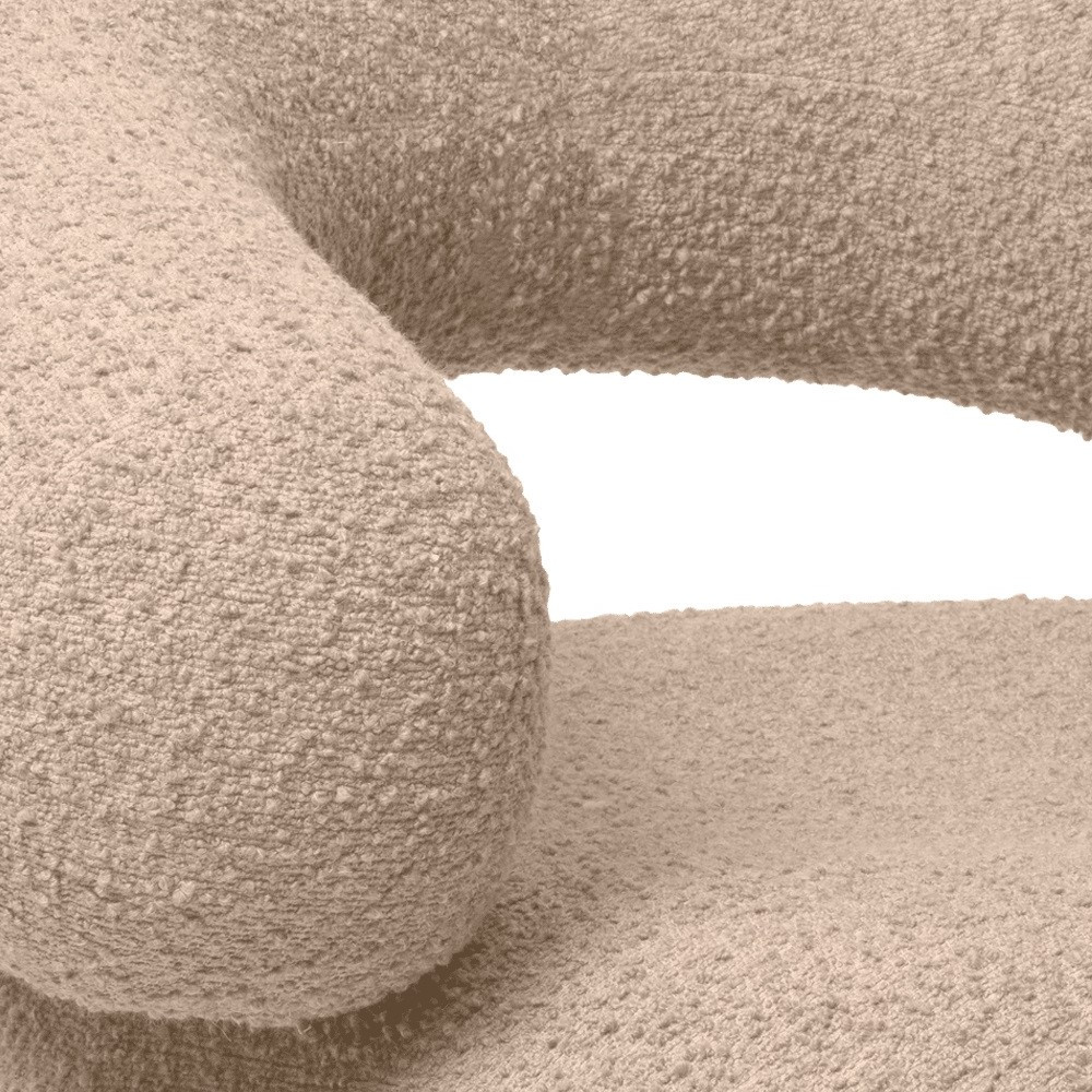 Model wykonany jest ręcznie w Europie i tapicerowany wysokiej jakości tkaniną bouclé w beżowym odcieniu – ciepłym, naturalnym kolorze, który wprowadza do wnętrza przytulność i harmonię. Konstrukcja oparta na drewnie z certyfikatem FSC™ oraz wypełnienie z pianki zapewniają trwałość i wygodę na co dzień.