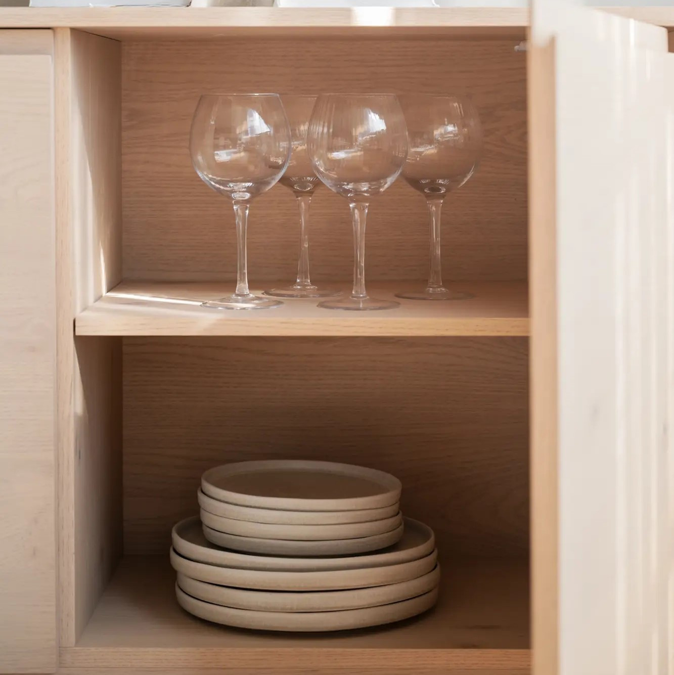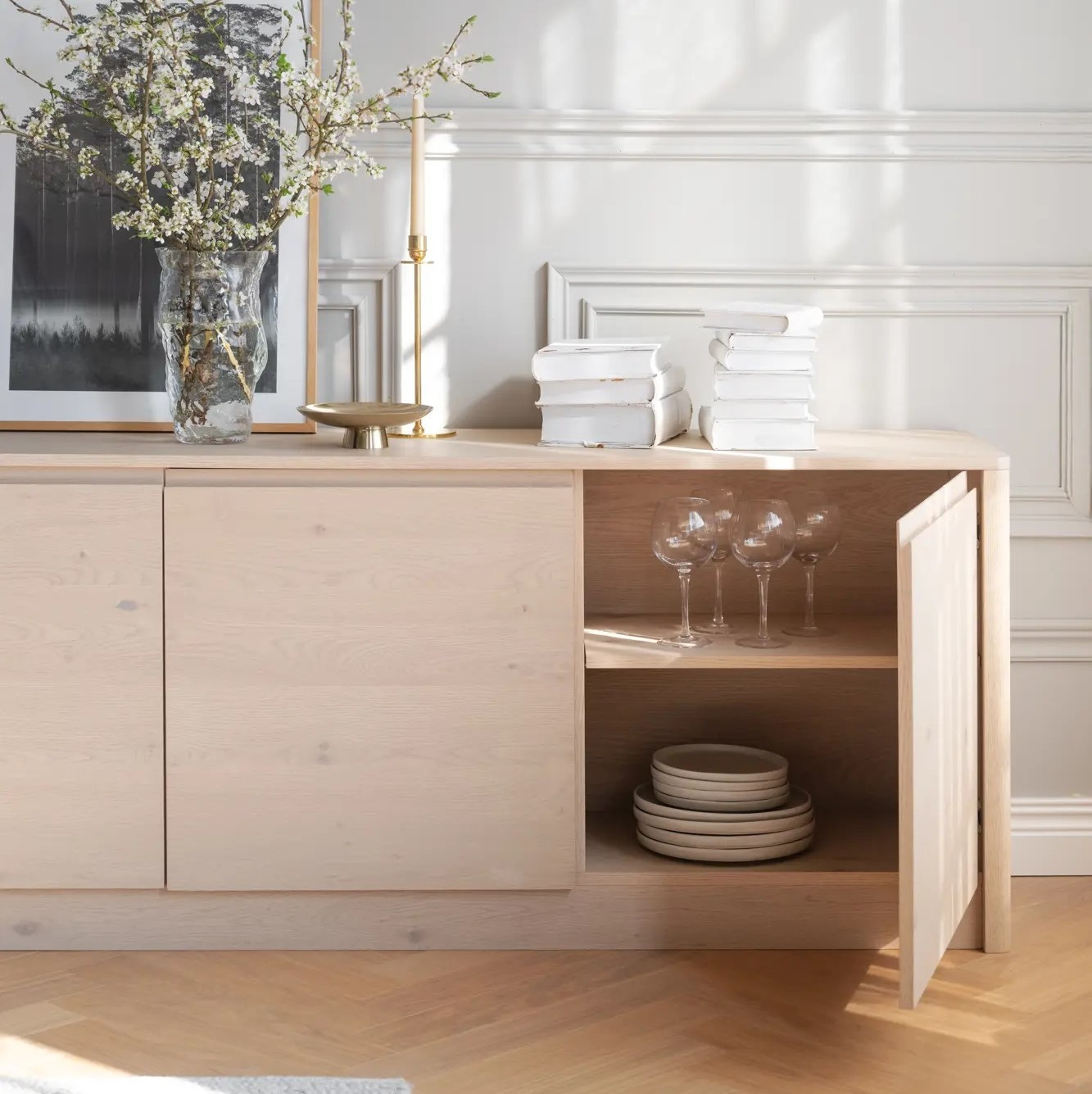 Trzy drzwi z systemem soft close zapewniają ciche domykanie, a regulowane półki oferują praktyczne rozwiązania do przechowywania. Komoda Melstone w odcieniu dębu bielonego wnosi do wnętrza jasność, ciepło i ponadczasowy styl.