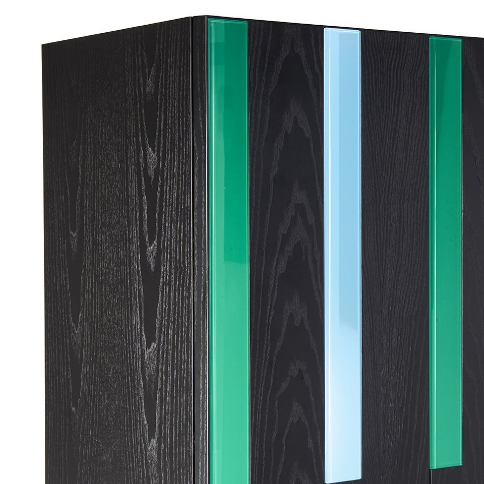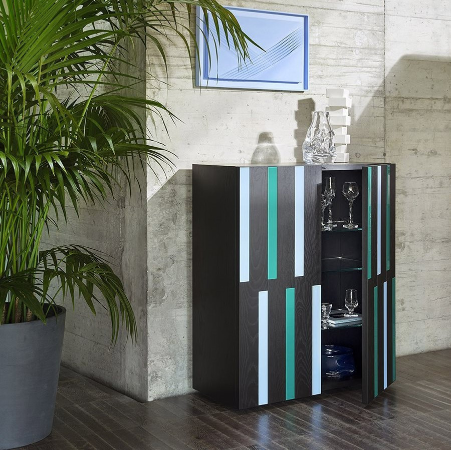Komoda Riga-Riga 788 marki Zanotta, zaprojektowana przez Pierre’a Charpina (2025), to luksusowa interpretacja współczesnego włoskiego designu, w której precyzja rzemiosła łączy się z geometrycznym wzorem inkrustacji. Konstrukcja z MDF fornirowanego jesionem lakierowanym na poro otwarte dostępna jest w kolorze czarnym lub amarantowym. Dekoracyjne wkłady ze szkła malowanego od spodu (back-painted glass) w odcieniach mięty i błękitu dla wersji czarnej oraz kości słoniowej i koralu dla wersji amarantowej nadają bryle trójwymiarowości i rytmu.
