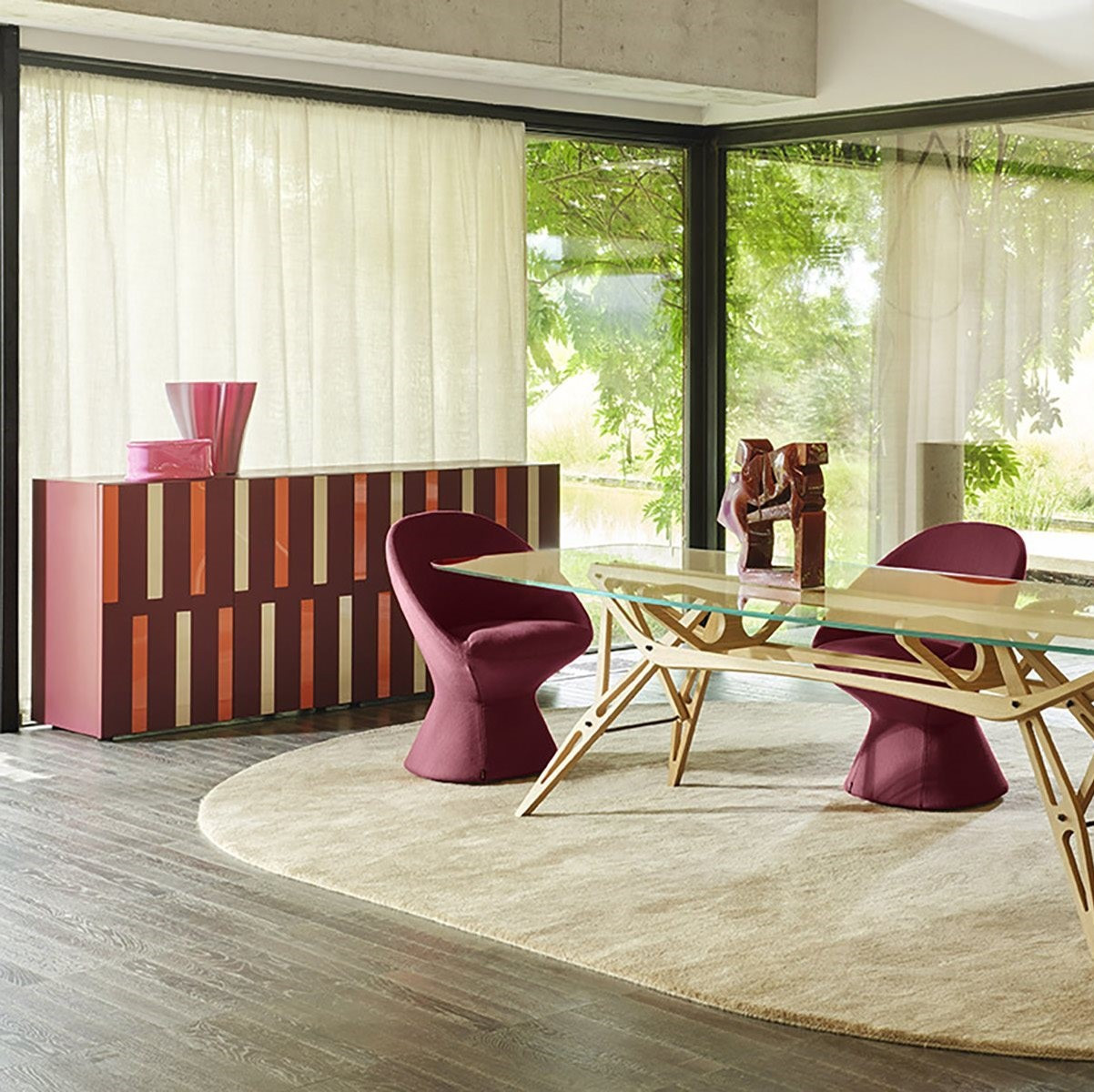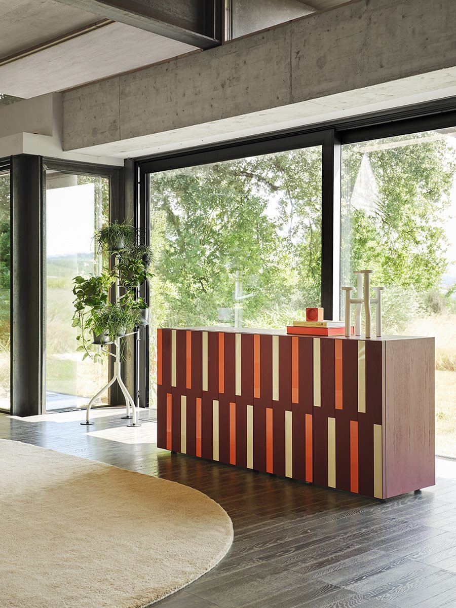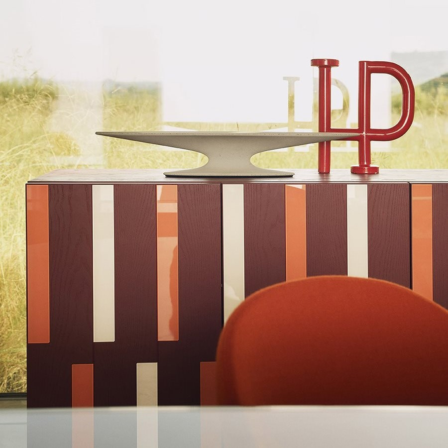 Komoda Riga-Riga 788 marki Zanotta, zaprojektowana przez Pierre’a Charpina (2025), to luksusowa interpretacja współczesnego włoskiego designu, w której precyzja rzemiosła łączy się z geometrycznym wzorem inkrustacji. Konstrukcja z MDF fornirowanego jesionem lakierowanym na poro otwarte dostępna jest w kolorze czarnym lub amarantowym. Dekoracyjne wkłady ze szkła malowanego od spodu (back-painted glass) w odcieniach mięty i błękitu dla wersji czarnej oraz kości słoniowej i koralu dla wersji amarantowej nadają bryle trójwymiarowości i rytmu.