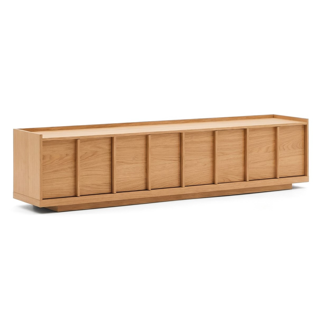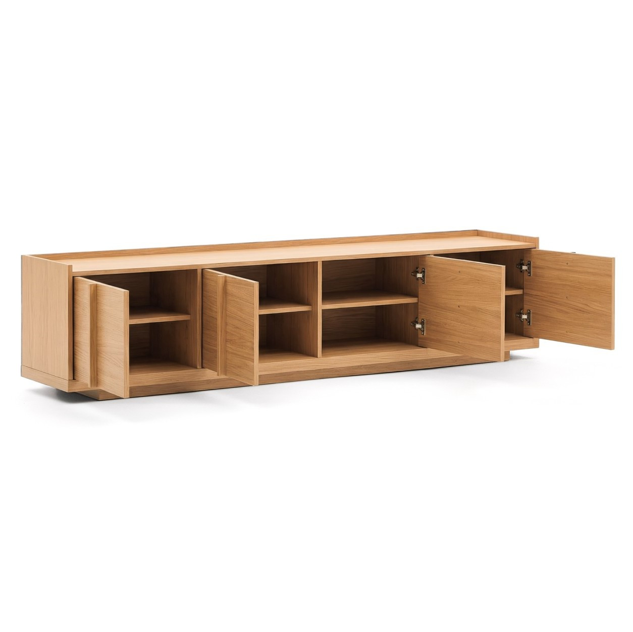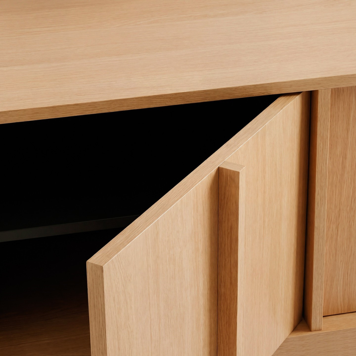 Onix Kave Home TV Stand to nowoczesna szafka RTV inspirowana japońskimi drzwiami Shoji, łącząca minimalizm ze współczesnym designem. Wykonana z MDF i forniru dębowego w naturalnym, ciepłym odcieniu, wprowadza do wnętrza spokój i harmonię. Cztery drzwi z systemem cichego domykania skrywają regulowane półki, idealne do przechowywania sprzętu multimedialnego, akcesoriów i kabli. Regulowane nóżki zapewniają stabilność nawet na nierównym podłożu, a wykończenie z forniru i lakieru poliuretanowego gwarantuje trwałość oraz łatwość pielęgnacji.