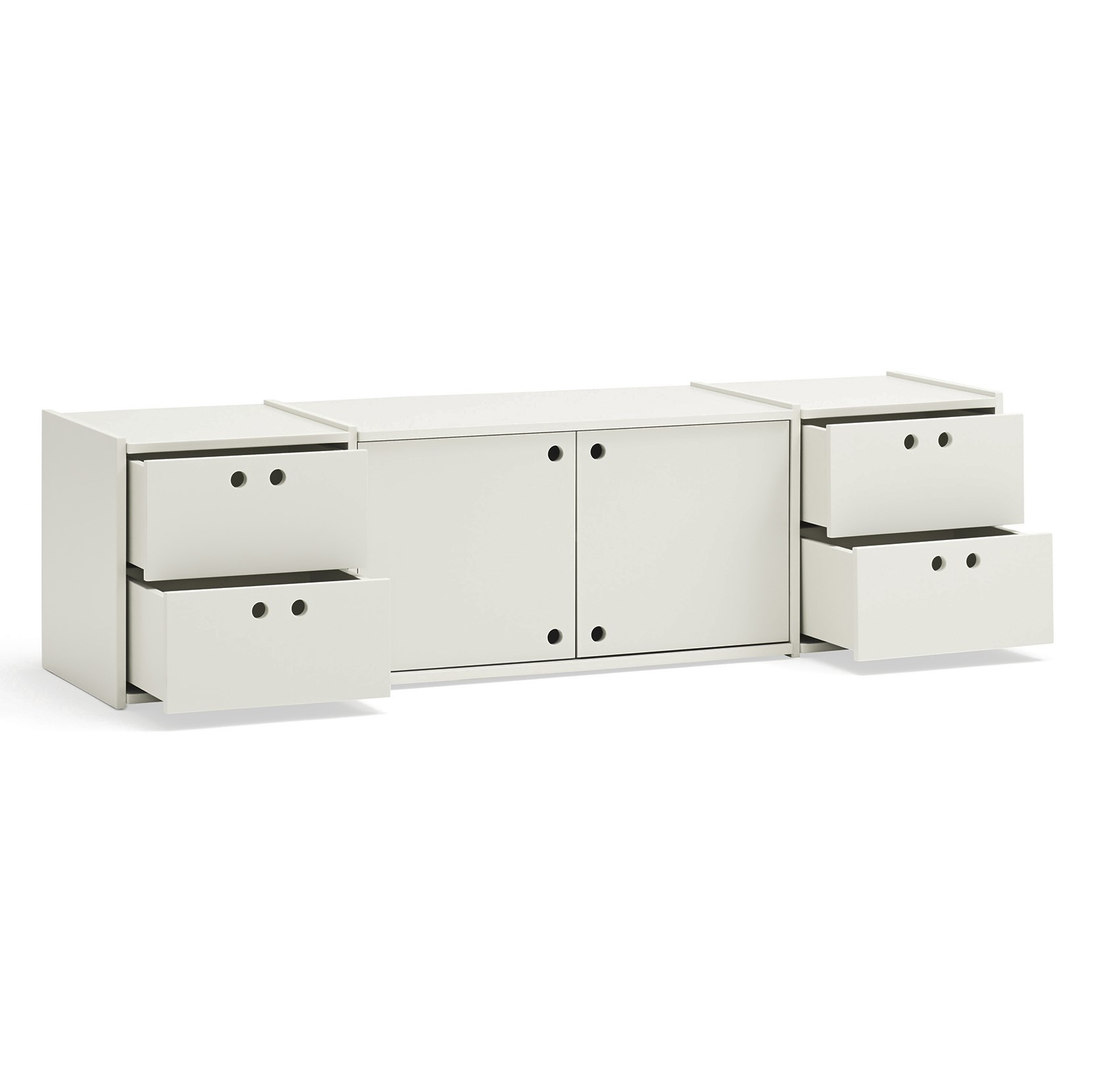 Komoda TV Wally z kolekcji Teulat to nowoczesny mebel do przechowywania zaprojektowany w duchu funkcjonalnego minimalizmu. Korpus wykonano z trwałej płyty MDF, zapewniającej stabilność konstrukcji i precyzyjne wykończenie powierzchni; wersja Natural ma surową, matową estetykę będącą świadomym elementem projektu, natomiast wariant Cream oferuje gładkie, jednolite wykończenie w kremowym kolorze. Komoda posiada zamknięte szafki i półki, które umożliwiają uporządkowane przechowywanie sprzętu RTV, akcesoriów multimedialnych lub dekoracji.