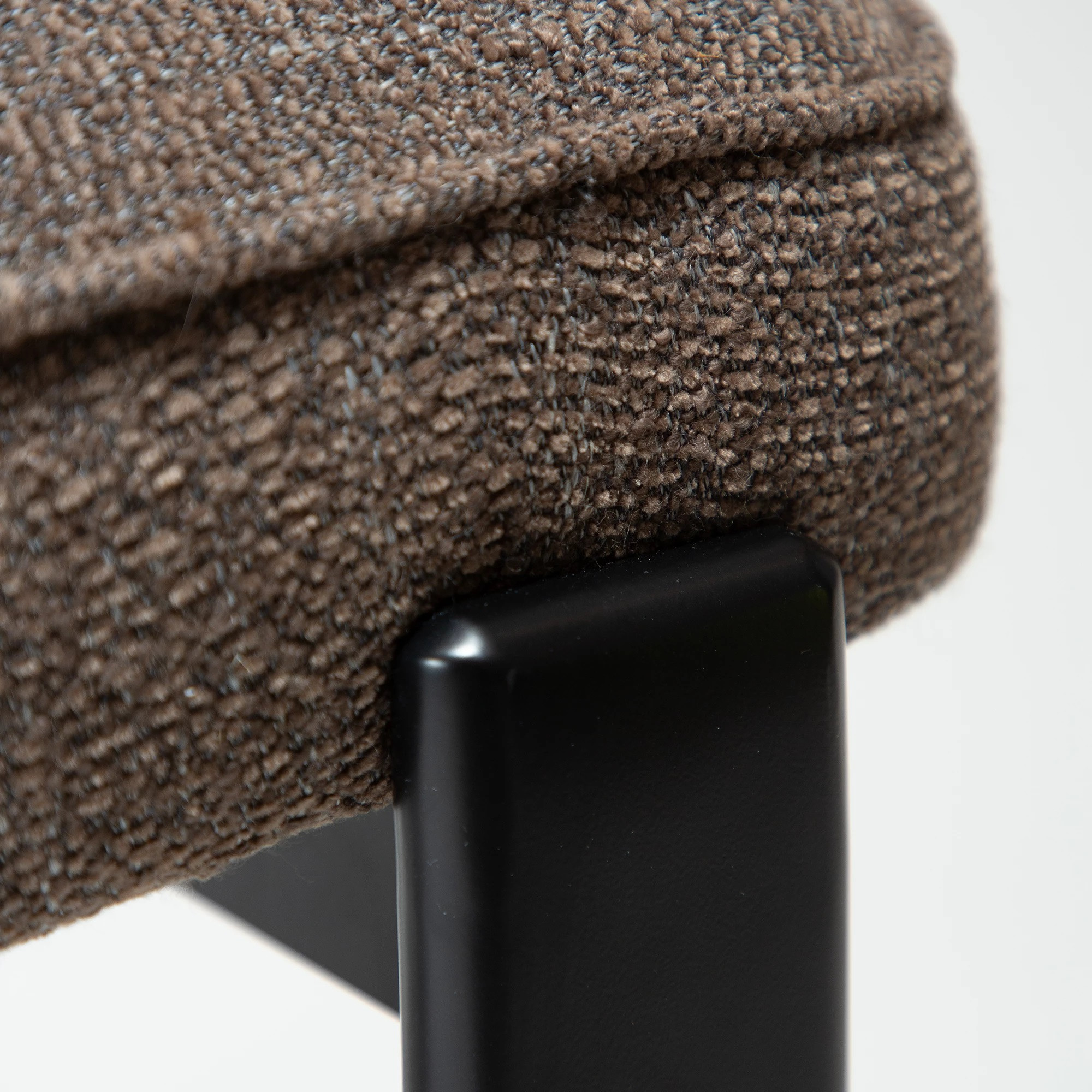 Siedzisko i oparcie wykonano z giętej sklejki, wypełnionej pianką, co zapewnia wygodę i stabilne podparcie. Tapicerka z tkaniny bouclé w kolorze Major Brown to głęboki, ciepły brąz o miękkiej, pętelkowej strukturze, który nadaje meblowi elegancki i przytulny charakter. Całość osadzona jest na czarnych, metalowych nogach malowanych proszkowo, które wprowadzają nowoczesny kontrast i podkreślają lekkość konstrukcji.