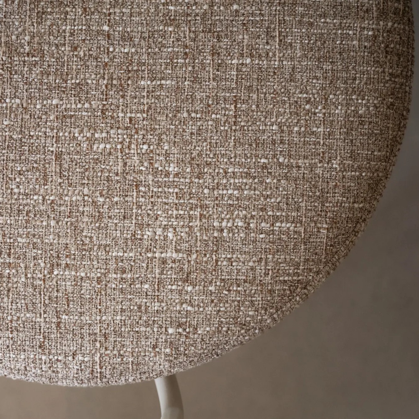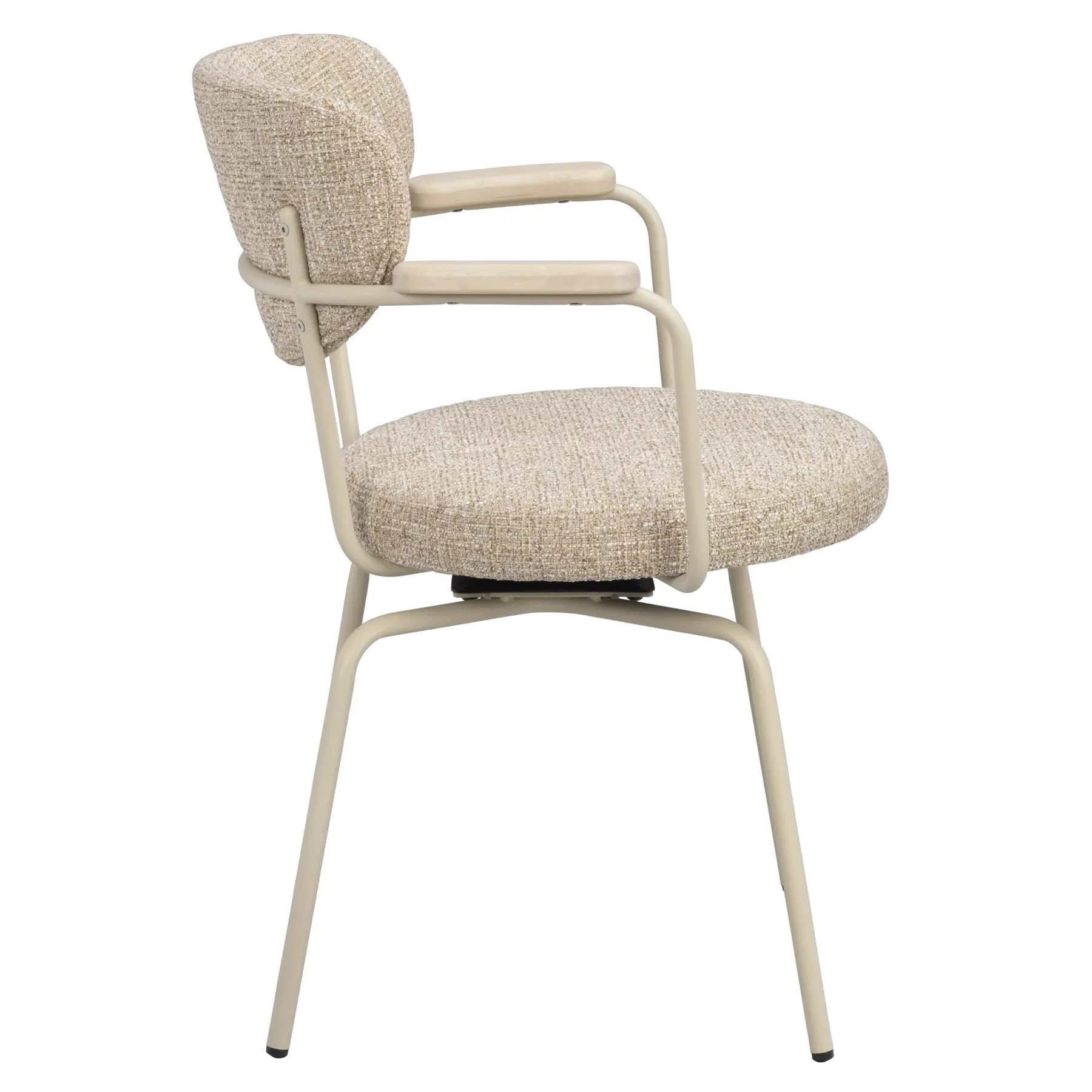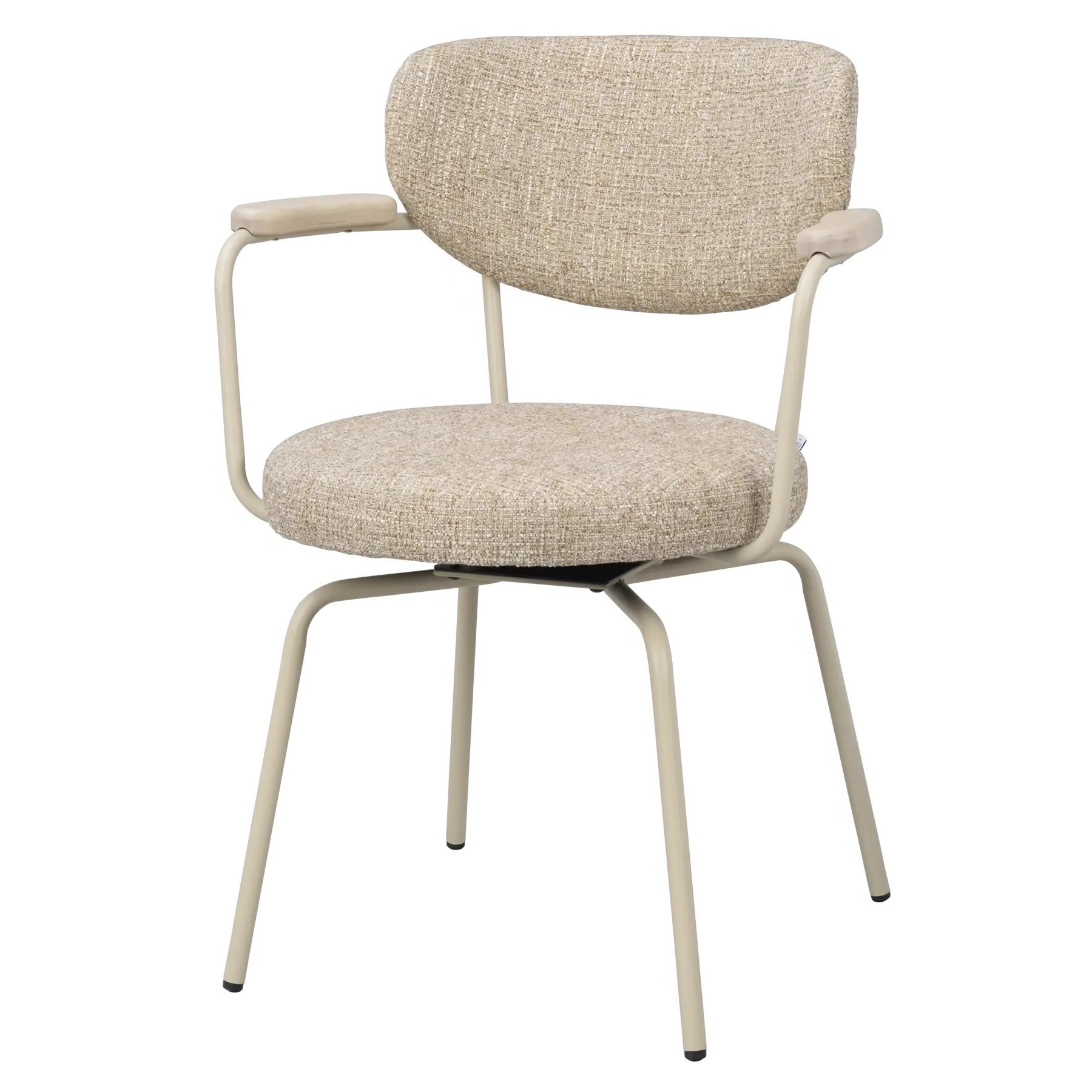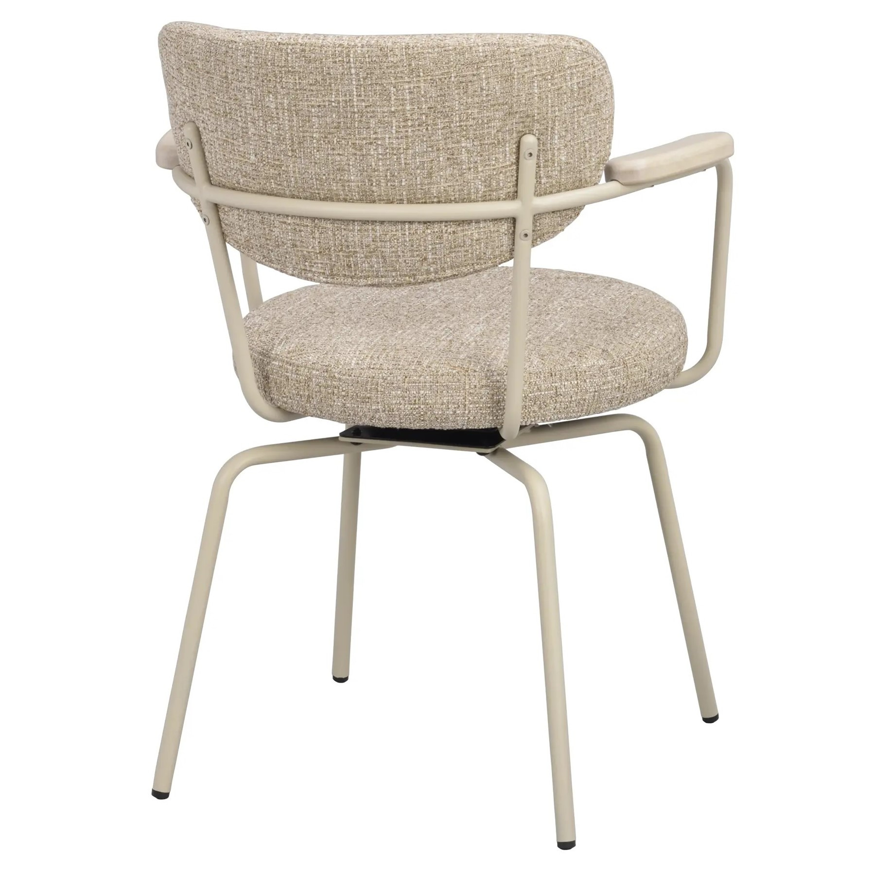 Krzesło Merrick szwedzkiej marki Rowico to nowoczesny fotel obrotowy łączący elegancką, smukłą konstrukcję z przytulnym komfortem. Ciemnobeżowa tkanina z 100% poliestru pokrywa siedzisko i oparcie z giętej sklejki, a solidne metalowe nogi w beżowej, proszkowanej powłoce z delikatną strukturą piaskową nadają meblowi lekko industrialny charakter. Drewniane podłokietniki z litego dębu dodają całości ciepła i naturalnego uroku.