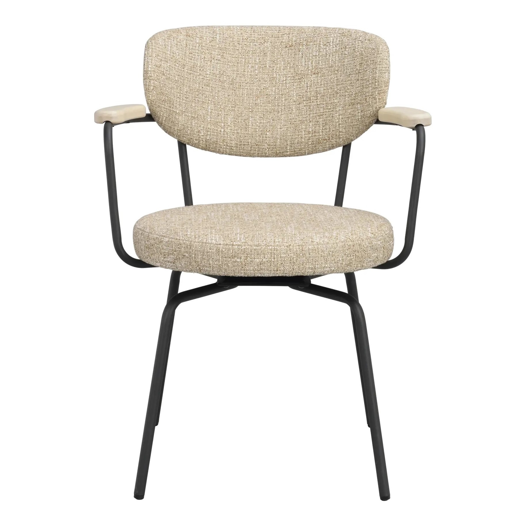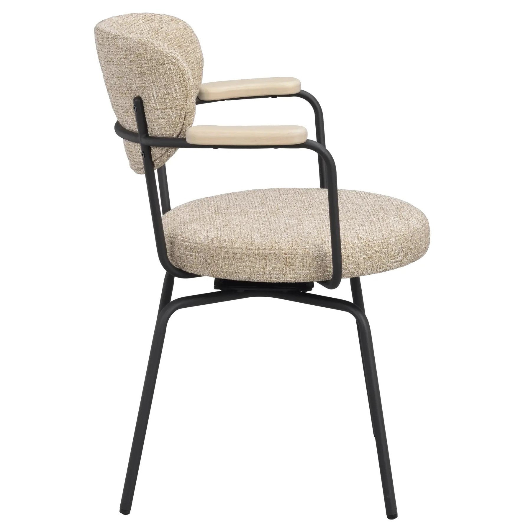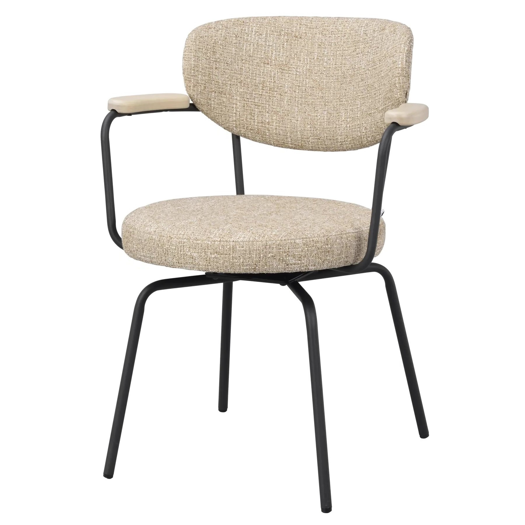 Krzesło Merrick szwedzkiej marki Rowico to nowoczesny fotel obrotowy łączący elegancką, smukłą konstrukcję z przytulnym komfortem. Ciemnobeżowa tkanina z 100% poliestru pokrywa siedzisko i oparcie z giętej sklejki, a solidne metalowe nogi w czarnej, proszkowanej powłoce z delikatną strukturą piaskową nadają meblowi lekko industrialny charakter. Drewniane podłokietniki z litego dębu dodają całości ciepła i naturalnego uroku.