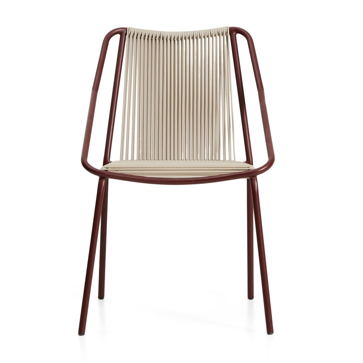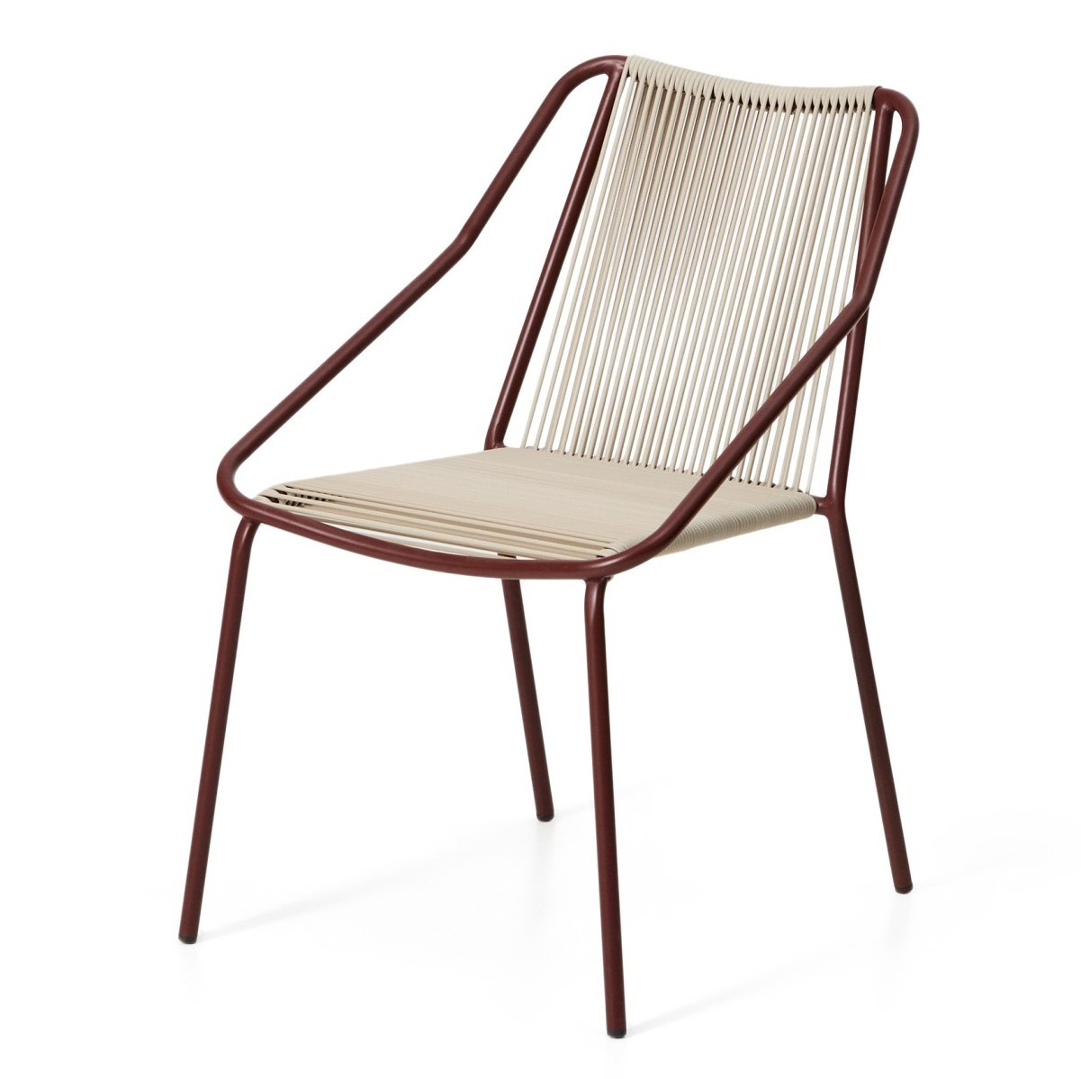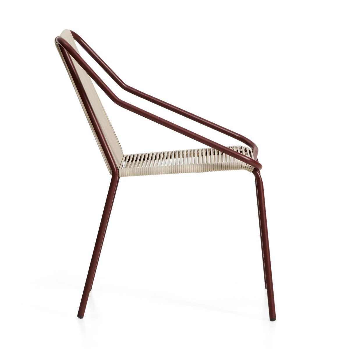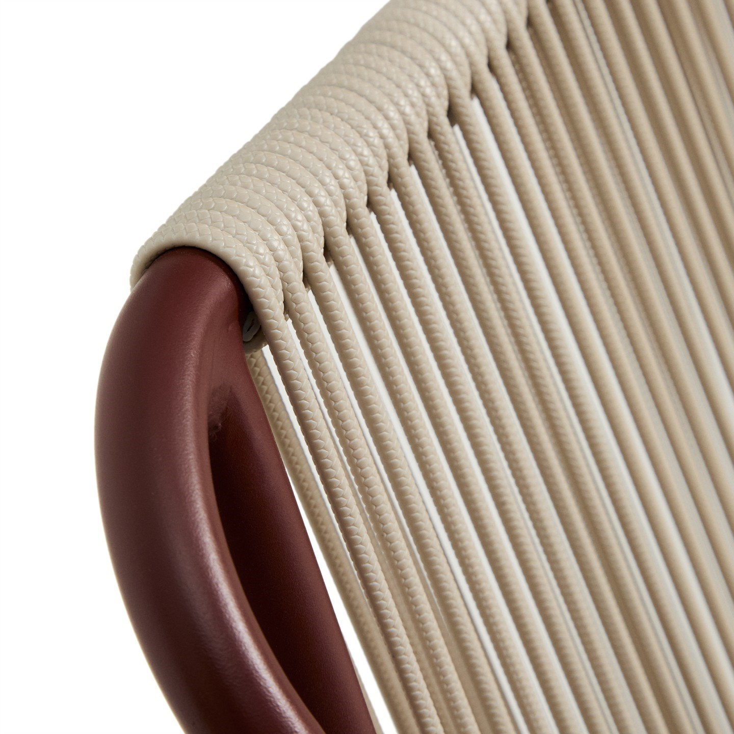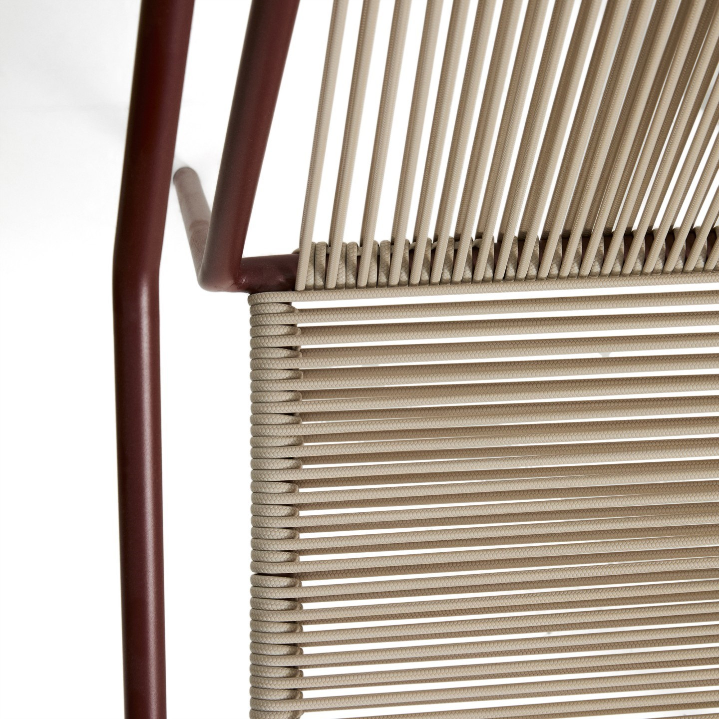 Siedzisko oraz oparcie zostały ręcznie plecione z liny w eleganckim odcieniu ecru. Ten detal nadaje całości subtelności i naturalnego charakteru, który świetnie komponuje się zarówno ze stylem skandynawskim, jak i industrialnym. Proste, czyste linie konstrukcji w kolorze bordowym wprowadzają wizualny spokój i harmonię do każdej aranżacji.
