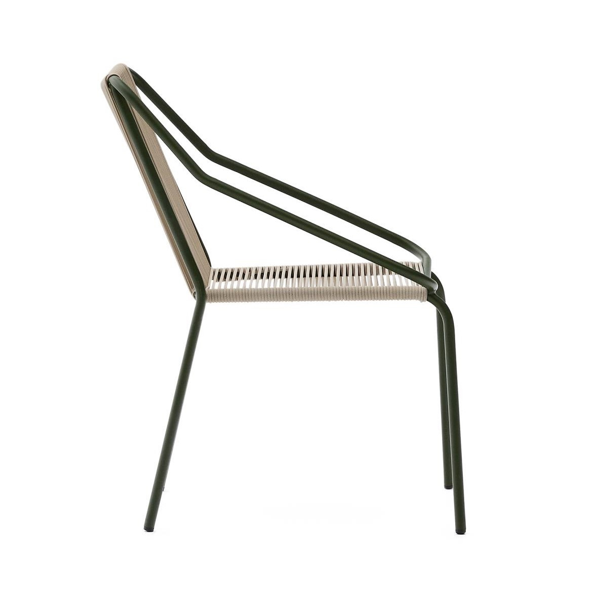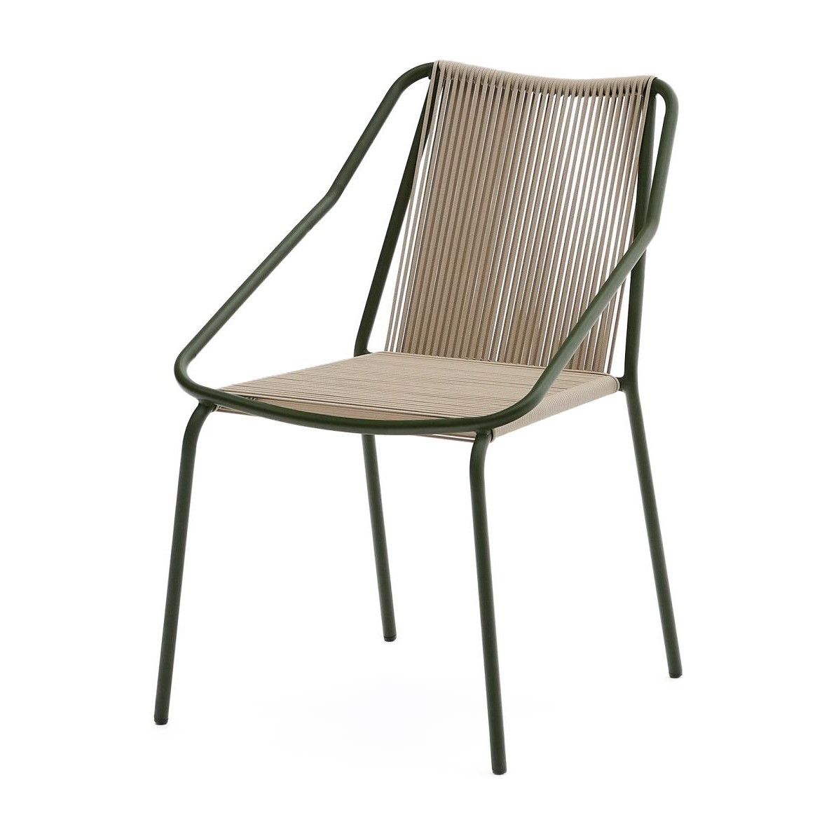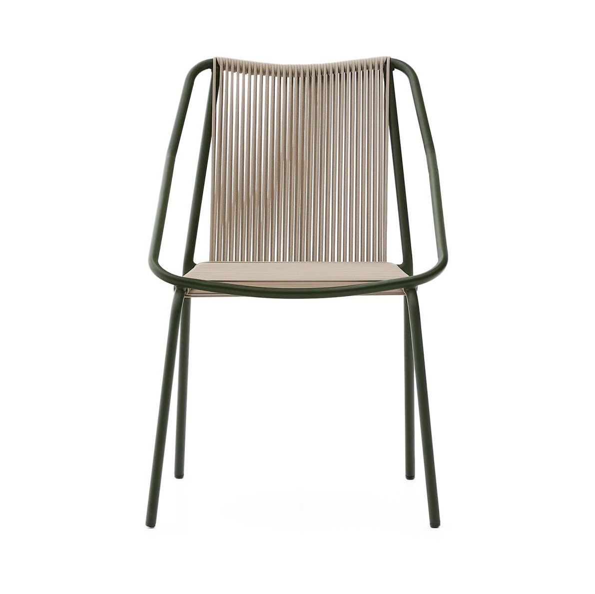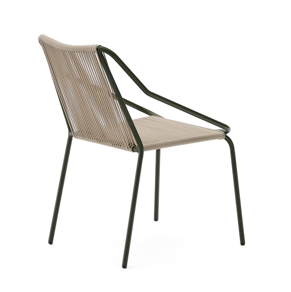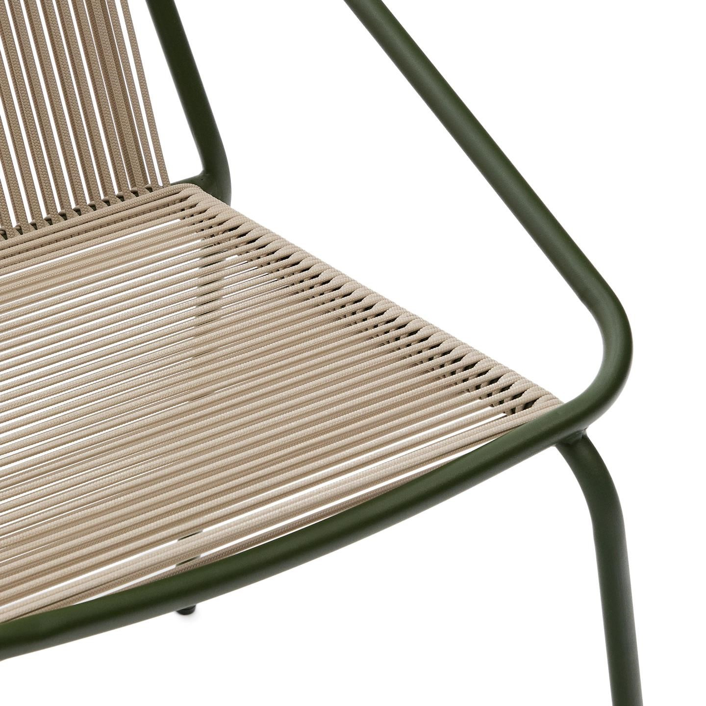 Krzesło ogrodowe z kolekcji Zivia hiszpańskiej marki Kave Home. Nowoczesne krzesło outdoor, które wyróżnia się lekką, a jednocześnie solidną konstrukcją wykonaną z galwanizowanej stali malowanej proszkowo. Dzięki temu krzesło jest odporne na korozję, ścieranie oraz zmienne warunki atmosferyczne, co czyni je doskonałym wyborem zarówno do ogrodu, na taras czy balkon, jak i do wnętrz.