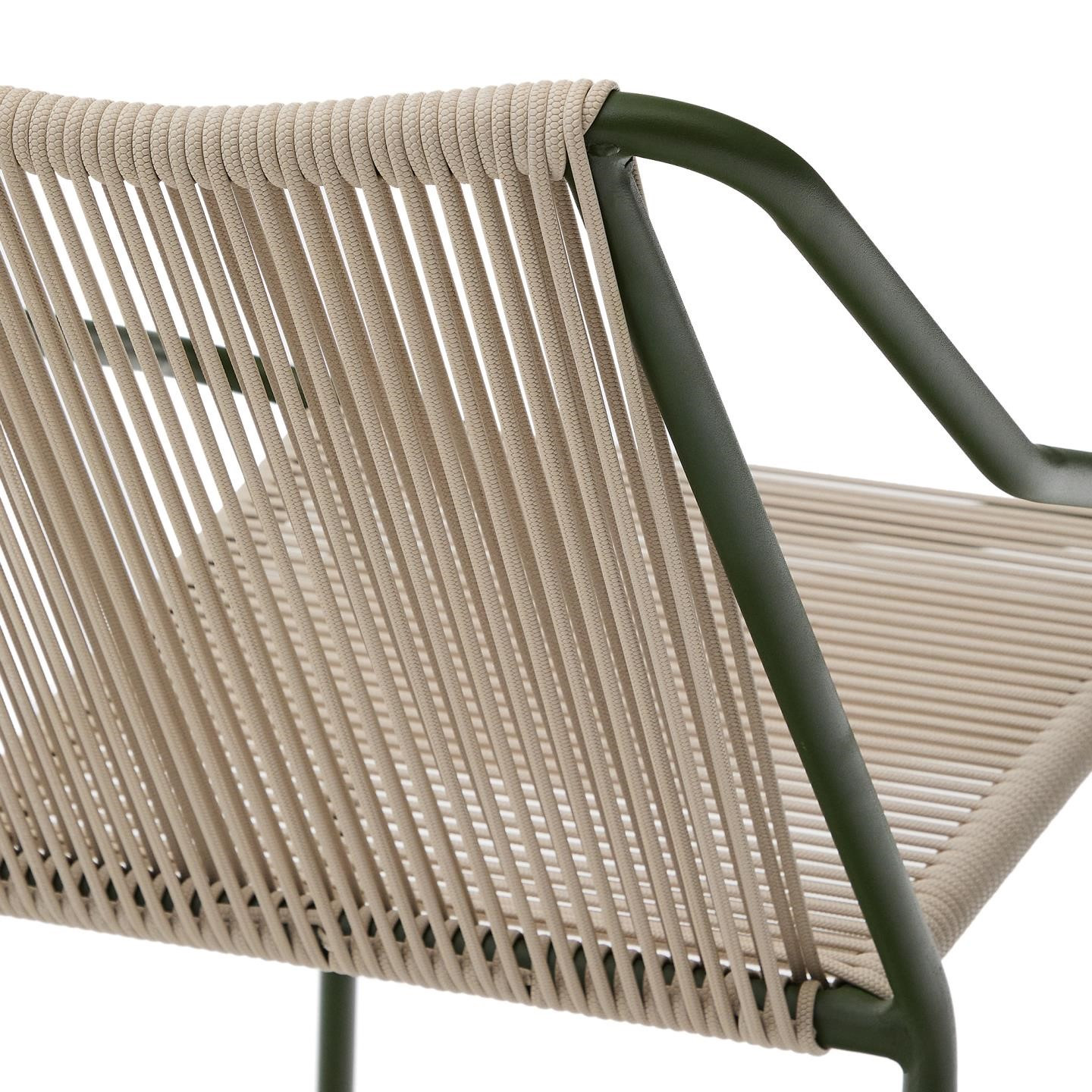 Siedzisko oraz oparcie zostały ręcznie plecione z liny w eleganckim odcieniu ecru. Ten detal nadaje całości subtelności i naturalnego charakteru, który świetnie komponuje się zarówno ze stylem skandynawskim, jak i industrialnym. Proste, czyste linie konstrukcji w kolorze ciemnej zieleni wprowadzają wizualny spokój i harmonię do każdej aranżacji.