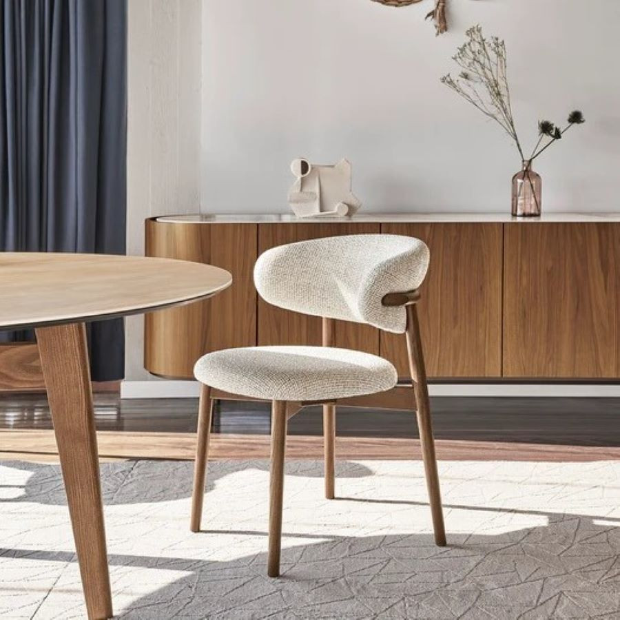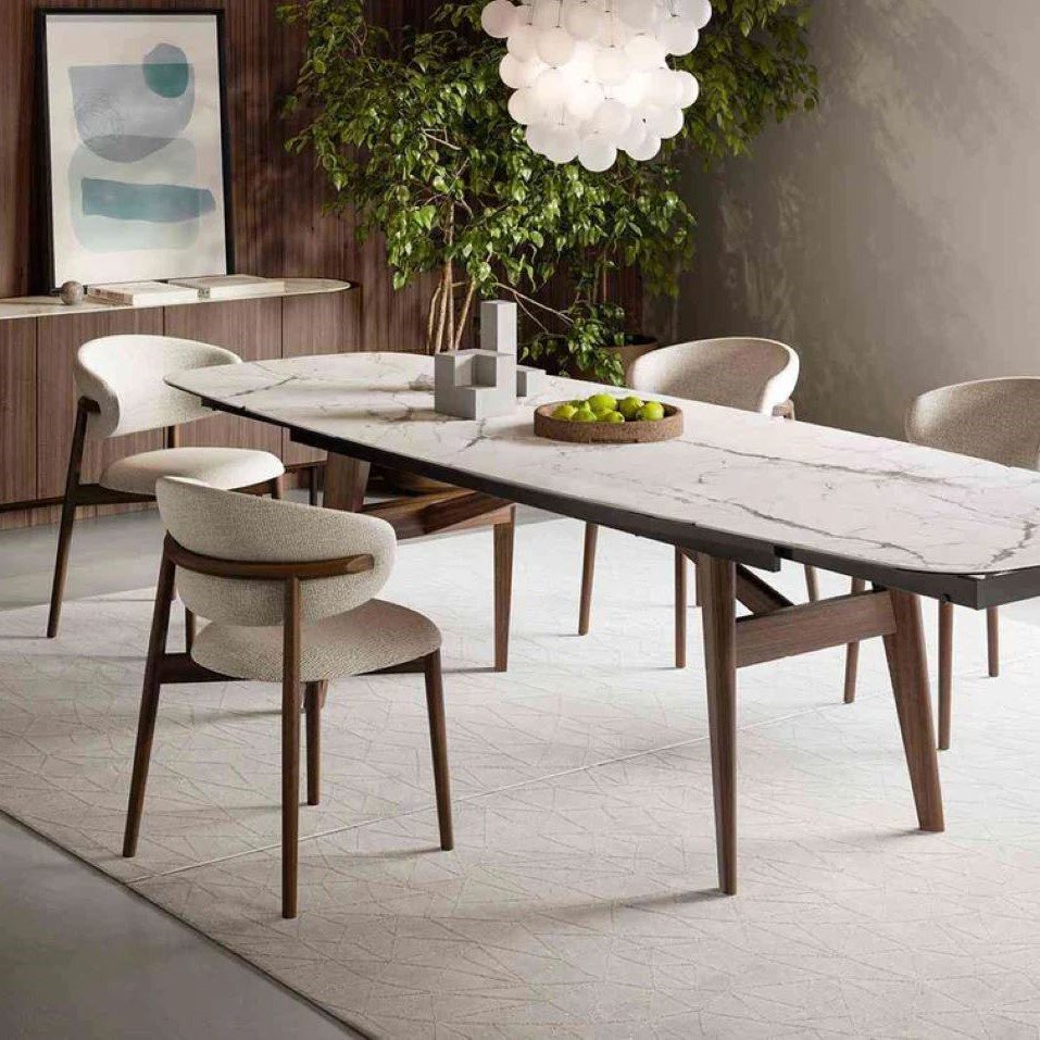 Stabilna konstrukcja oparta została na drewnianych nogach w wykończeniu Noce Canaletto, nadających całości elegancki i ponadczasowy charakter. Charakterystycznym detalem modelu Oleandro jest subtelnie wykończona rama oparcia z dekoracyjnym ścięciem drewna, podkreślającym rzemieślniczą precyzję i włoskie wzornictwo. Krzesło Oleandro doskonale sprawdzi się w nowoczesnej jadalni, salonie oraz we wnętrzach klasy premium, gdzie liczy się estetyka, trwałość i komfort.