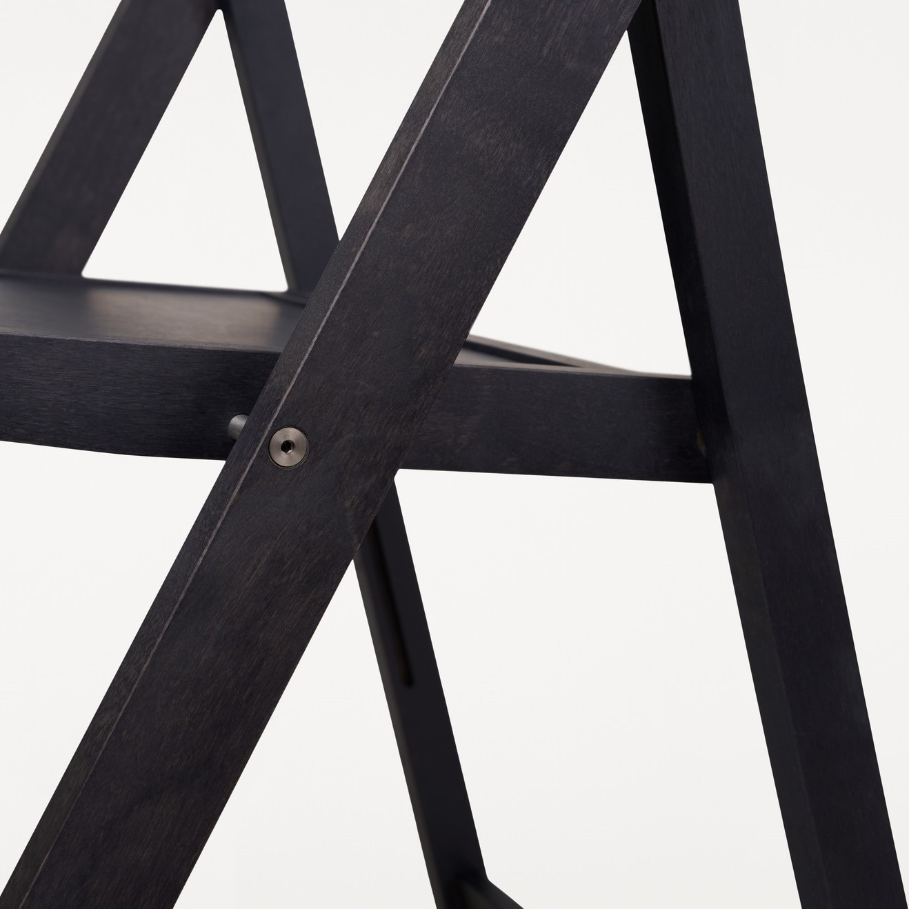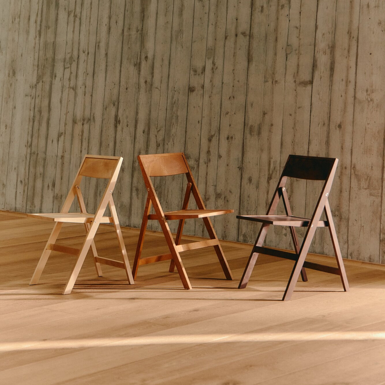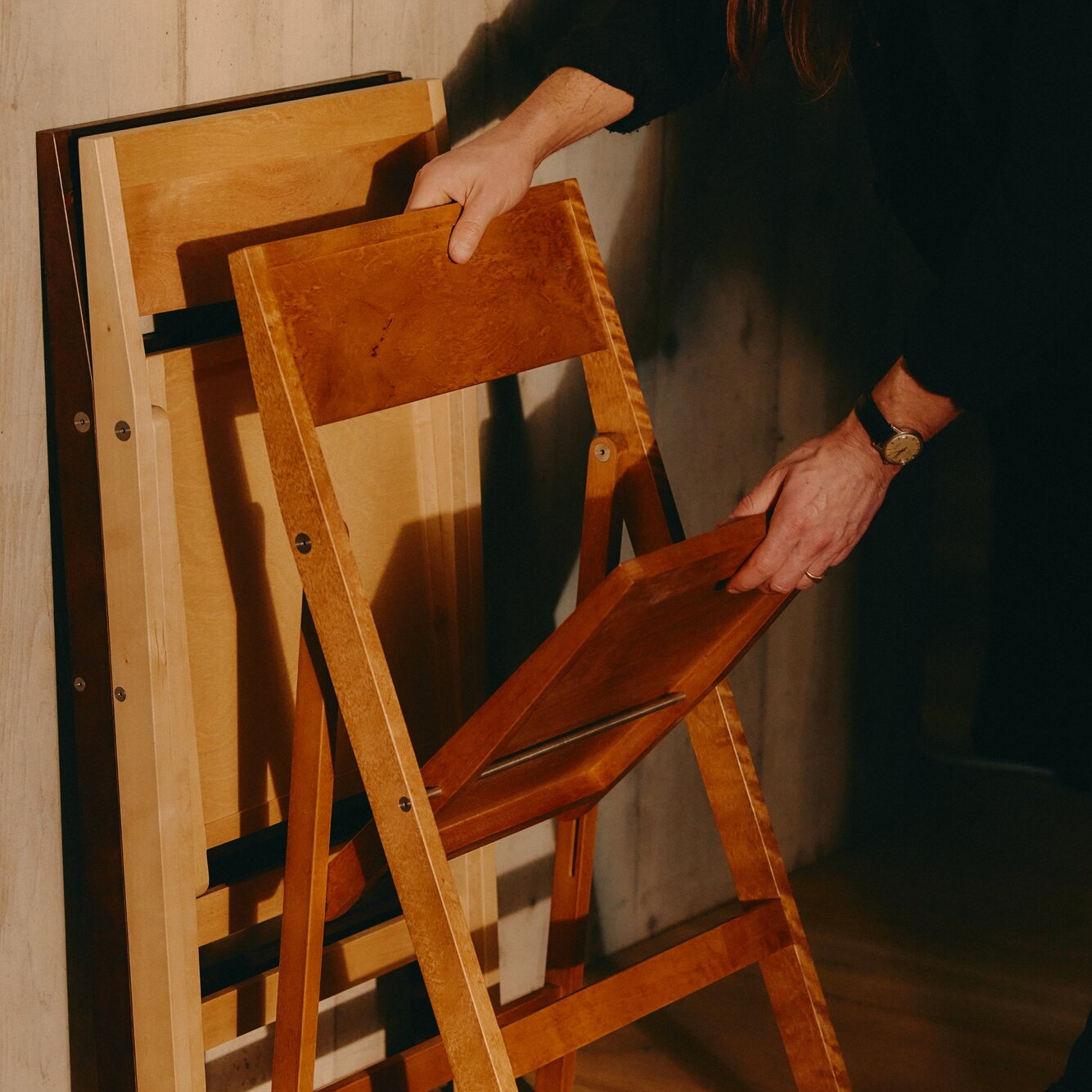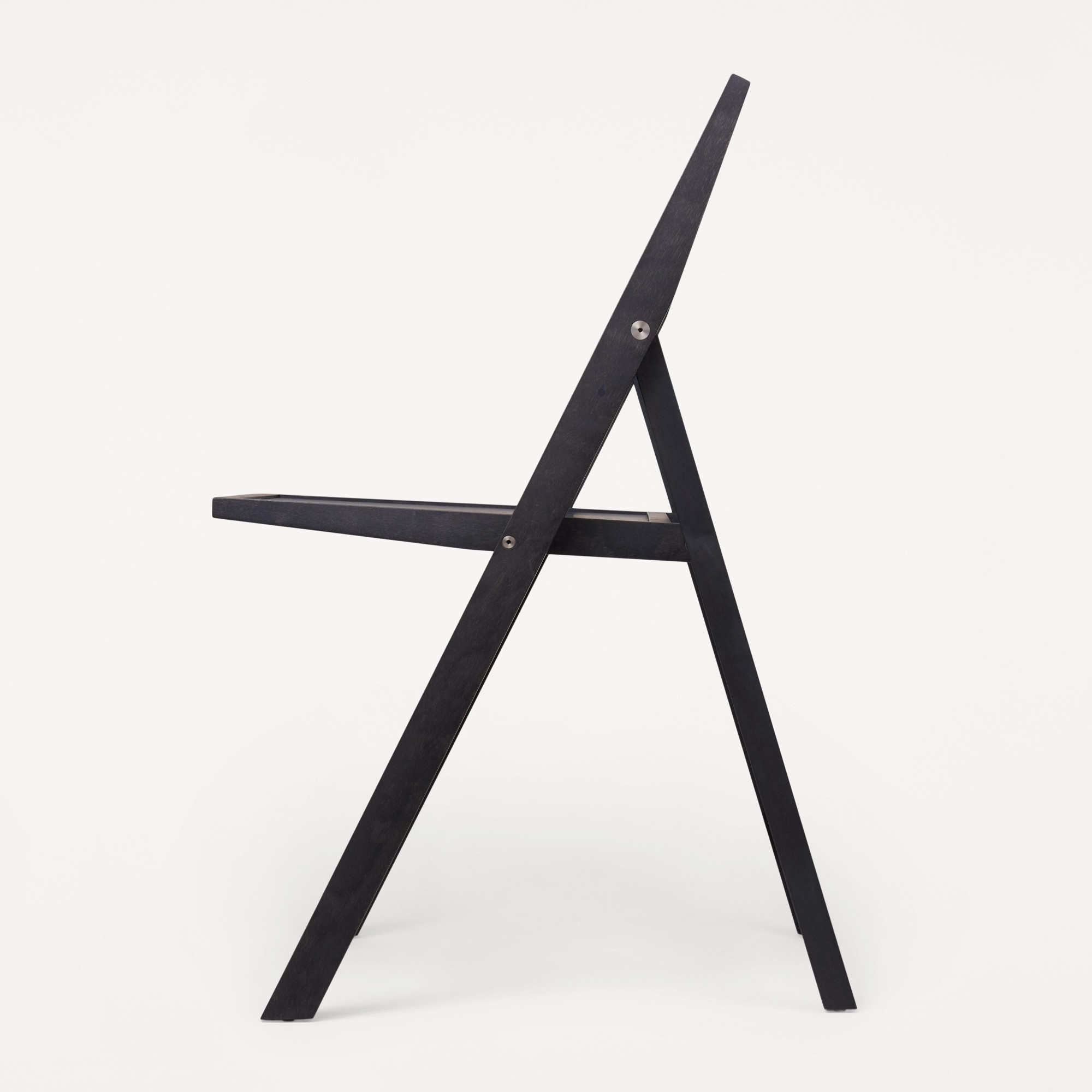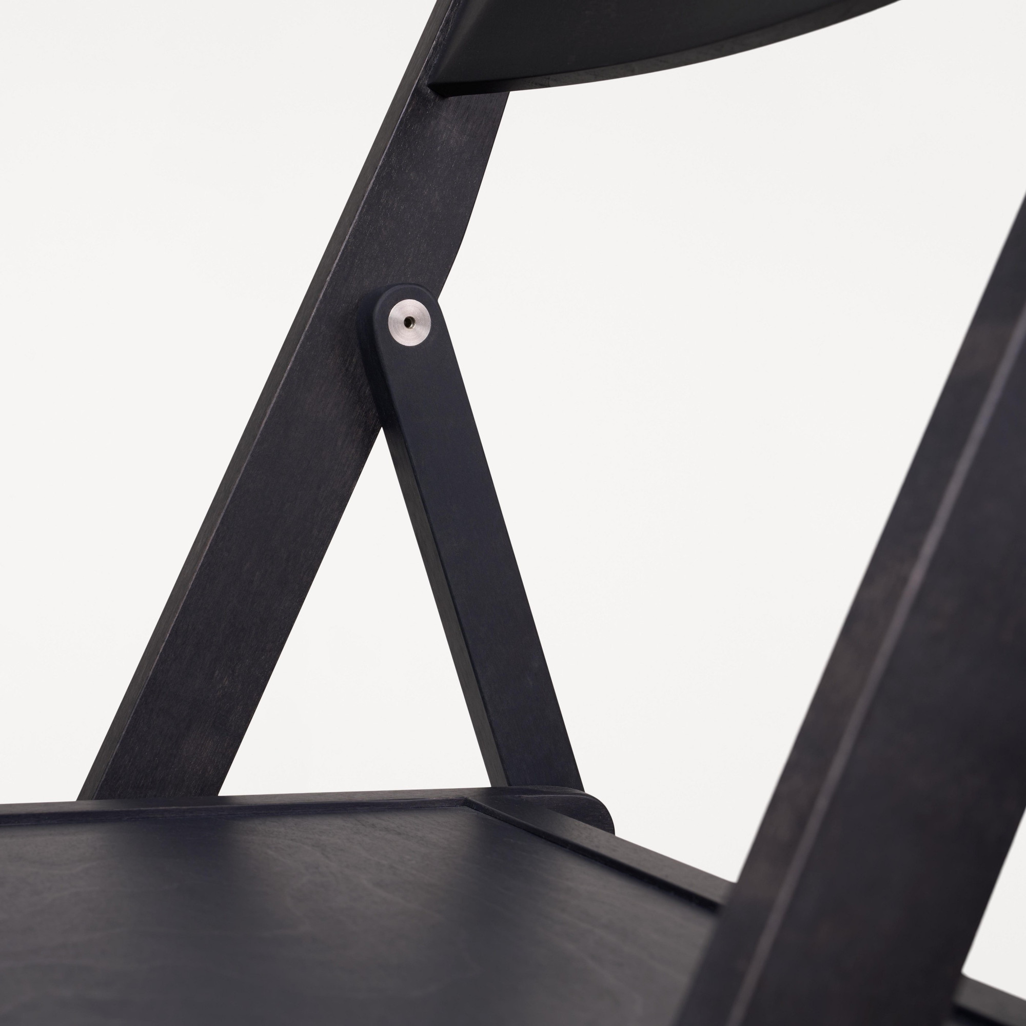 Krzesło składane, które redefiniuje funkcjonalność w nowoczesnych wnętrzach. Zaprojektowane z myślą o stałej obecności w przestrzeni, łączy estetykę z praktycznością – po złożeniu osiąga zaledwie 4 cm grubości, dzięki czemu można je wygodnie przechowywać lub zawiesić na ścianie. Wykonane z litej brzozy, wykończone bejcą i lakierem urzeka głębokim, czarnym odcieniem podkreślającym rysunek drewna i nadającym całości bardziej wyrazisty, architektoniczny charakter. Ergonomicznie wyprofilowane oparcie zapewnia komfort użytkowania, a lekka, a jednocześnie trwała konstrukcja sprawdza się zarówno na co dzień, jak i w mniejszych przestrzeniach.