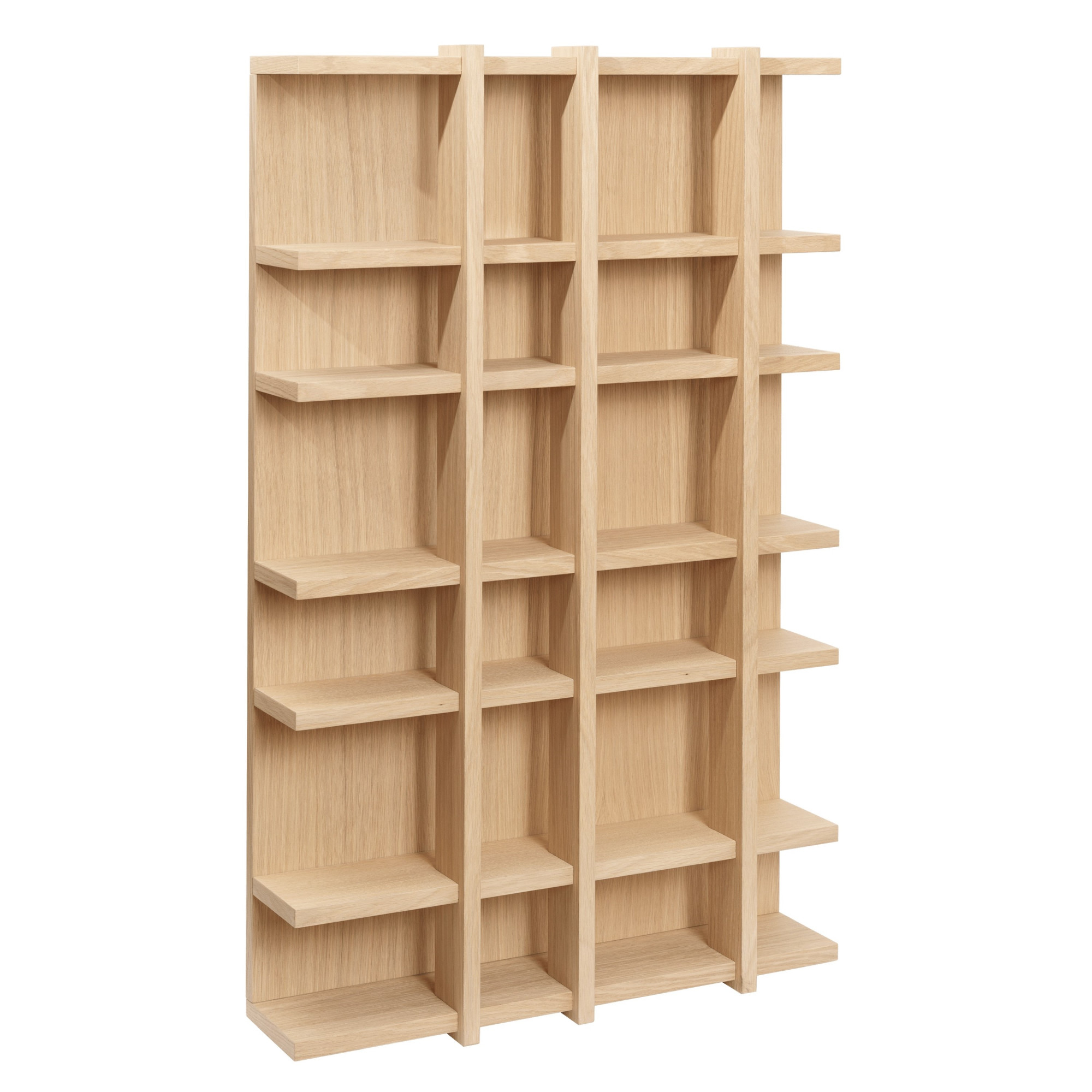 Przemyślany układ przegródek o różnych rozmiarach pozwala efektownie wyeksponować ulubione przedmioty – od ceramiki po dekoracje i książki. Subtelna szczelina między tyłem a pionowymi elementami dodaje lekkości konstrukcji oraz umożliwia wygodne ustawienie naczyń z uchwytami.