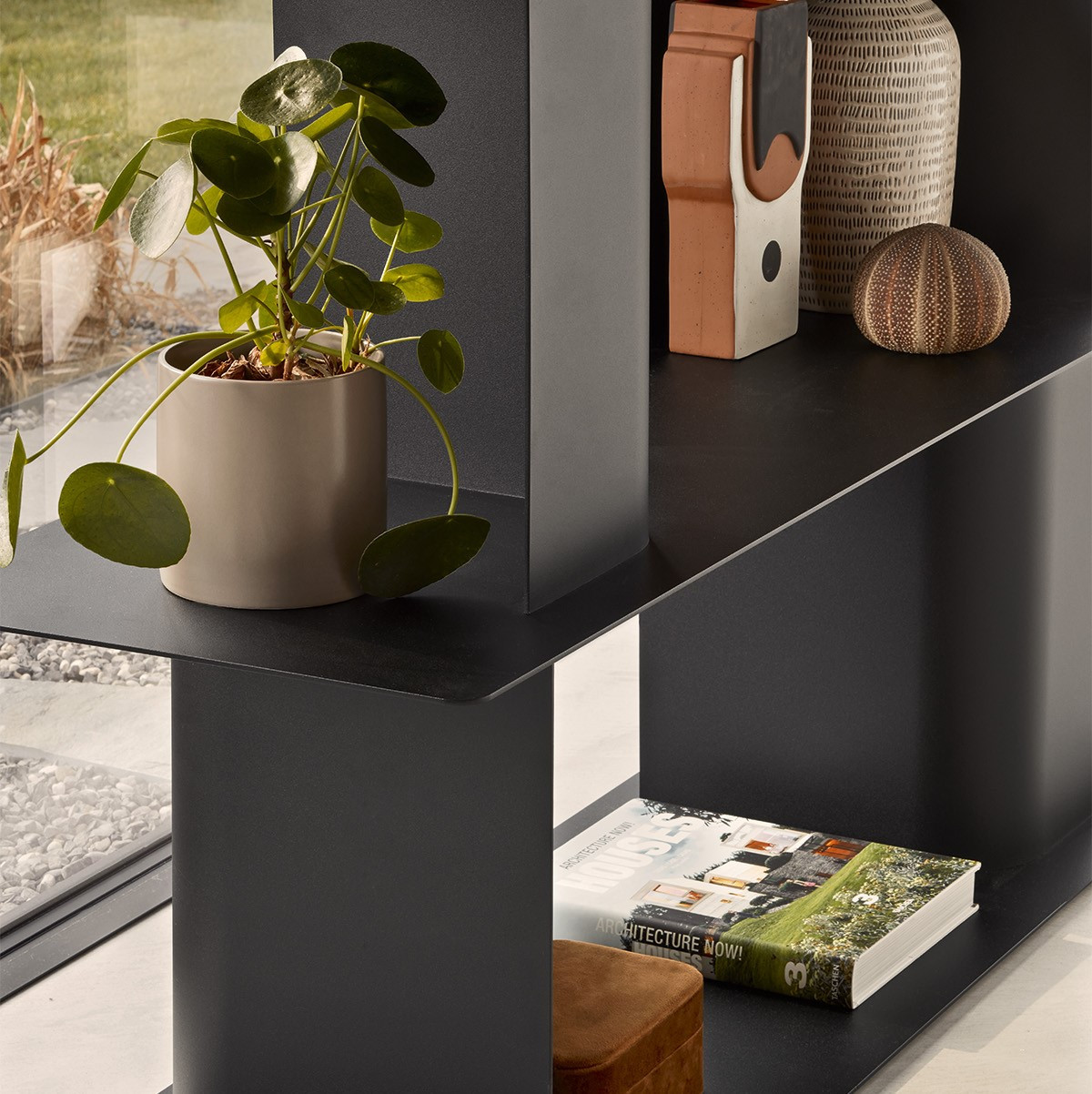Dzięki modułowej konstrukcji Carv można ustawić zarówno w pionie, jak i w poziomie, tworząc spójne kompozycje dopasowane do różnych przestrzeni. Regał dostępny jest w dwóch wariantach kolorystycznych: matowy brąz i matowa czerń, co pozwala dopasować go do nowoczesnych salonów, biur i przestrzeni typu open space. Carv łączy precyzję wykonania z funkcjonalnością, oferując elegancki, a jednocześnie lekki wizualnie system przechowywania.