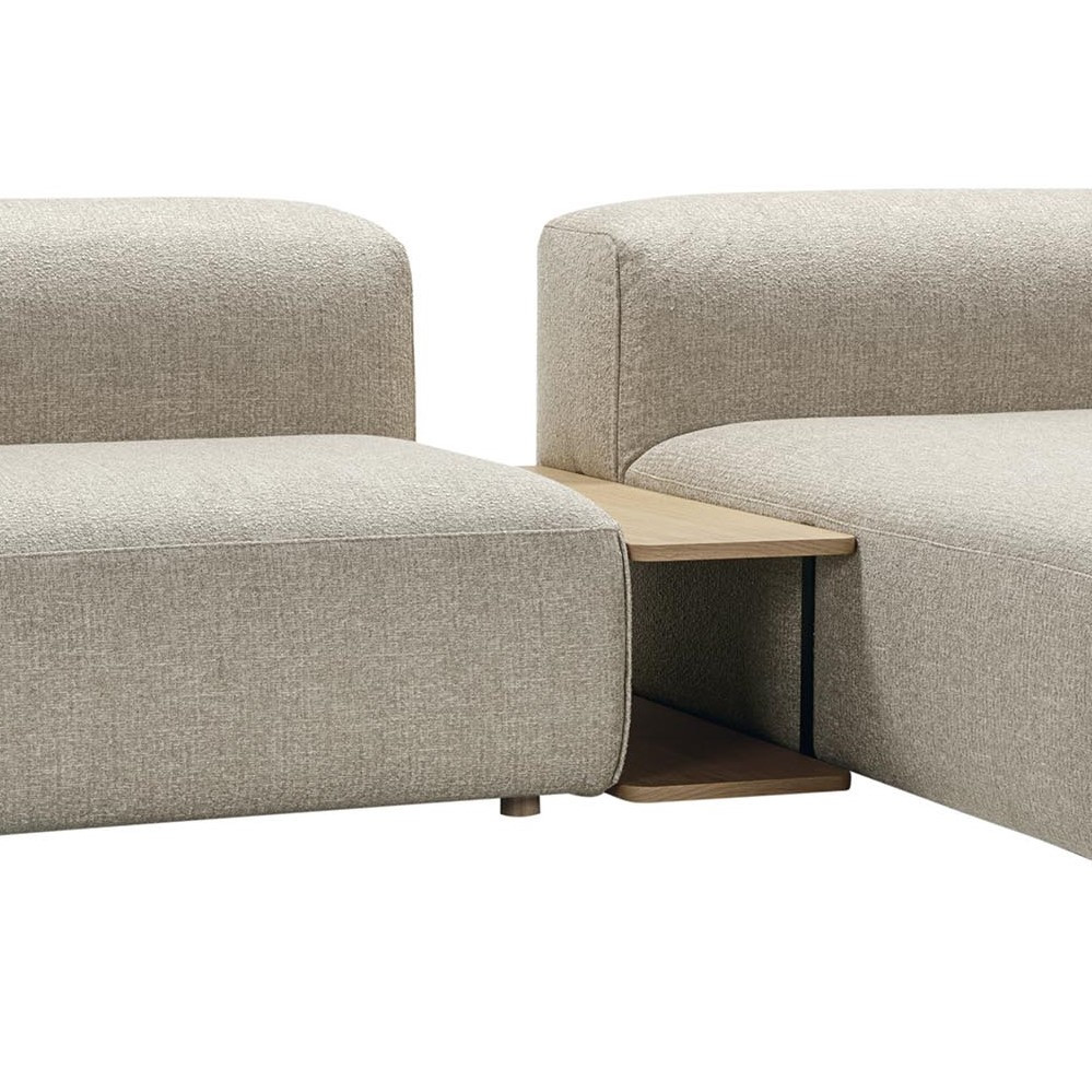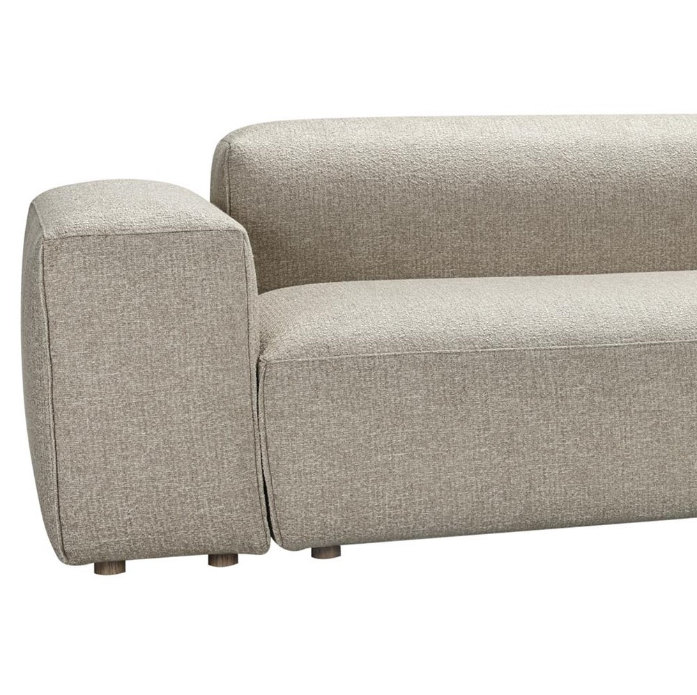 Sofa została wykończona tkaniną Laura o naturalnym, prostym splocie i lekko surowej strukturze, łączącym estetykę naturalnych materiałów z trwałością. Zdejmowane poszycia mocowane na rzepy ułatwiają pielęgnację i pozwalają szybko odświeżyć wygląd mebla.
