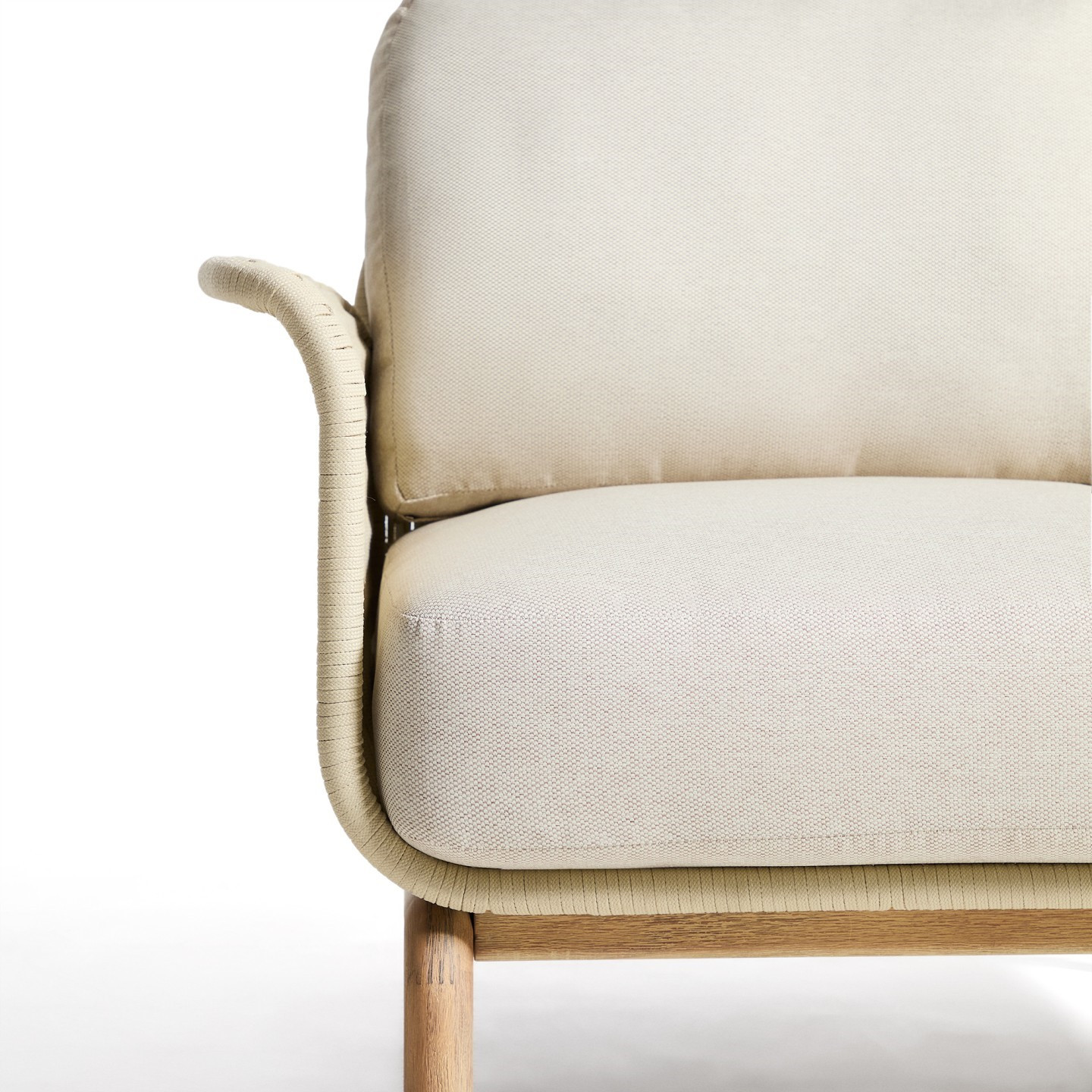 Siedzisko i oparcie zostały wykończone ręcznie plecioną liną w eleganckim kolorze ecru, odporną na promieniowanie UV. Takie rozwiązanie nie tylko podkreśla rustykalny styl fotela, ale także gwarantuje odpowiednią sprężystość i komfort siedzenia. W zestawie znajdują się grube poduszki z wypełnieniem z pianki i włókien poliestrowych, które zapewniają wygodę podczas długiego relaksu. Pokrowce można łatwo zdjąć, co ułatwia utrzymanie fotela w czystości.