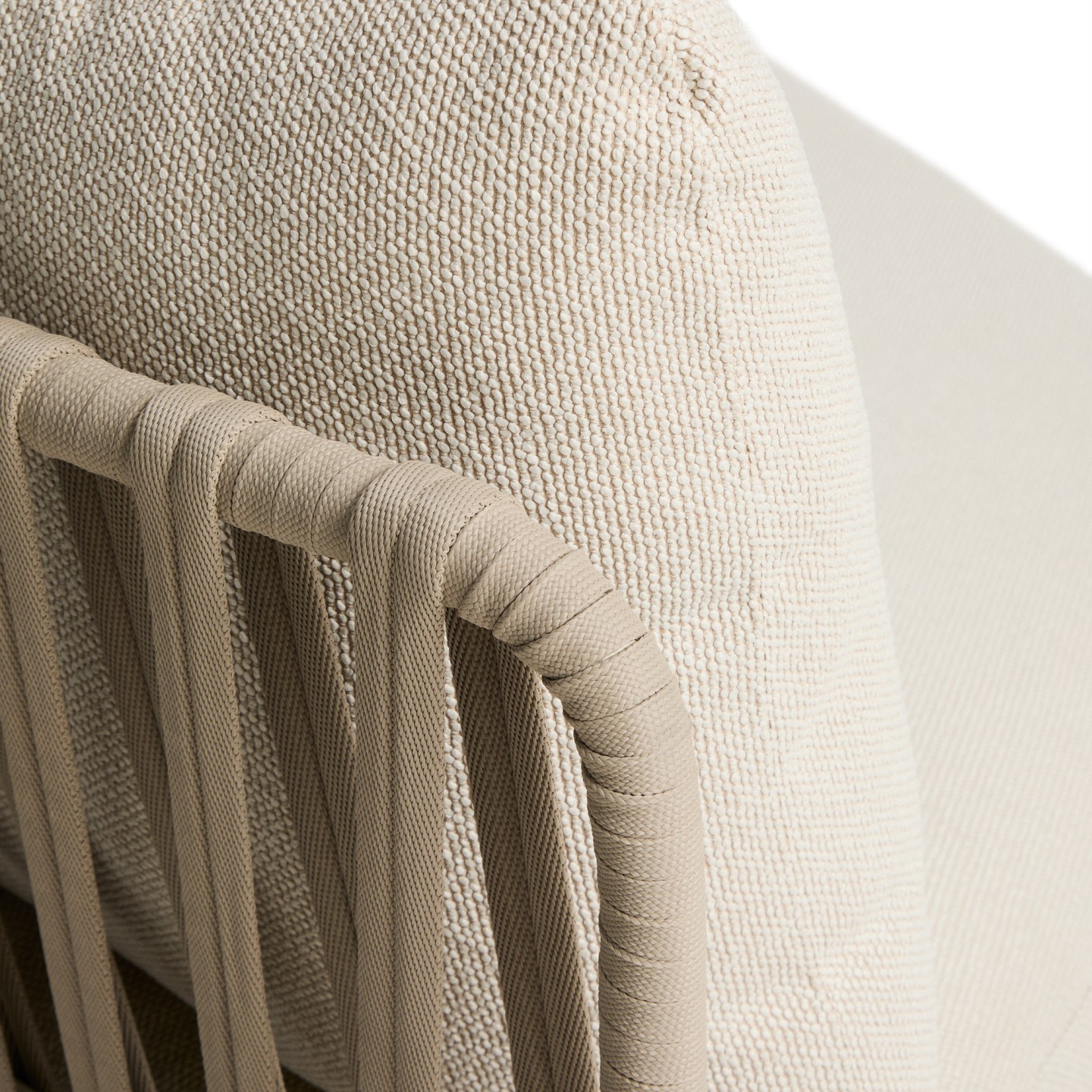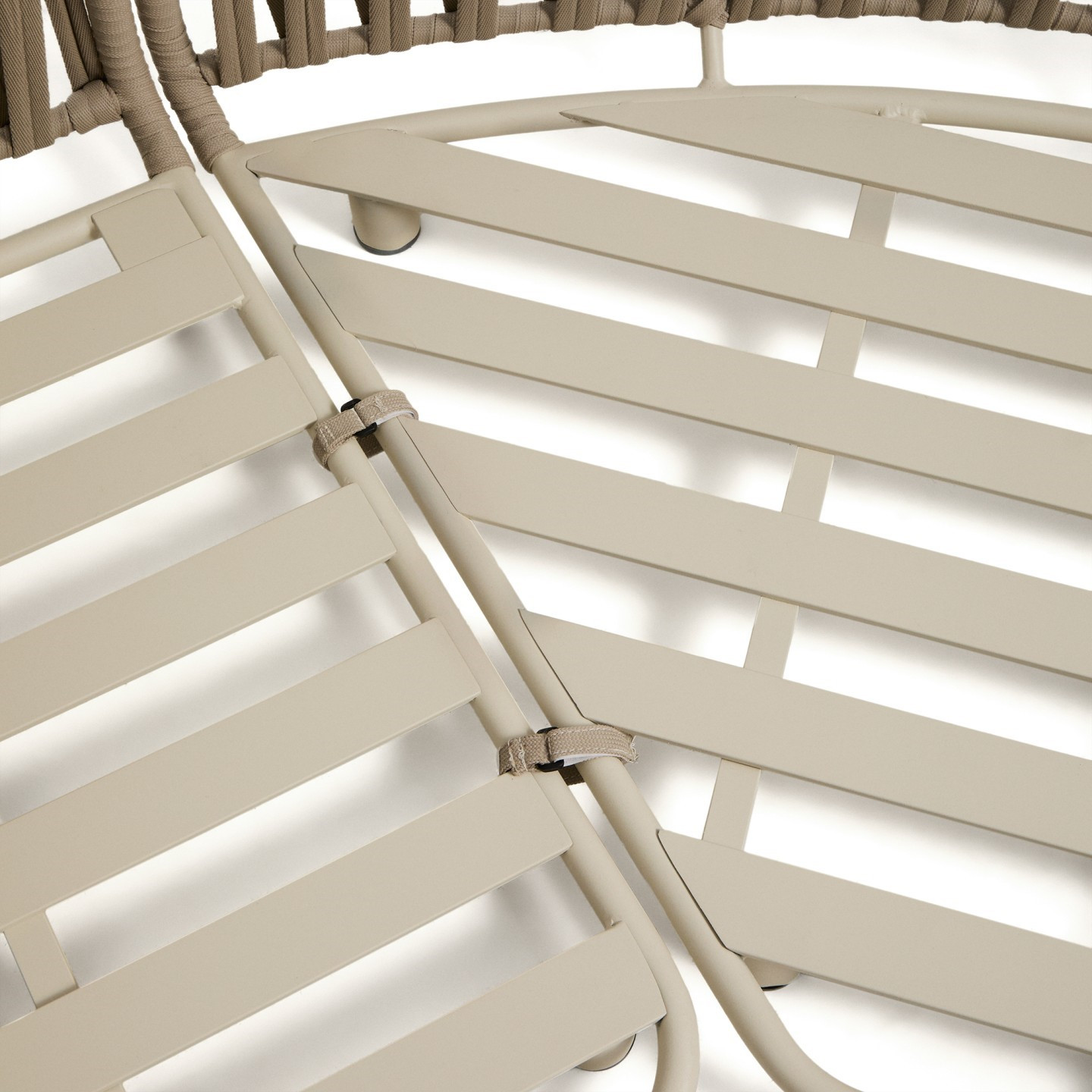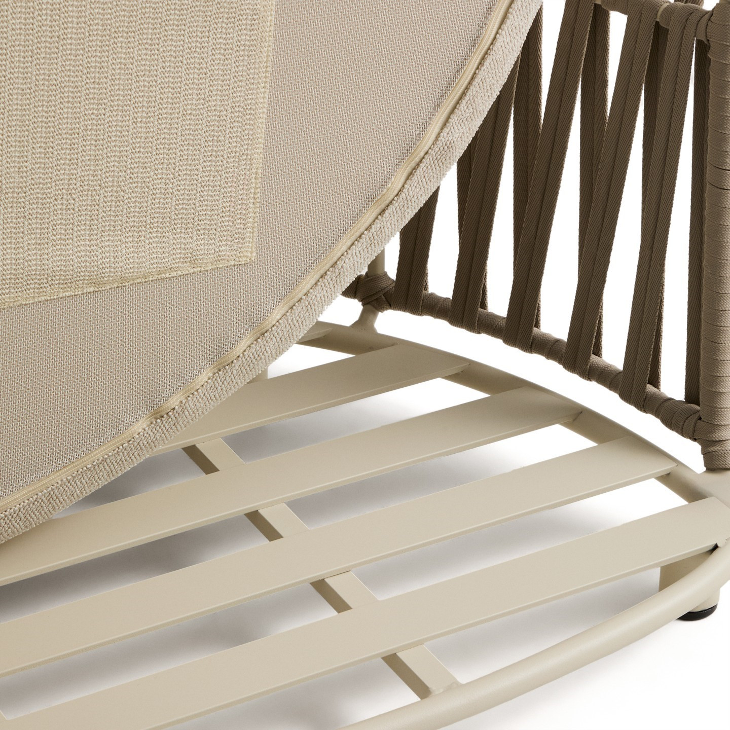 Konstrukcja sofy została wykonana z aluminium malowanego proszkowo, dzięki czemu jest lekka, a jednocześnie wyjątkowo odporna na rdzę, korozję i działanie promieni UV. To sprawia, że sofa ogrodowa Osani doskonale sprawdzi się podczas codziennego użytkowania na zewnątrz. Charakterystyczne oparcie z ręcznie plecionej liny nie tylko przyciąga wzrok, ale również zapewnia wygodne podparcie podczas odpoczynku.