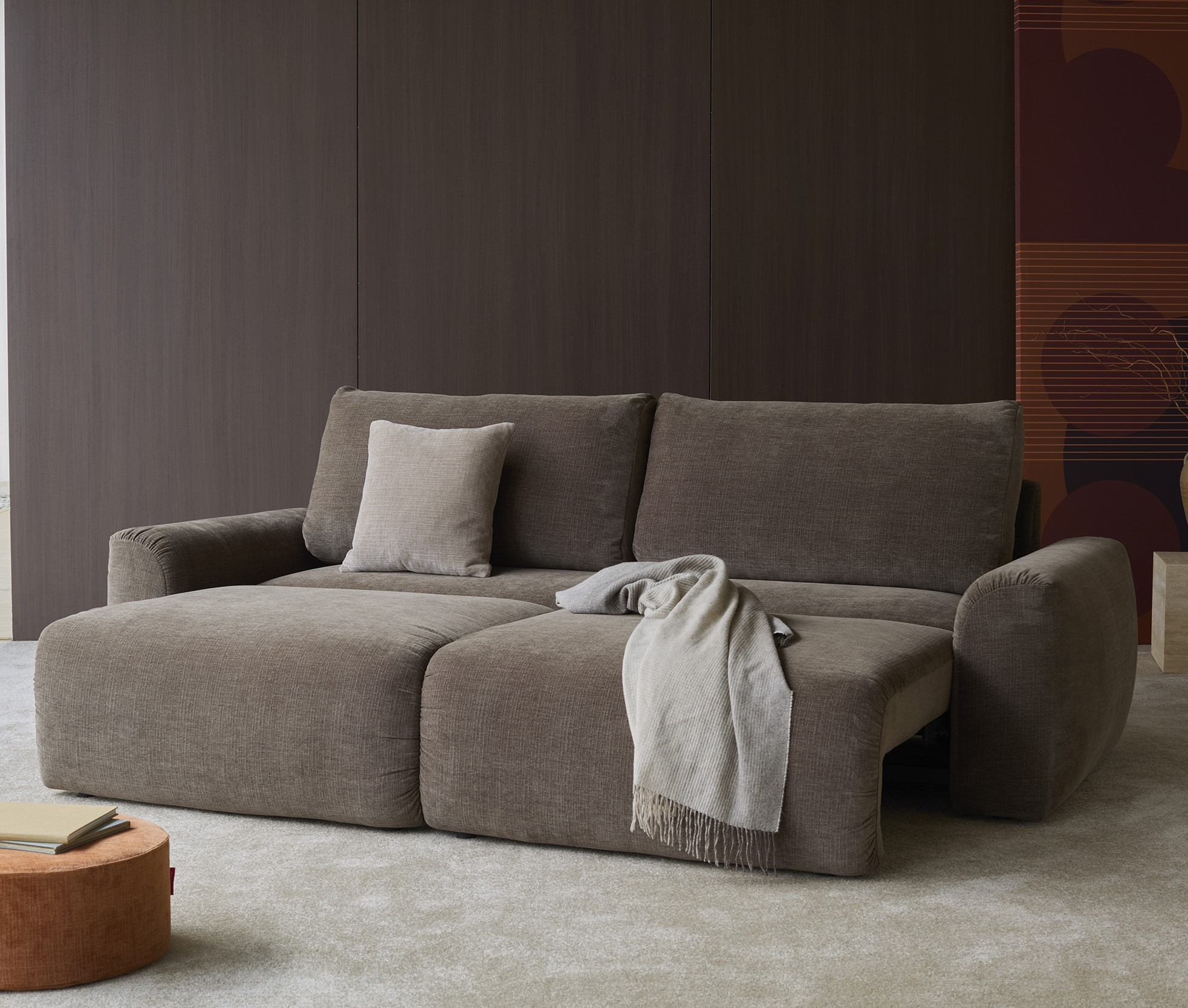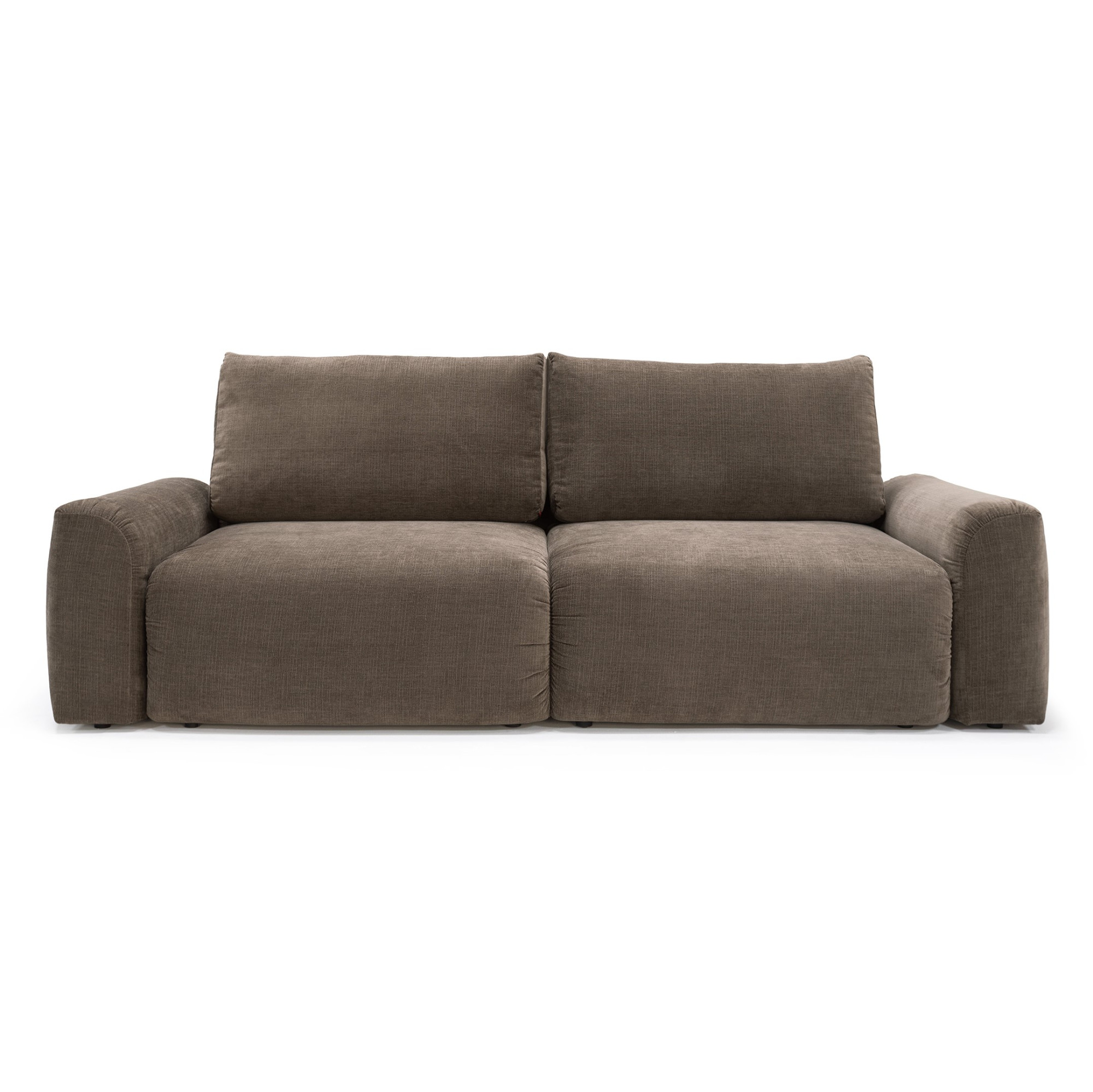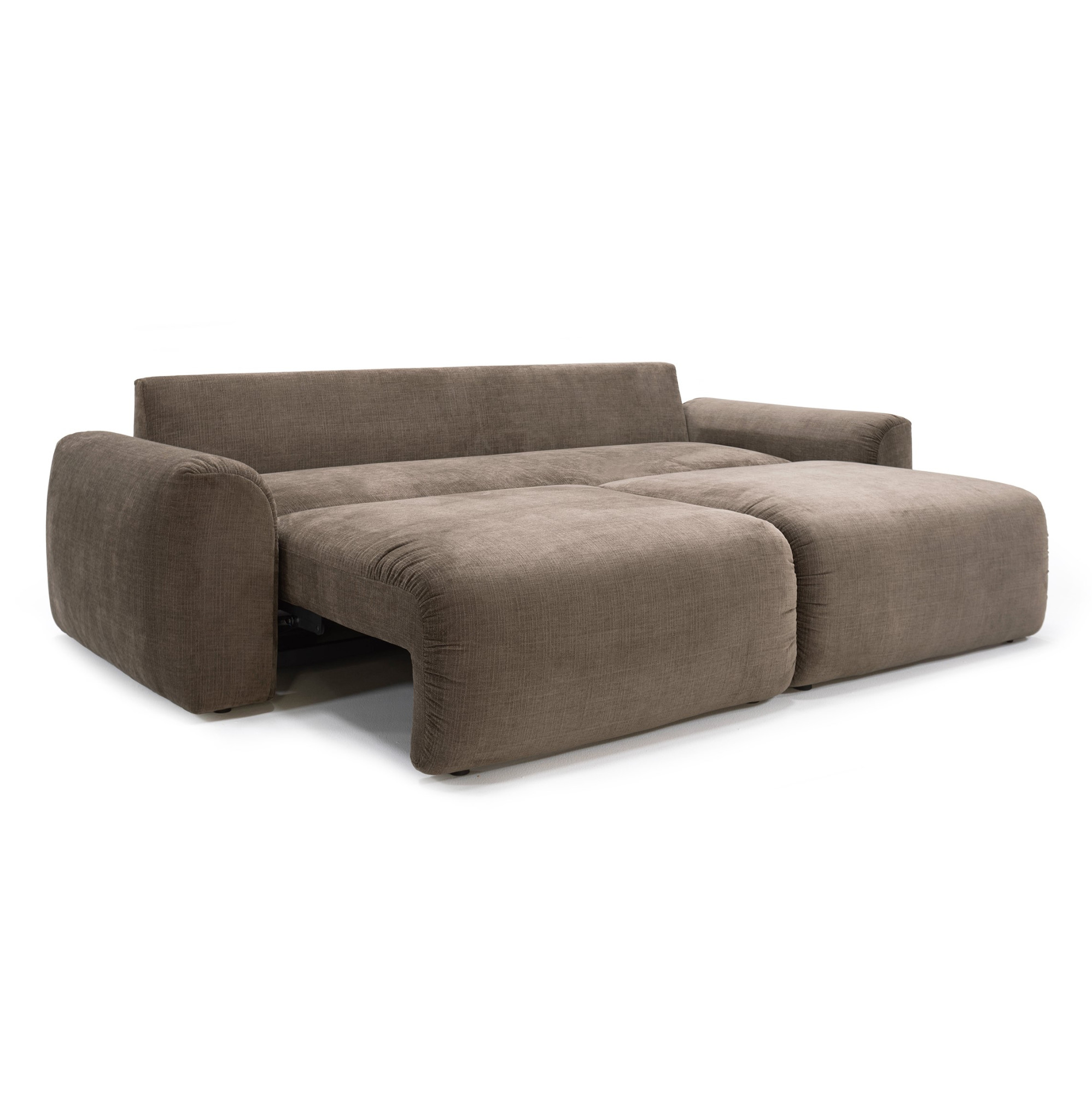 Nowoczesna sofa rozkładana w stylu „Family Lounger”, zaprojektowana z myślą o maksymalnym komforcie i codziennym relaksie. Wyraziste, szerokie podłokietniki oraz swobodna, lekko „żyjąca” tapicerka z naturalnymi marszczeniami nadają jej solidny, bardziej zdecydowany charakter, podkreślający współczesny, użytkowy design inspirowany swobodą lat 70.