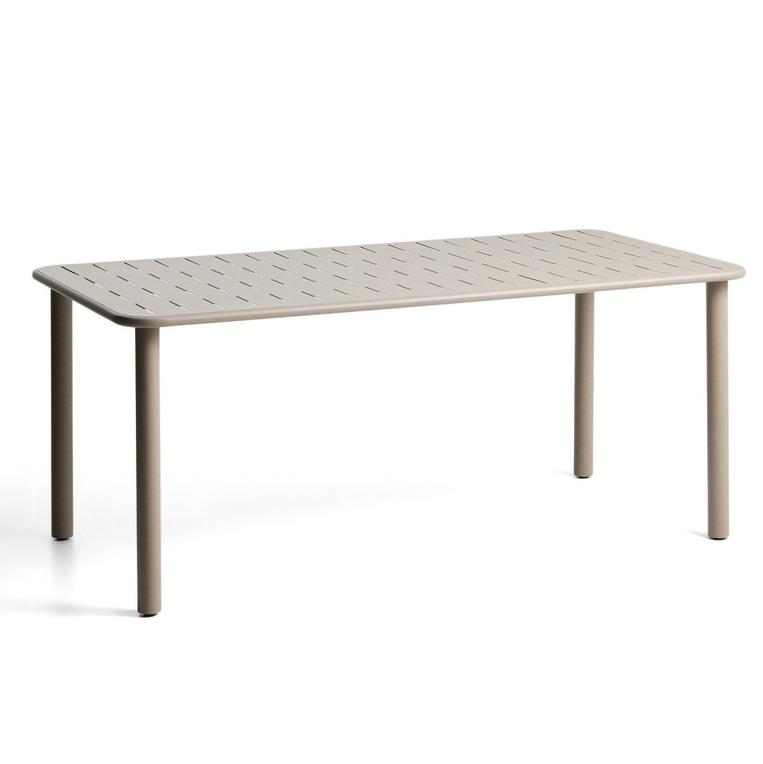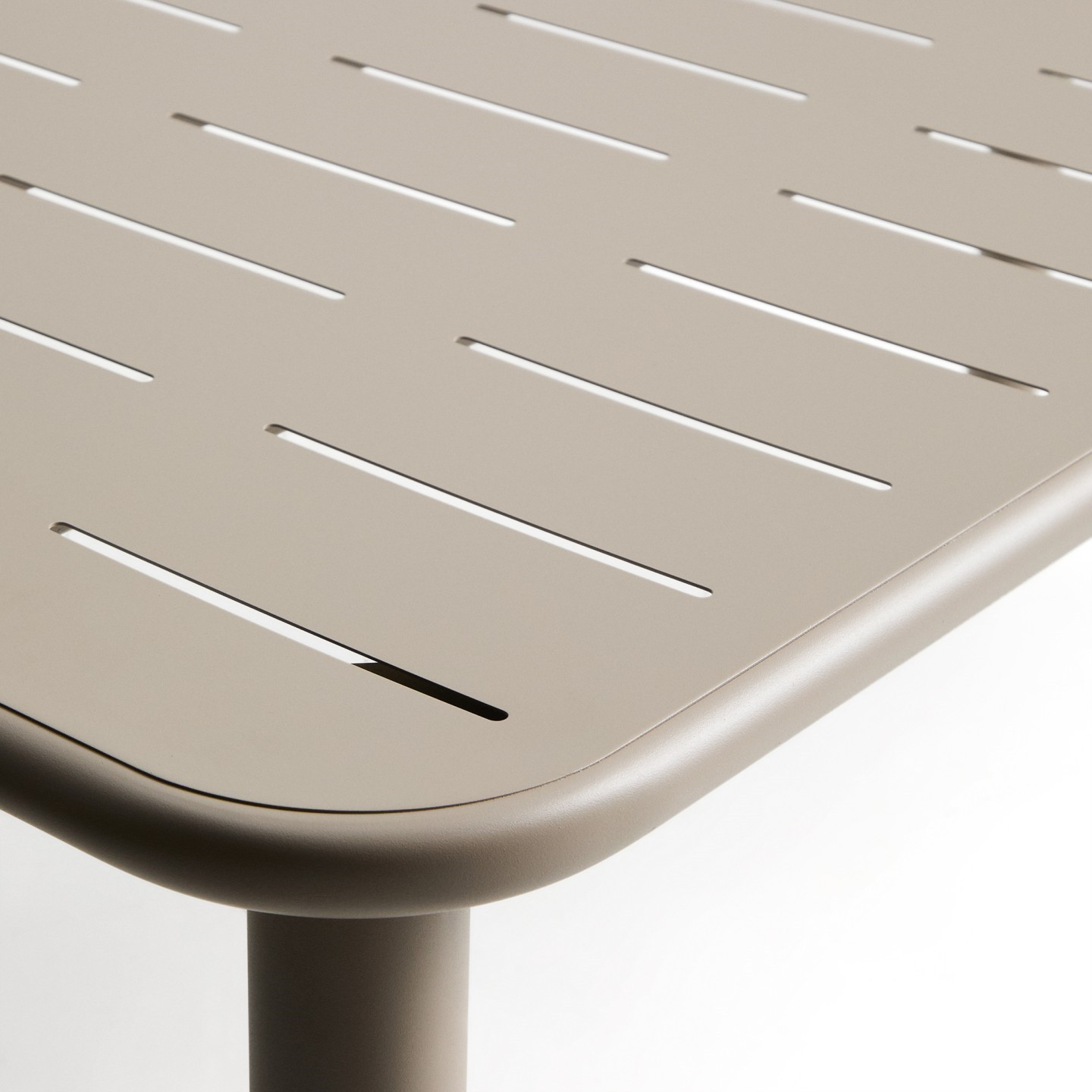 Projekt wyróżniają zaokrąglone narożniki oraz subtelne rowki w blacie, które nadają bryle wizualną miękkość i elegancki, współczesny charakter. Powierzchnia pokryta odporną na warunki zewnętrzne powłoką proszkową zwiększa trwałość mebla i ułatwia jego codzienną pielęgnację. Stabilna konstrukcja oparta na czterech stalowych nogach została uzupełniona o plastikowe i filcowe osłony, które chronią podłoże przed zarysowaniami oraz poprawiają stabilność stołu.