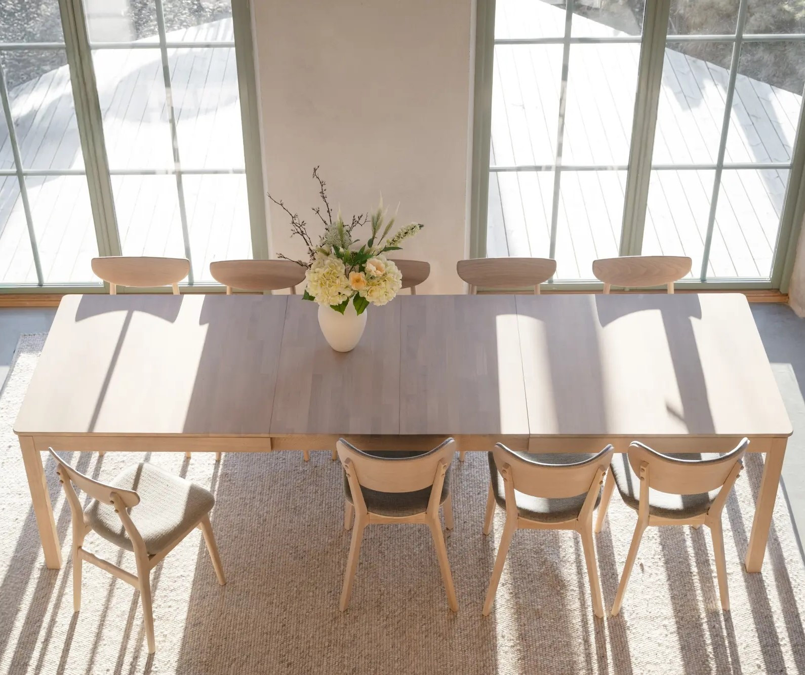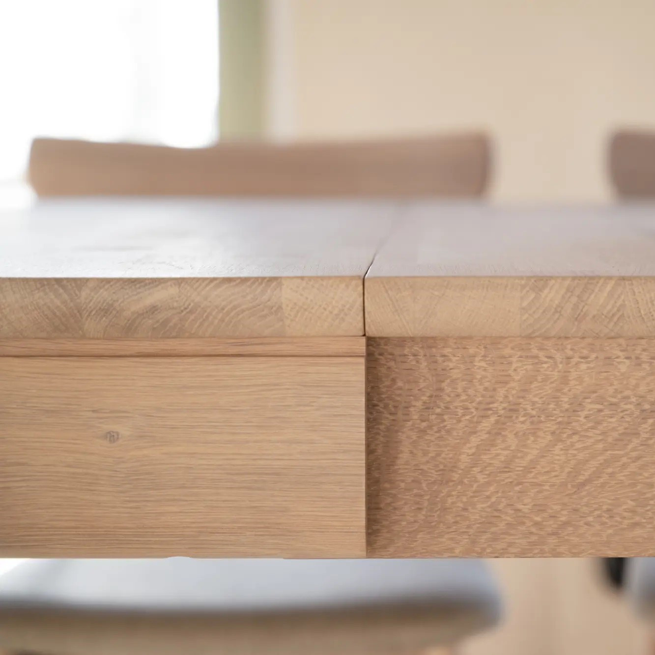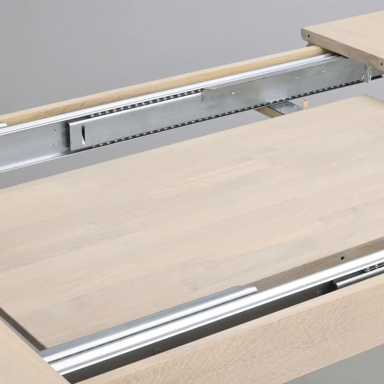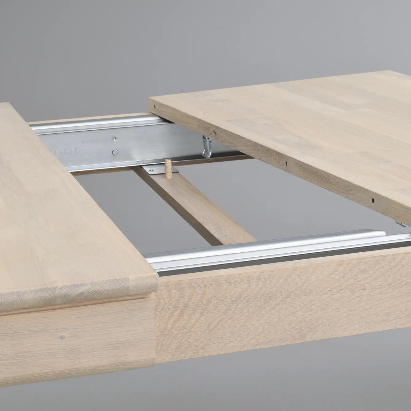 Blat o wymiarach 200×95 cm można łatwo powiększyć dzięki wkładkom o długości 50 cm każda, dostępnych w dopasowanych wykończeniach. Wystarczy dodać jedną lub dwie, by uzyskać długość 250 cm lub 300 cm – idealnie na rodzinne uroczystości i większe spotkania z przyjaciółmi. Wkładki można wygodnie przechowywać wewnątrz stołu, gdy nie są używane.