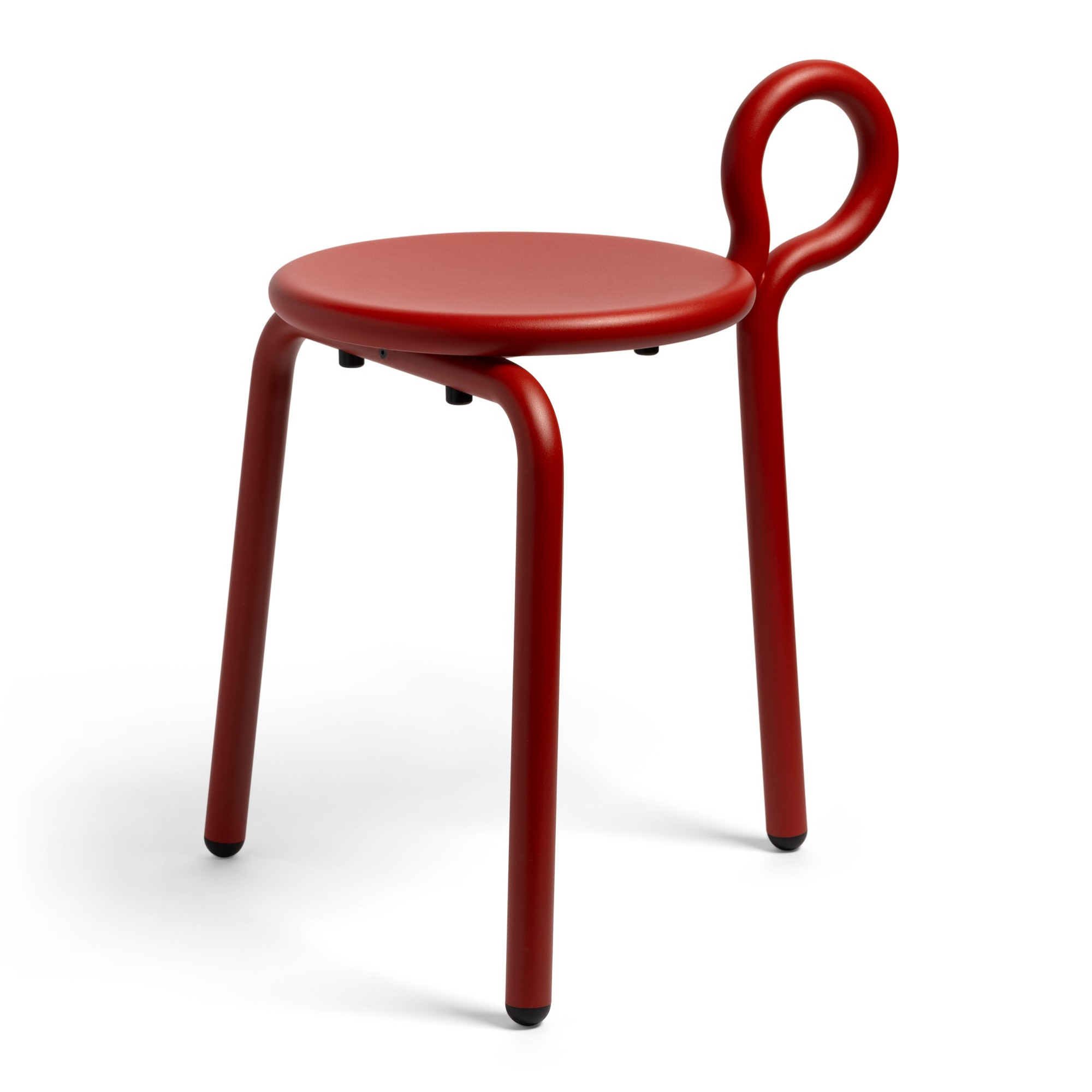 Zaokrąglone linie oraz subtelnie wygięte zakończenia nóg nadają całości spójny, nowoczesny charakter, który doskonale odnajdzie się w aranżacjach loftowych, skandynawskich i minimalistycznych. Czerwone, metalowe wykończenie podkreśla uniwersalność stołka i pozwala łatwo dopasować go do różnych wnętrz – od salonu, przez sypialnię, aż po przedpokój.