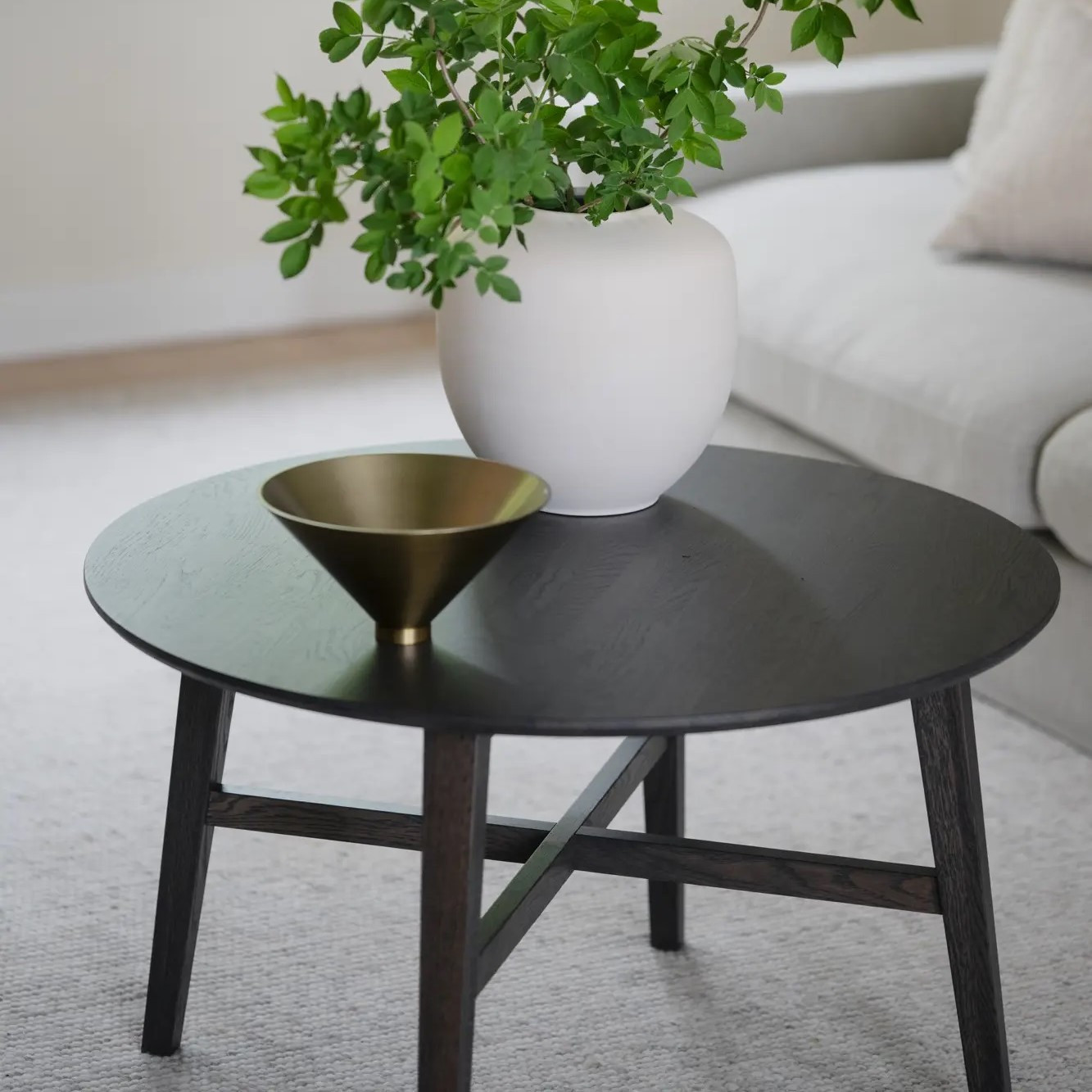 Stolik kawowy Filippa marki Rowico w odcieniu ciemnego brązu to kwintesencja skandynawskiego designu i ponadczasowej elegancji. Okrągły blat o średnicy 90 cm wykonano z litego, finger-jointed dębu, delikatnie szczotkowanego i lakierowanego, co podkreśla naturalną strukturę drewna i nadaje mu subtelny połysk, czyniąc go wyjątkowym stolikiem kawowym z dębu. Filippa to nie tylko piękny mebel, ale także świadomy wybór stworzony w 100% z drewna certyfikowanego FSC®, pochodzącego z odpowiedzialnej gospodarki leśnej.