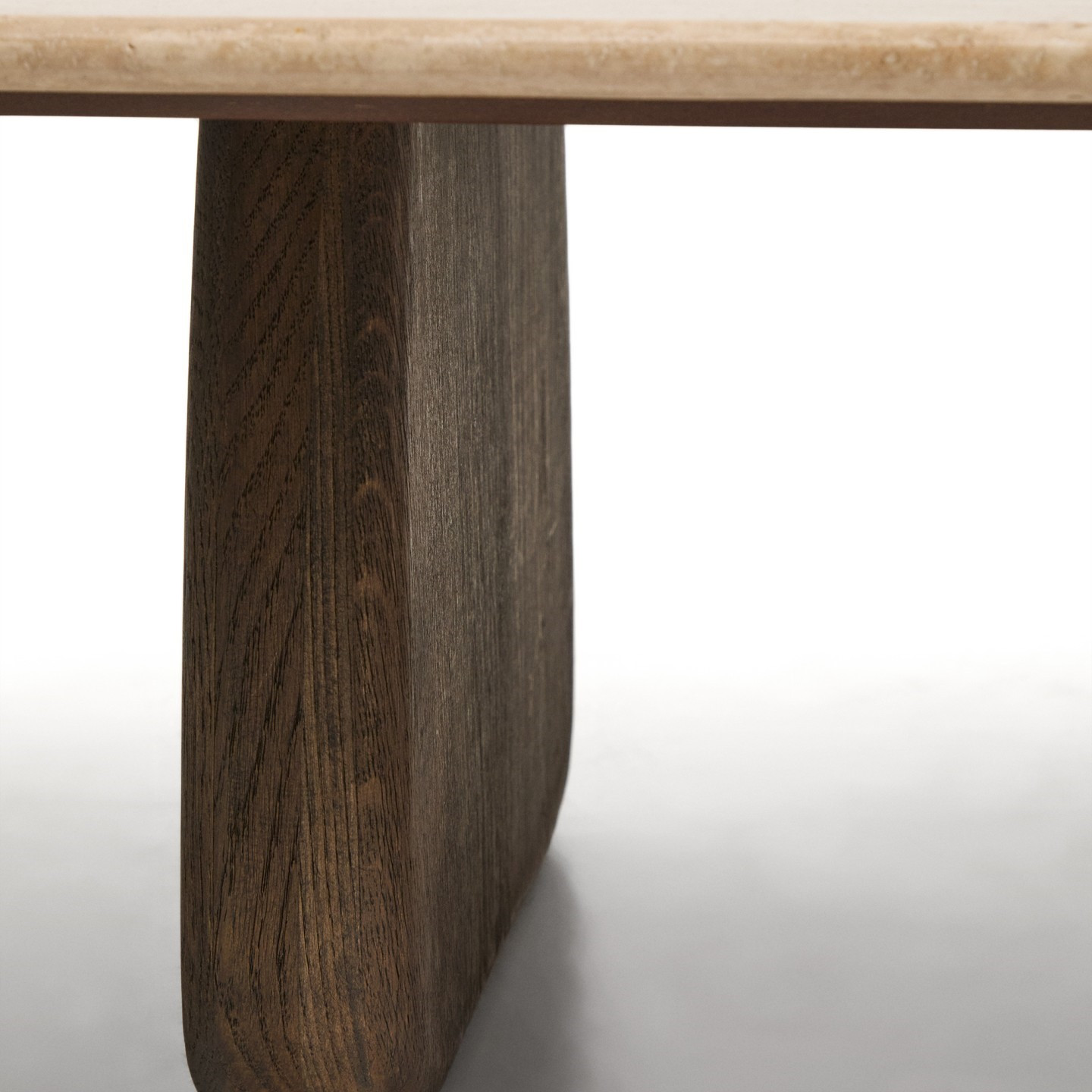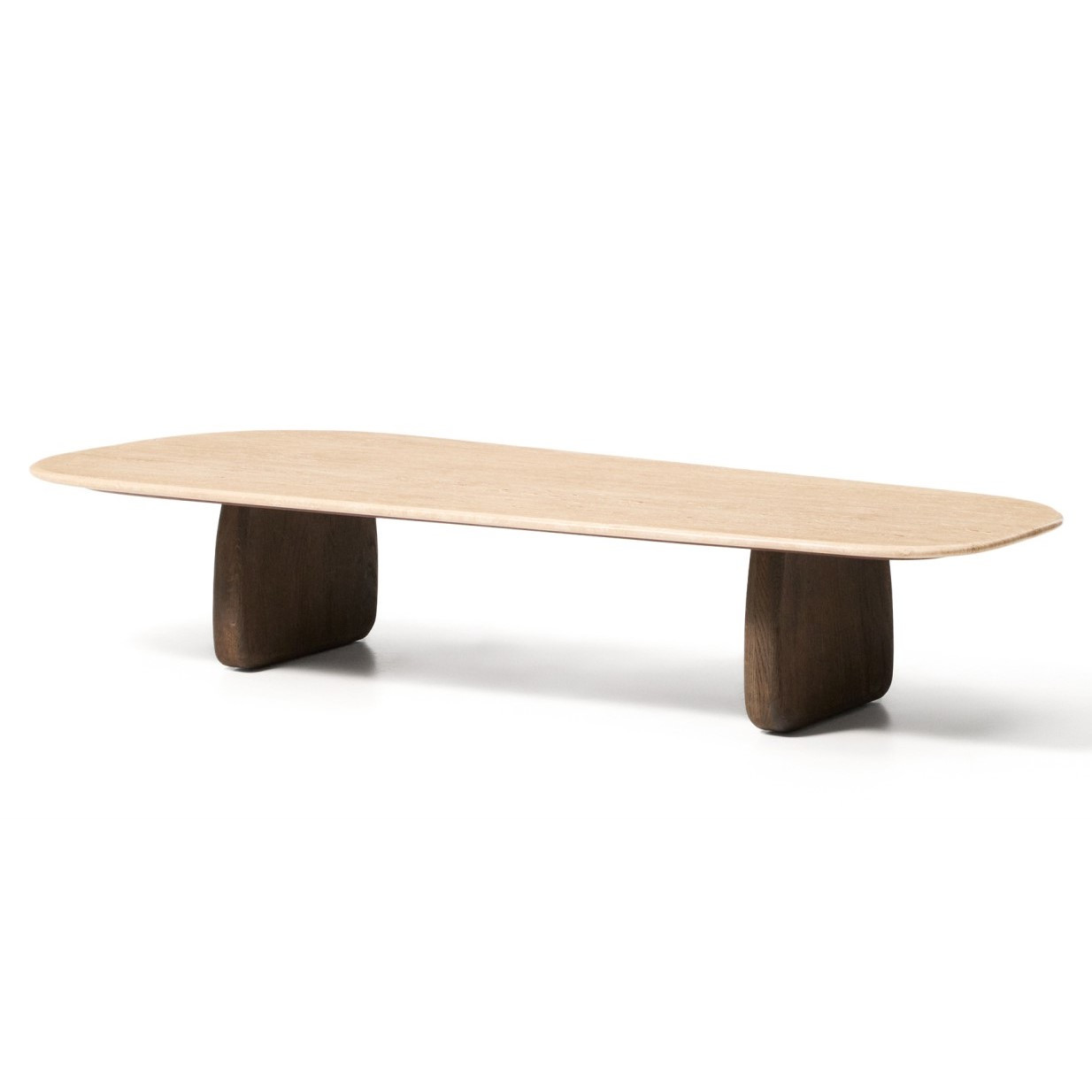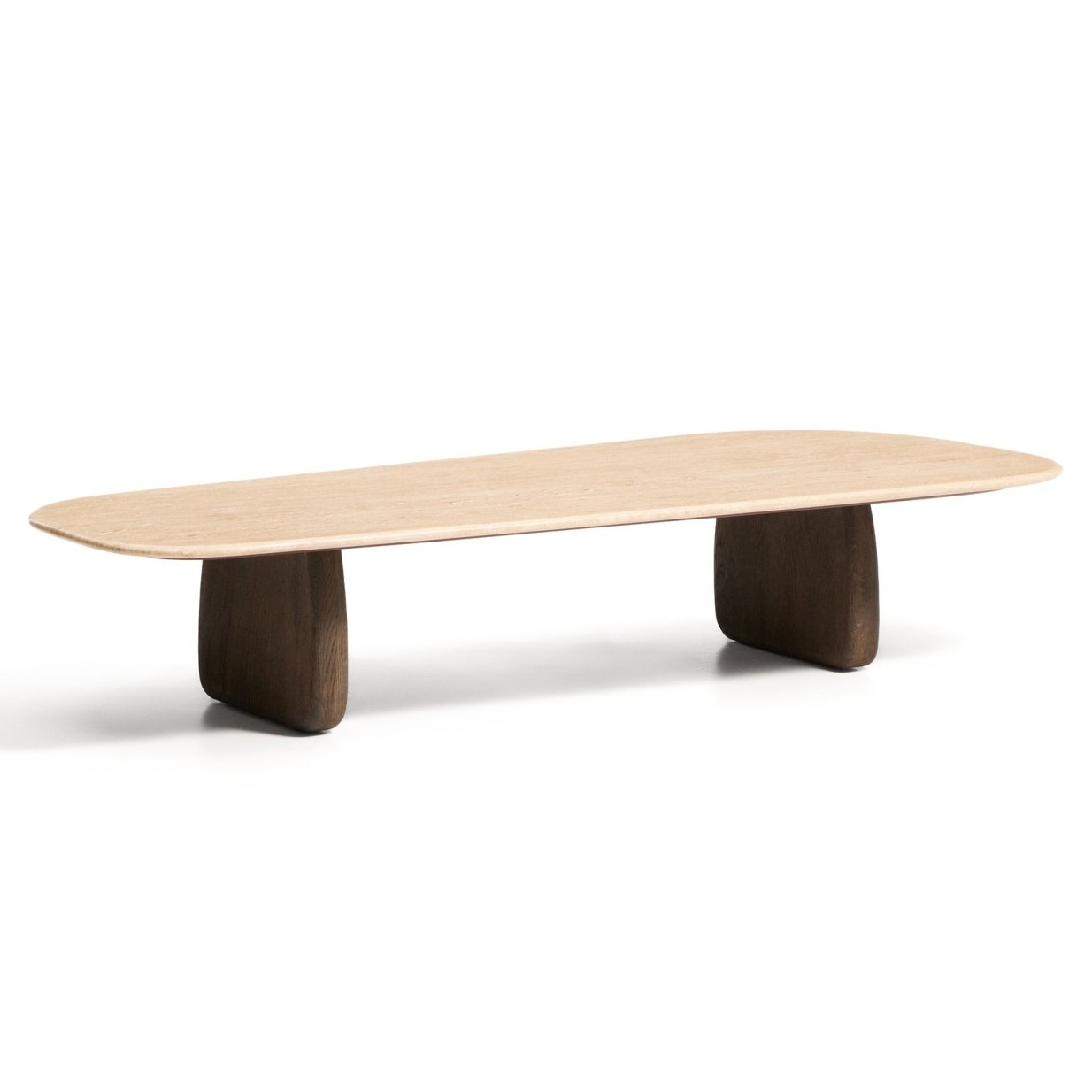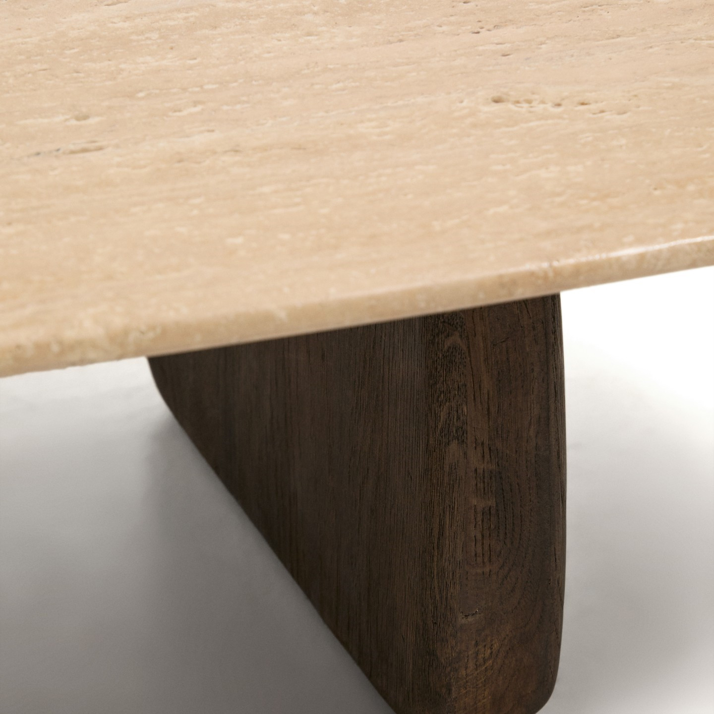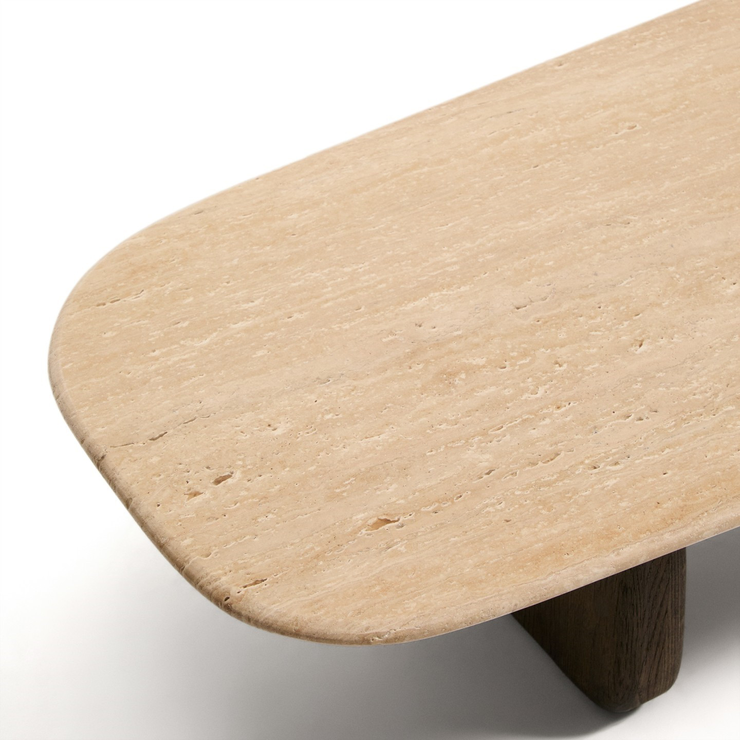 Stolik kawowy Pirita z trawertynowym blatem i dębową podstawą w ciemnym wykończeniu to propozycja dla osób ceniących naturalne materiały i wyrazisty design. Beżowy trawertyn nadaje meblowi elegancki, ponadczasowy charakter, a jego unikalna, porowata struktura sprawia, że każdy egzemplarz jest jedyny w swoim rodzaju. Organiczna forma i zaokrąglone linie wprowadzają do wnętrza lekkość, jednocześnie podkreślając nowoczesny, dopracowany styl.