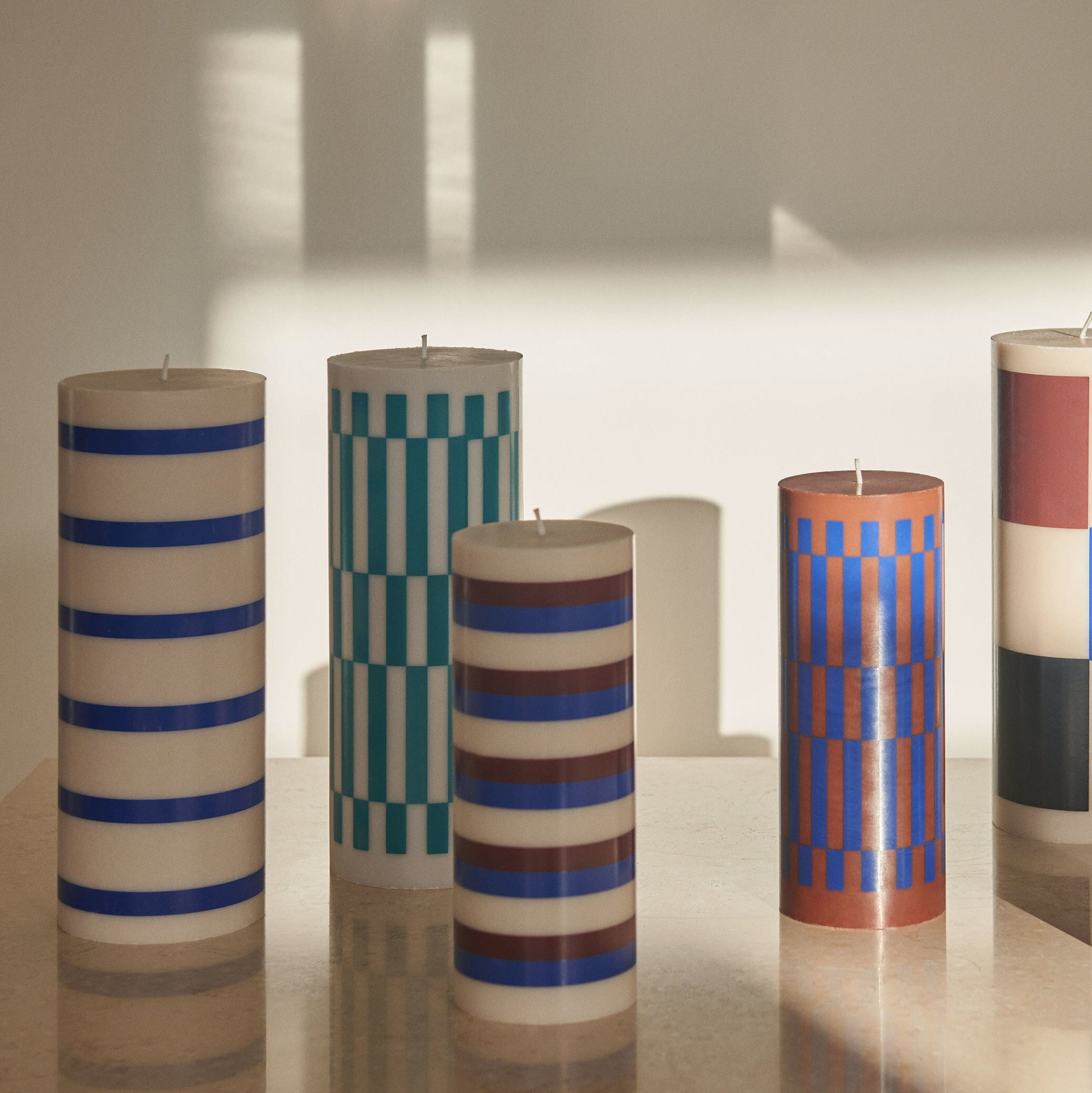 Kolumnowa świeca z bordową kratą wyróżnia się wyrazistym, graficznym wzorem, który wnosi do wnętrza nowoczesny akcent. Jej solidna bryła sprawia, że świetnie sprawdza się jako samodzielna dekoracja lub w zestawieniu z innymi świecami Column w różnych kolorach i rozmiarach, tworząc efektowne kompozycje.