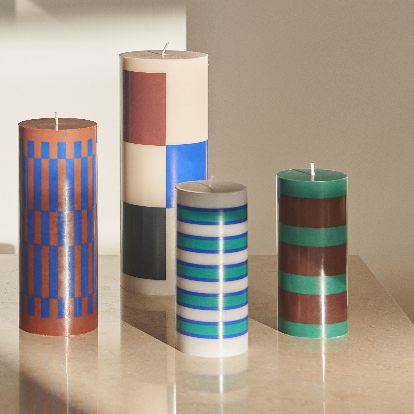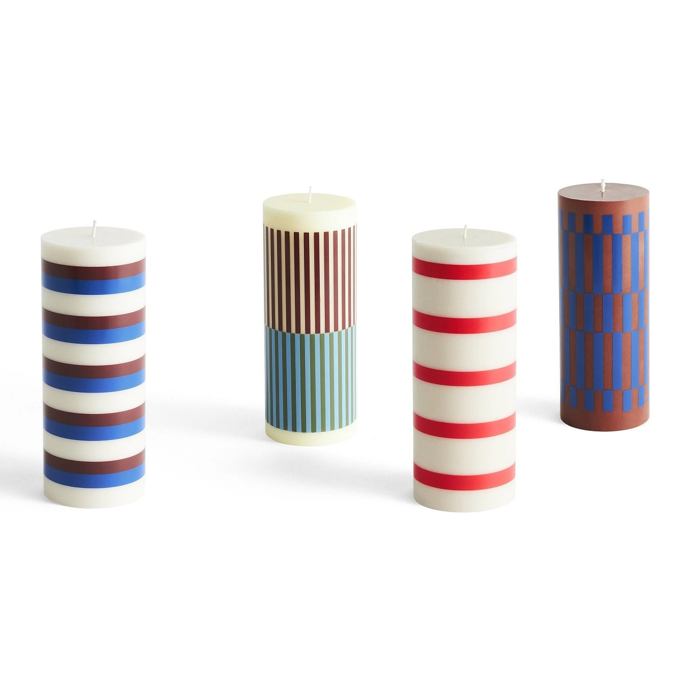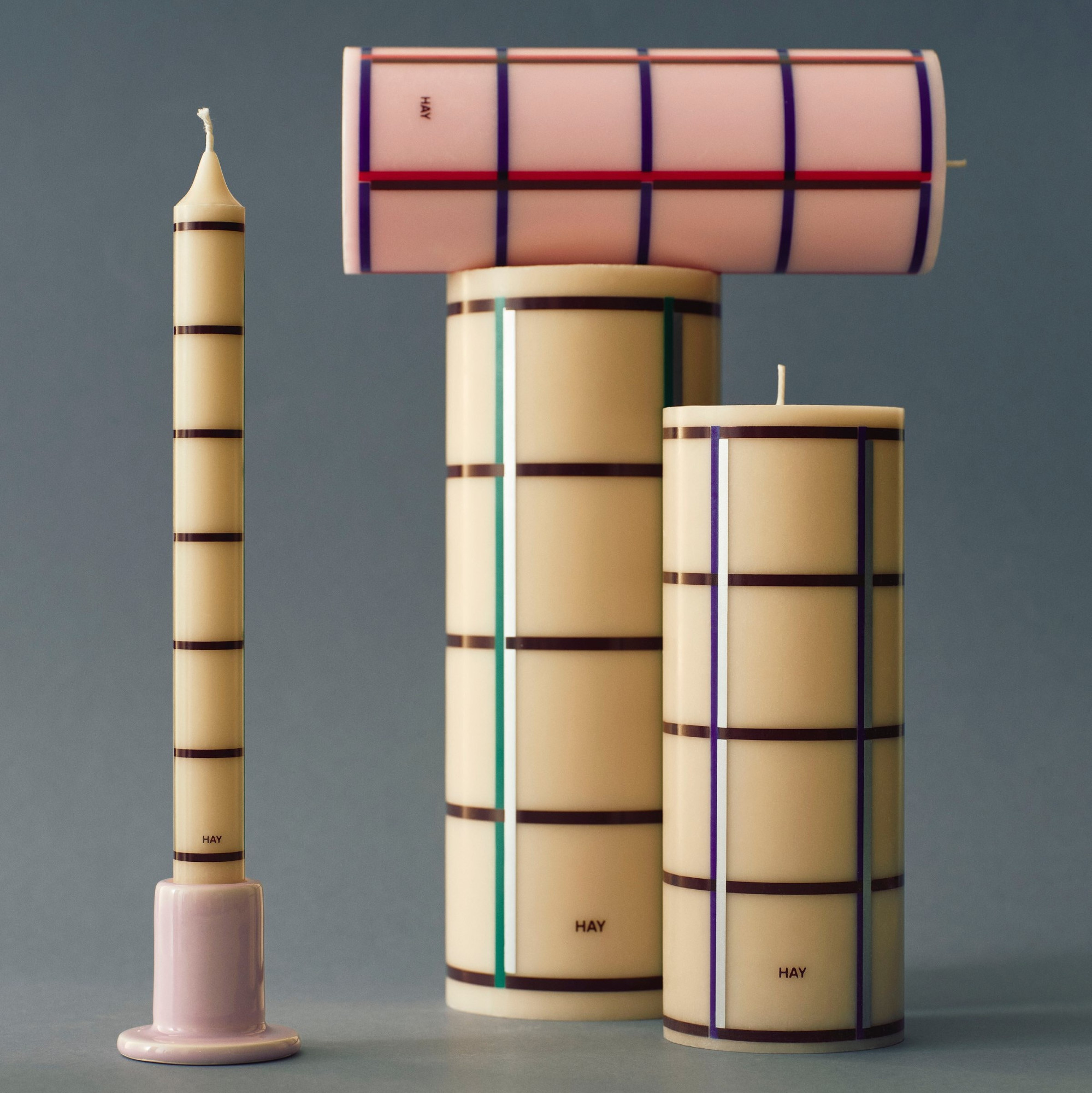 Świeca kolumnowa o wyrazistej, graficznej formie. Jej solidna bryła oraz charakterystyczny wzór kraty wprowadzają do przestrzeni świeży, współczesny akcent. Kolorowe pasy w układzie pionowym i poziomym tworzą dynamiczny efekt wizualny, będący znakiem rozpoznawczym estetyki HAY. Świeca doskonale prezentuje się zarówno jako samodzielna dekoracja, jak i w kompozycjach z innymi świecami Column w różnych kolorach i rozmiarach.