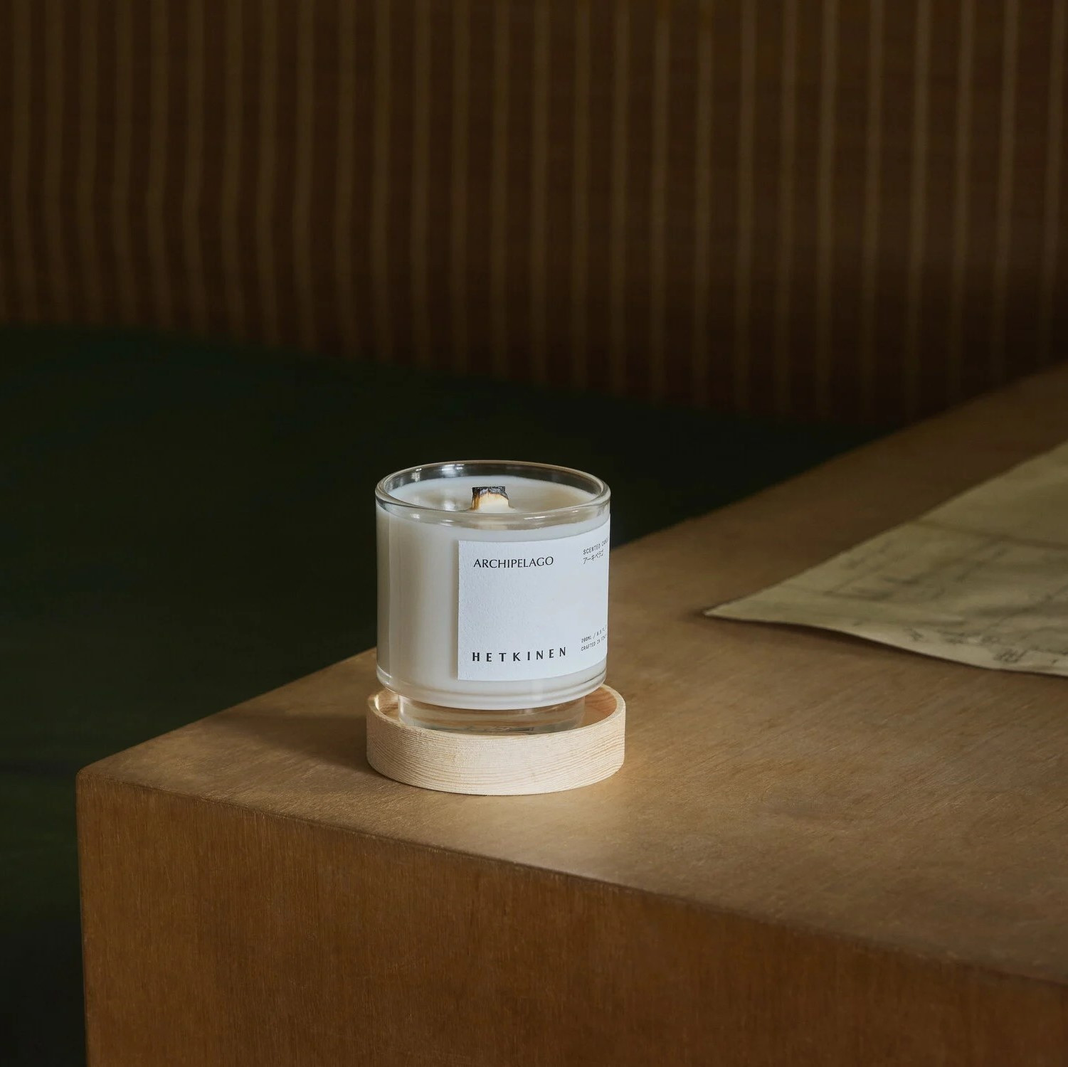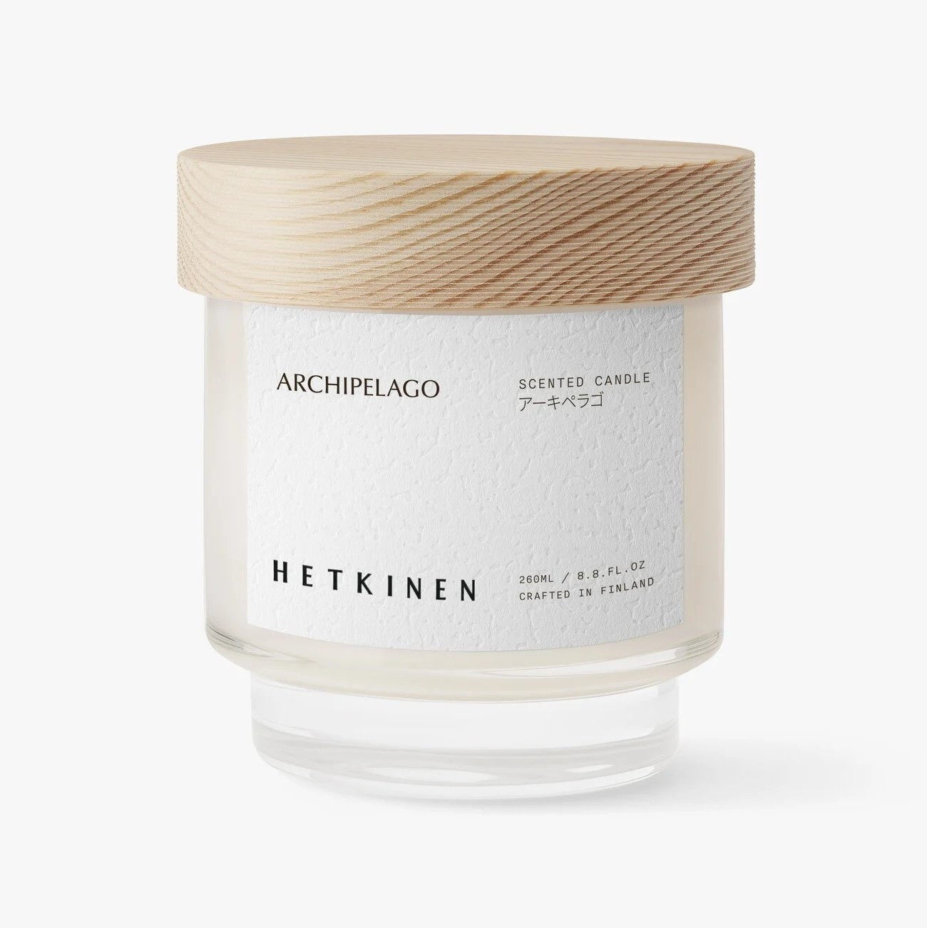 Świeca wykonana jest z wosku oliwnego, który zapewnia czyste i równomierne spalanie. Całość zamknięta jest w szklanym słoiku z pokrywką z fińskiego drewna sosnowego, co podkreśla minimalistyczny, skandynawski design. Produkt jest 100% naturalny, wegański i wyprodukowany w Finlandii, a słoik można ponownie wykorzystać z zestawem Hetkinen DIY / refill candle.
