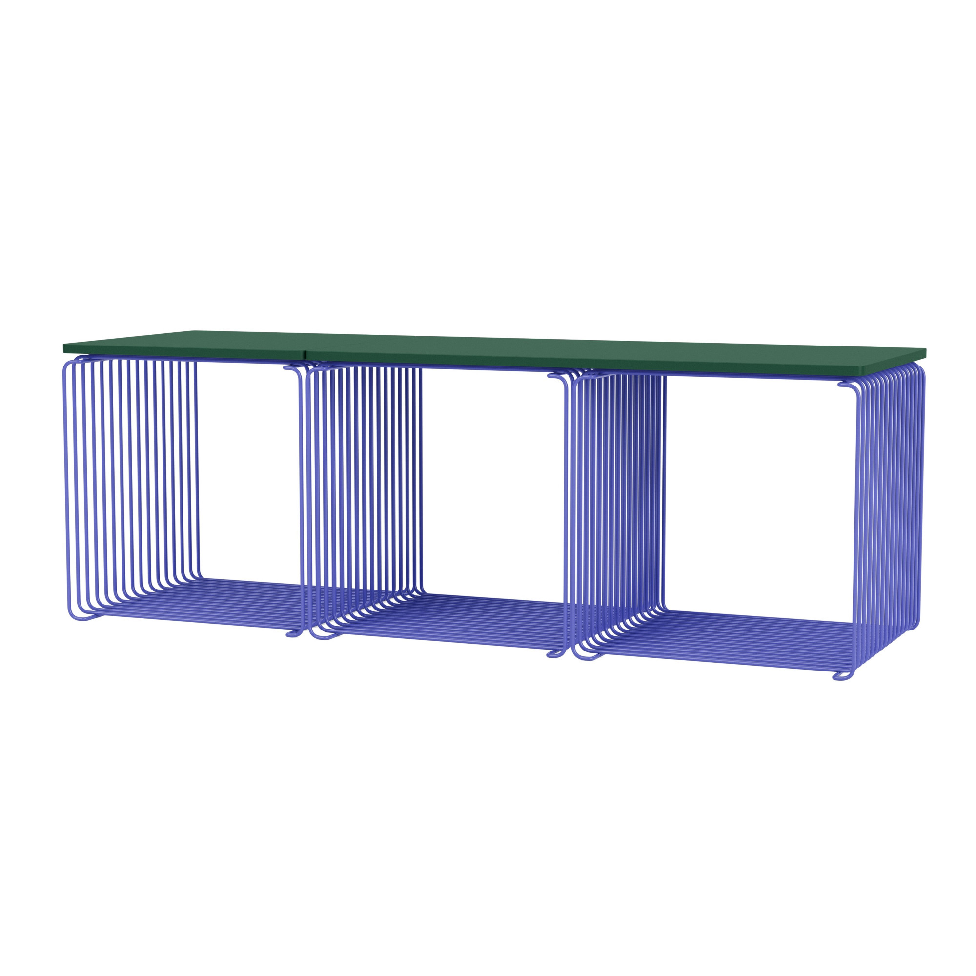 Prezentowany zestaw składa się z trzech modułów o szerokości 34,8 cm każdy. Górna część zestawu wyposażona jest w dwie półki – jedną długą 70 cm oraz jedną krótszą 34,8 cm. Ażurowa, druciana konstrukcja nadaje całości nowoczesny, architektoniczny charakter, zachowując lekkość nawet przy rozbudowanych układach.