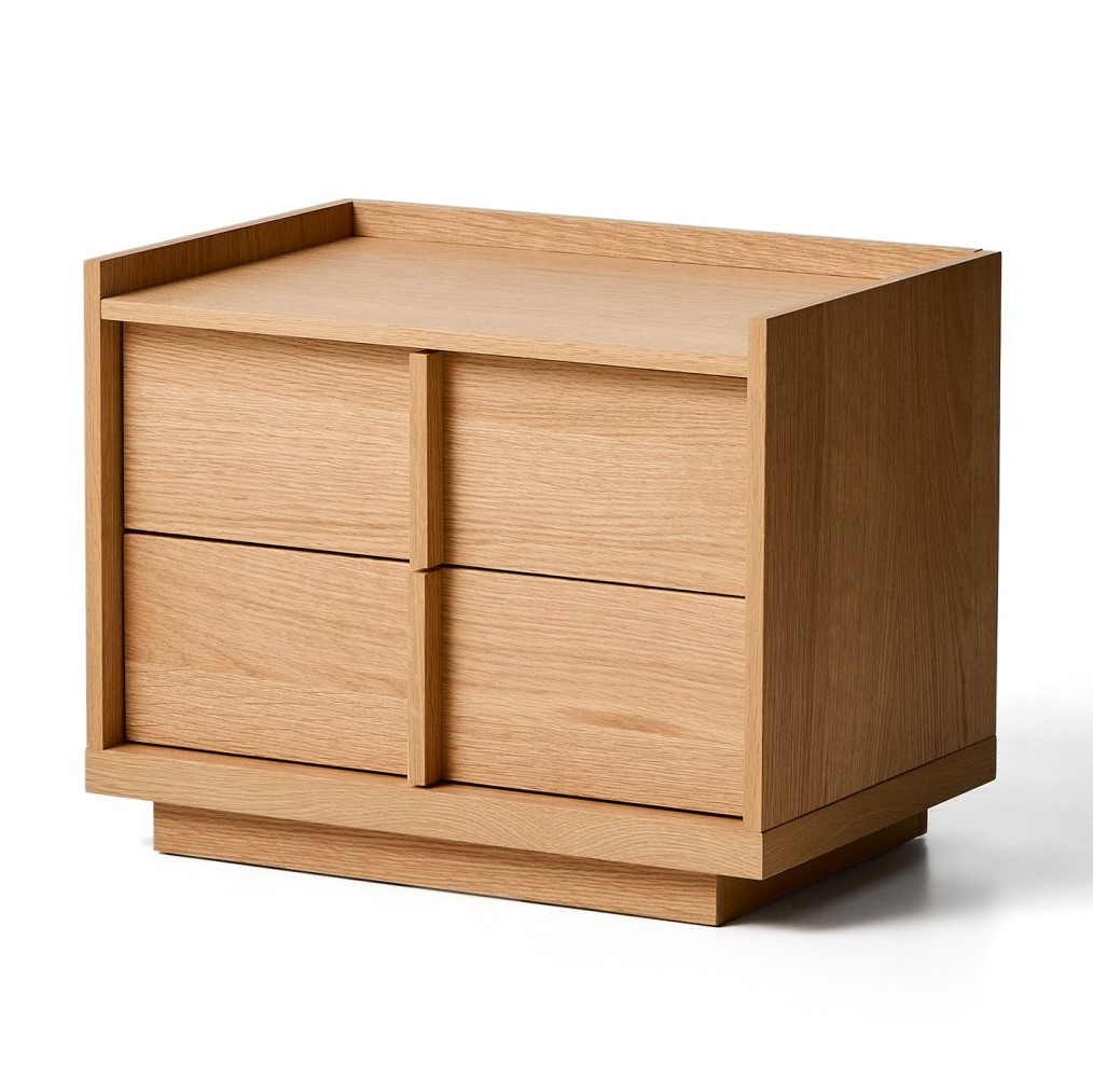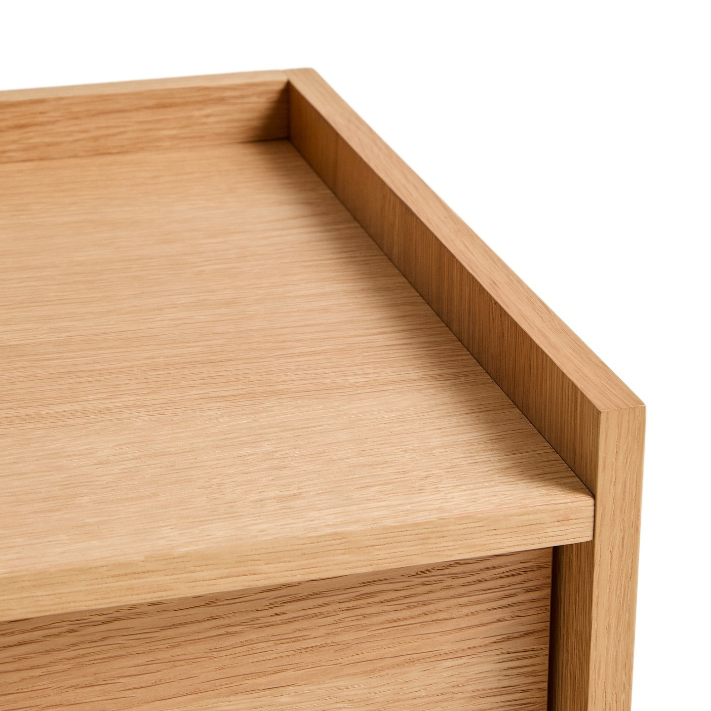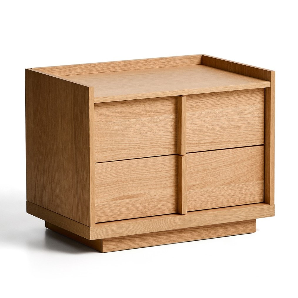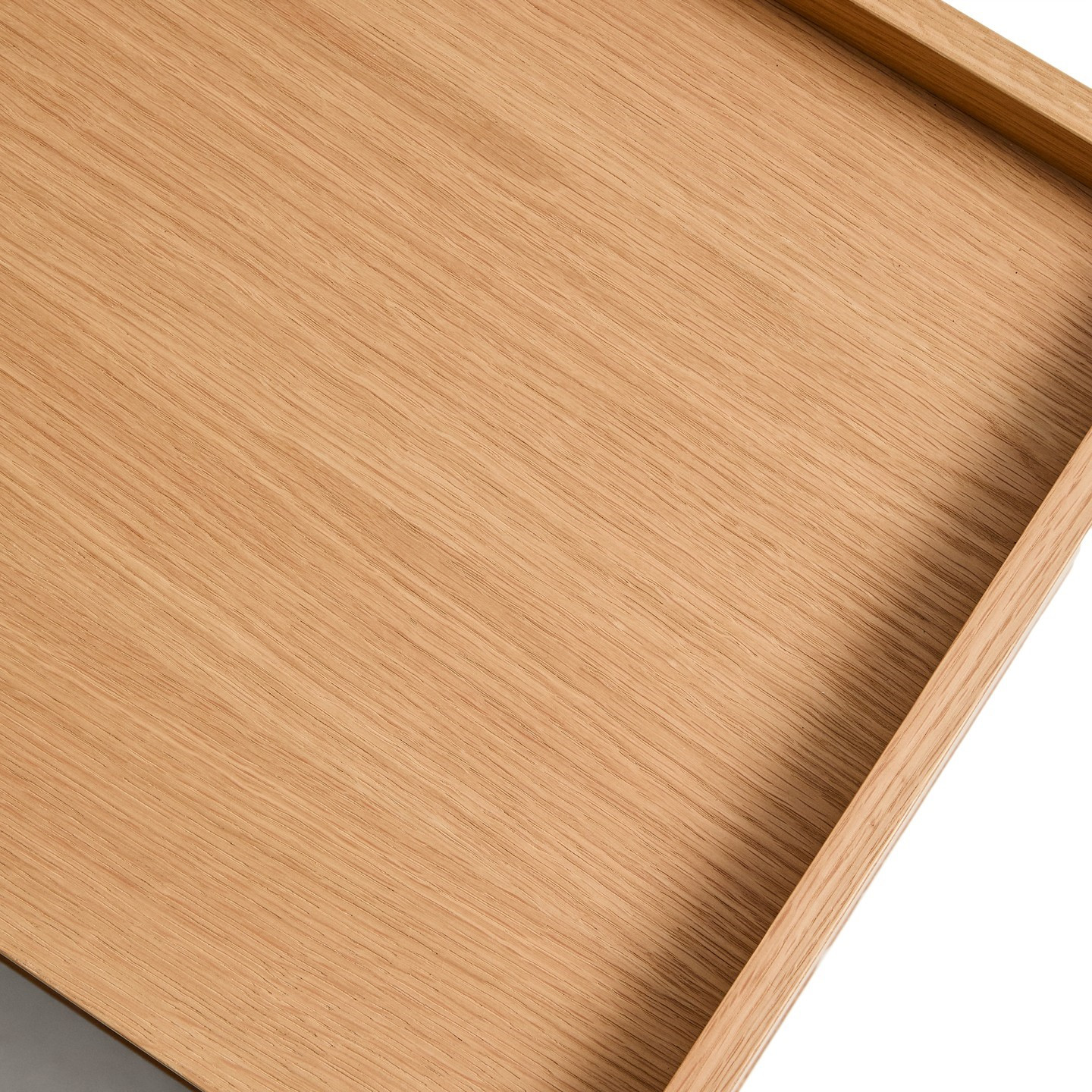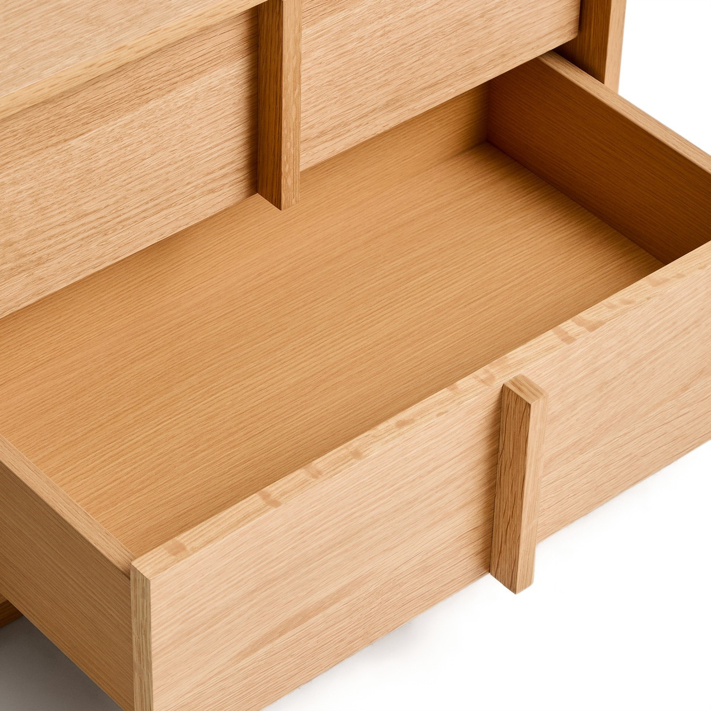 Onix Kave Home to elegancka, nowoczesna szafka nocna inspirowana japońskimi drzwiami Shoji, łączący minimalizm ze współczesnym designem. Wykonana z MDF i forniru dębowego w naturalnym odcieniu, dodaje wnętrzu spokoju i harmonii. Dwie, przestronne szuflady z systemem cichego domykania są idealne do przechowywania. Wykończenie z forniru i lakieru poliuretanowego zapewnia trwałość i łatwość pielęgnacji.