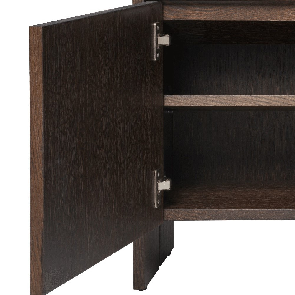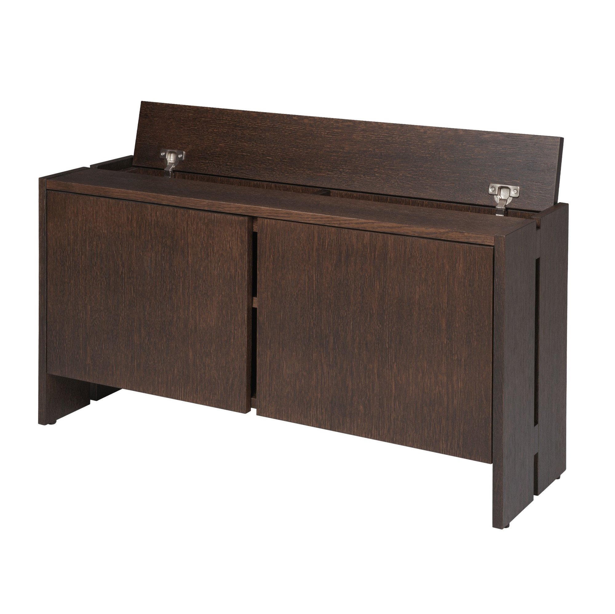 Kompaktowa i funkcjonalna szafka do przedpokoju, zaprojektowana z myślą o małych przestrzeniach. Wykonana z forniru dębowego z certyfikatem FSC™, w eleganckim wykończeniu ciemny dąb, łączy naturalne materiały z nowoczesnym designem. Dzięki przemyślanej konstrukcji z uchylnymi półkami, które można ustawić pod kątem, doskonale sprawdzi się jako szafka na buty lub praktyczne miejsce do przechowywania w wąskich korytarzach i mieszkaniach.