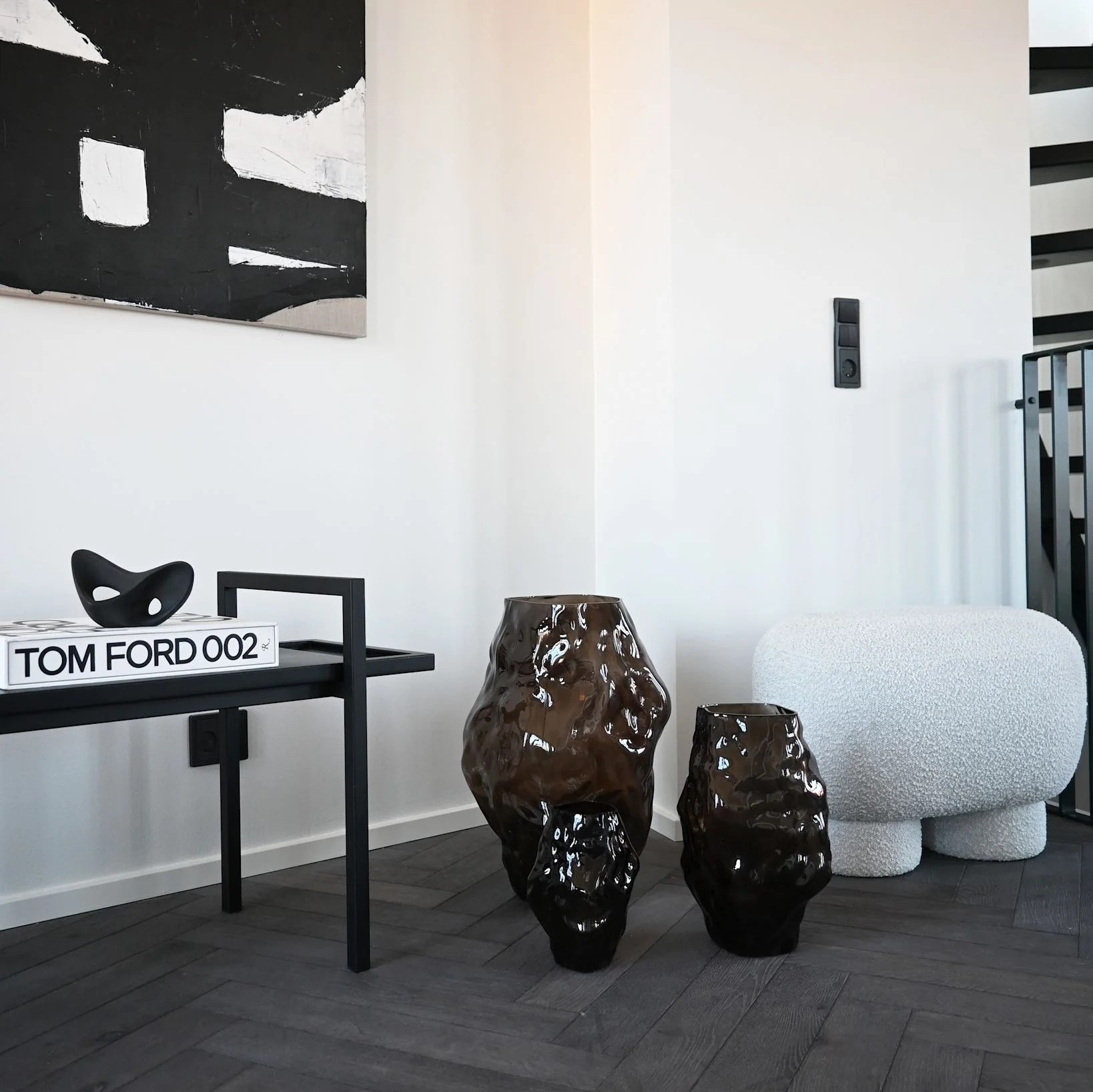 Każdy egzemplarz jest unikatowy, a jego krystaliczna przejrzystość wprowadza do wnętrza nastrojową głębię i subtelną elegancję. Wazon Katachi doskonale sprawdza się zarówno solo, jako dekoracyjny obiekt, jak i w zestawieniu z innymi rozmiarami kolekcji, dodając wnętrzom elegancki ruch i harmonię. Idealny do salonu, jadalni czy przestrzeni biurowej, łącząc wysmakowany design z ponadczasową estetyką Wabi-Sabi.