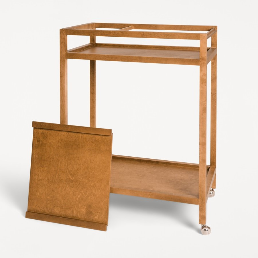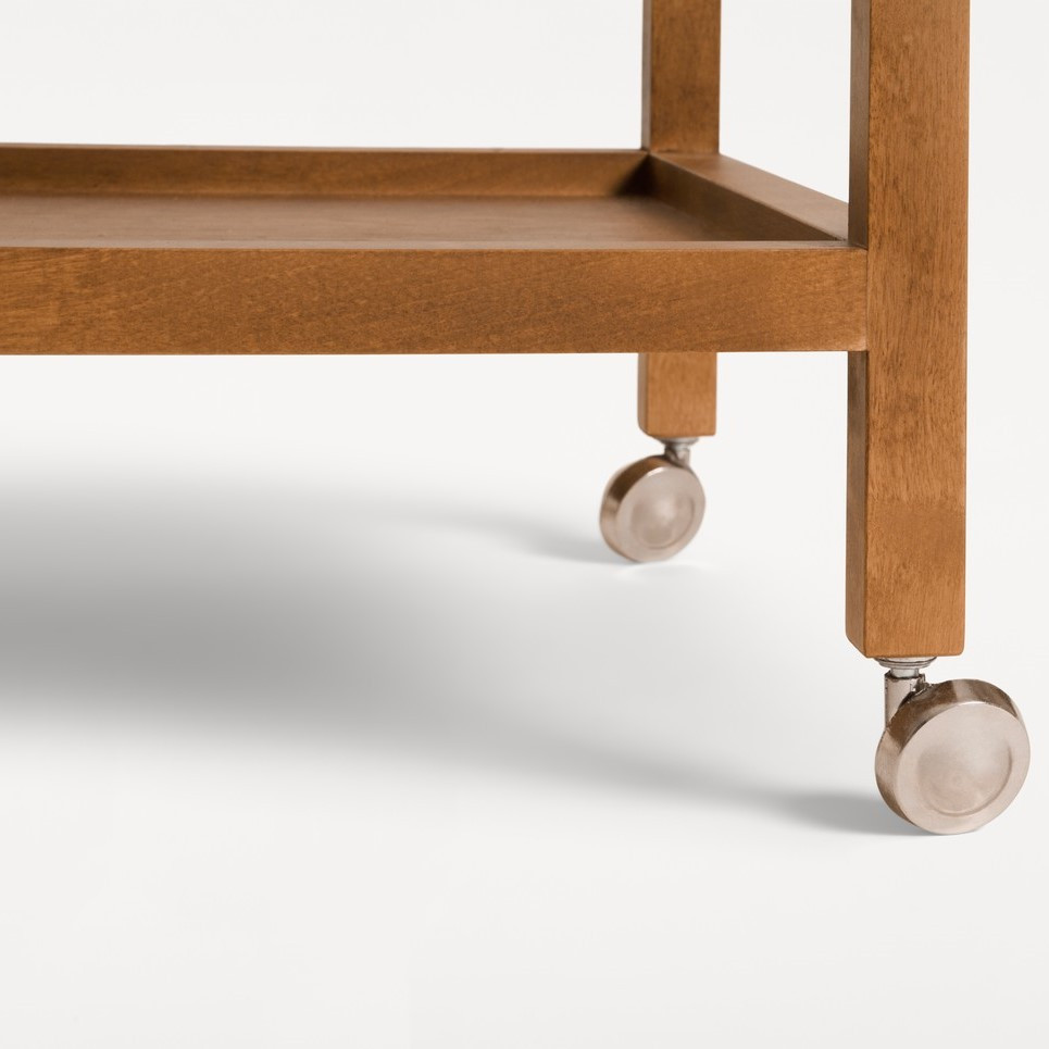Wózek barowy Ratio duńskiej marki FRAMA to współczesna interpretacja klasycznego barku na kółkach. Projekt nawiązuje do tradycyjnych form, ale wykonany jest z nieoczywistych materiałów MDF-u, forniru brzozowego i litej brzozy, które nadają mu szlachetny, naturalny charakter. Wykończenie w ciepłym odcieniu Warm Brown podkreśla strukturę drewna, a subtelny połysk bejcy i lakieru dodaje głębi.