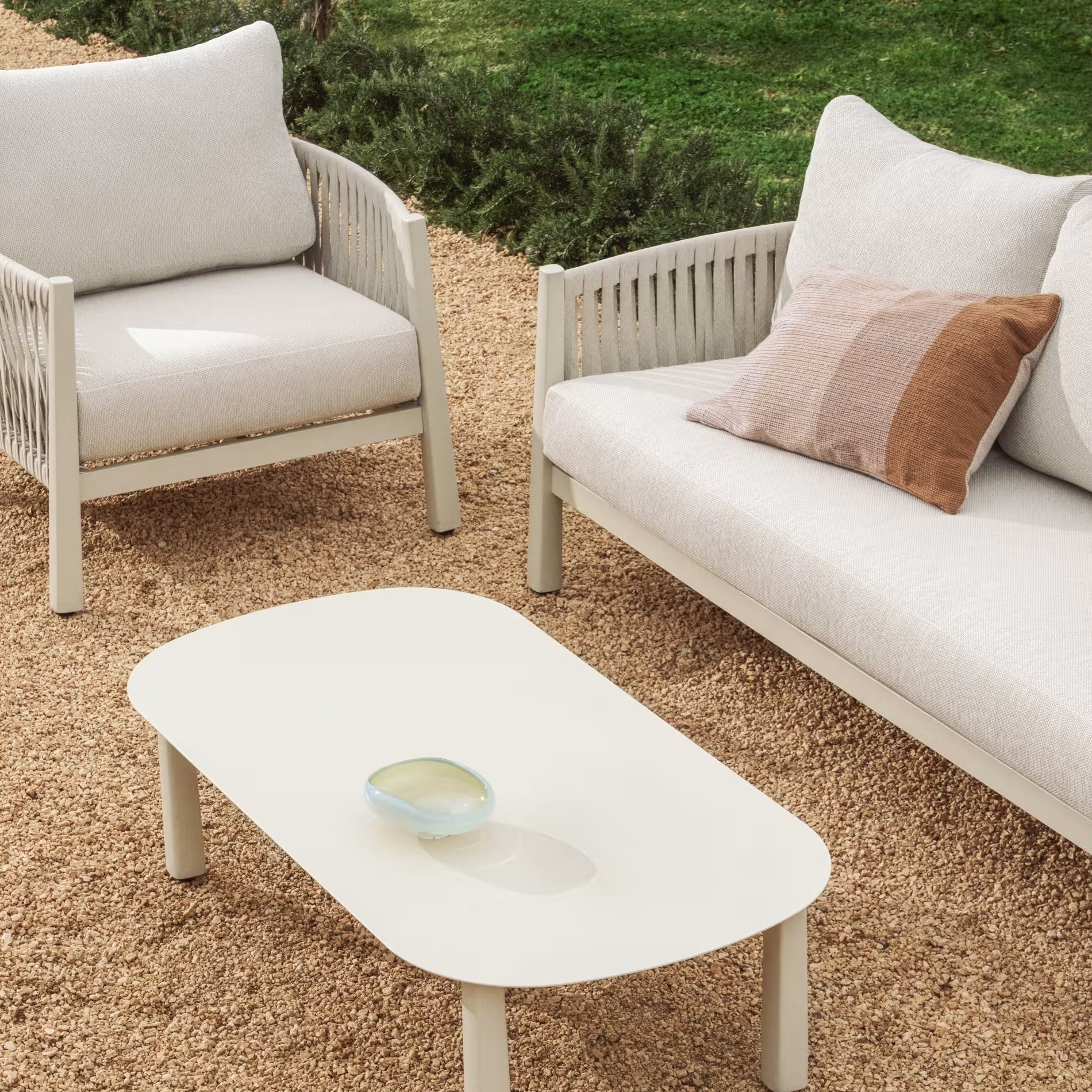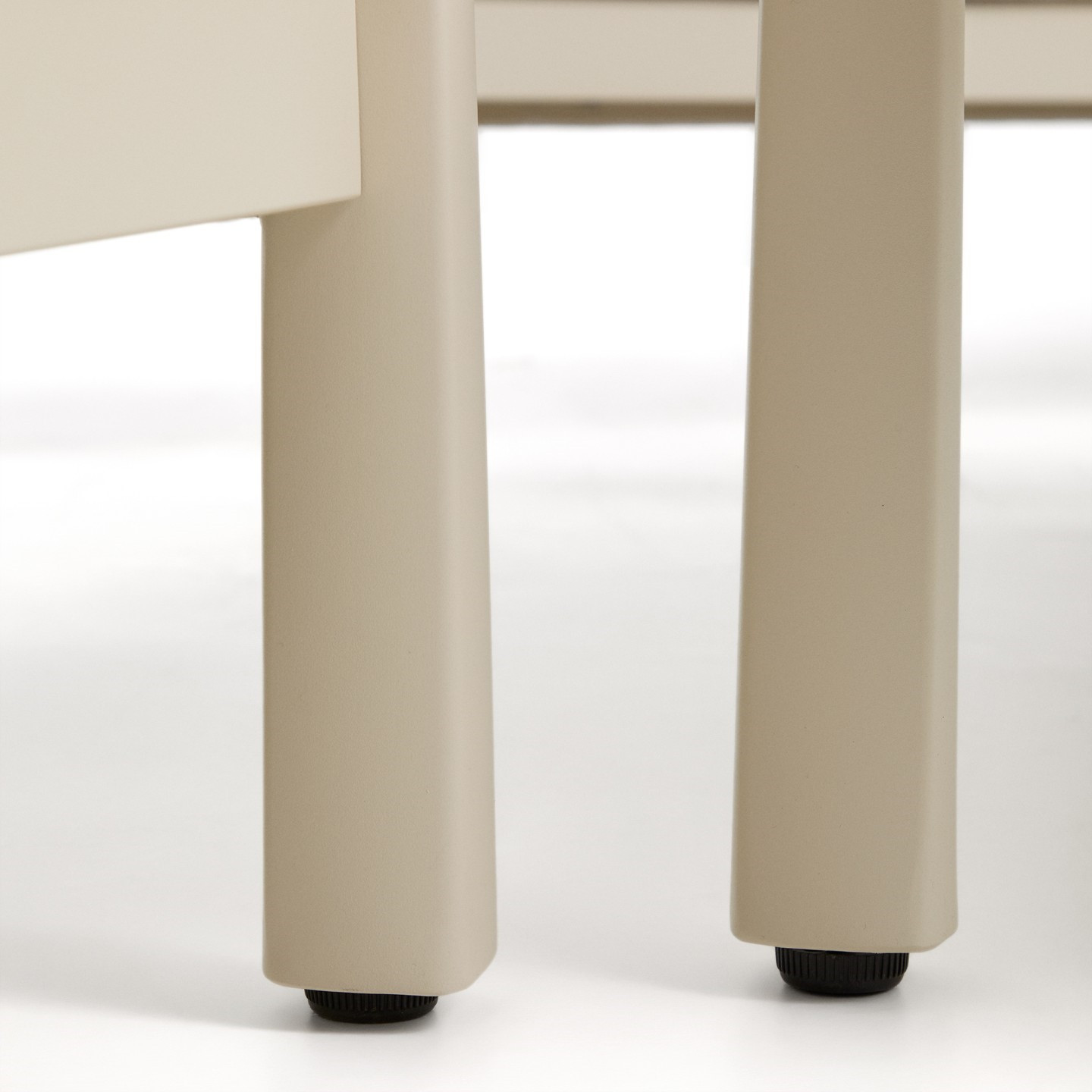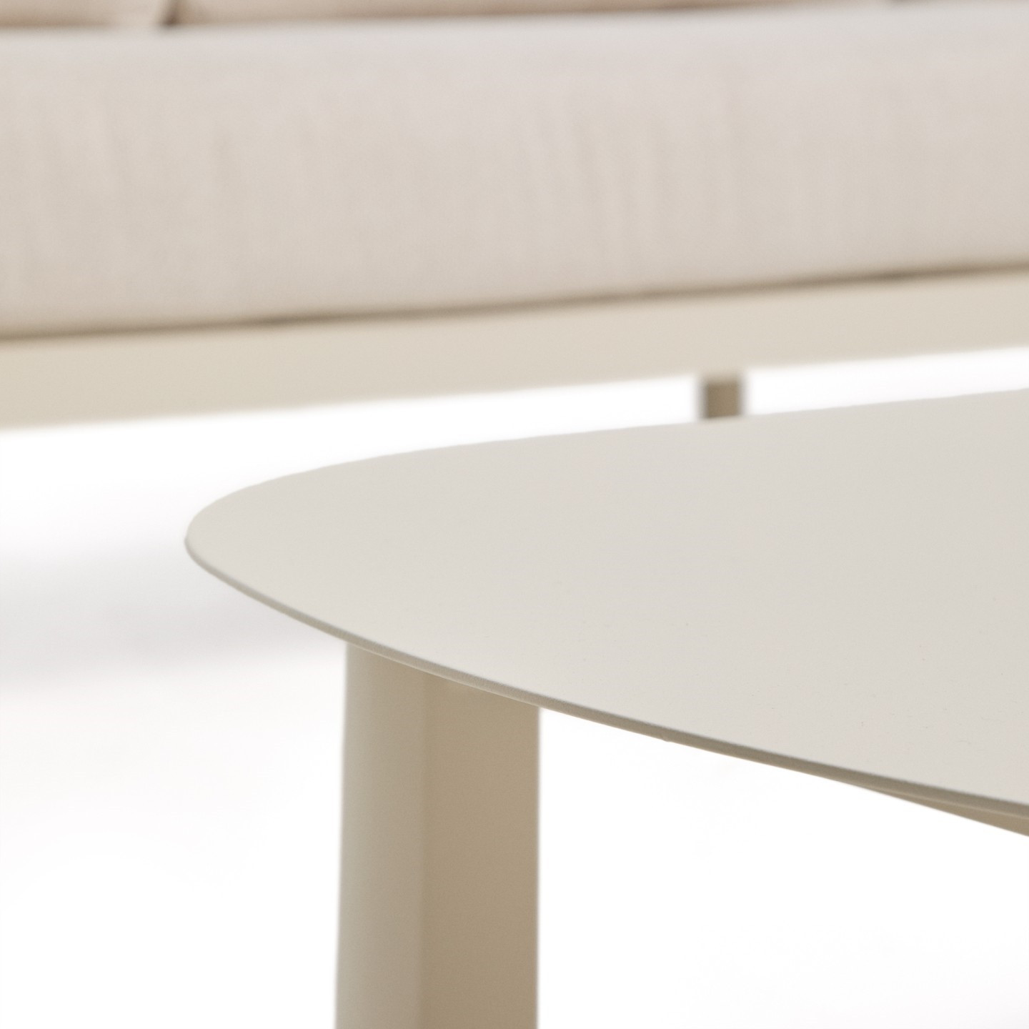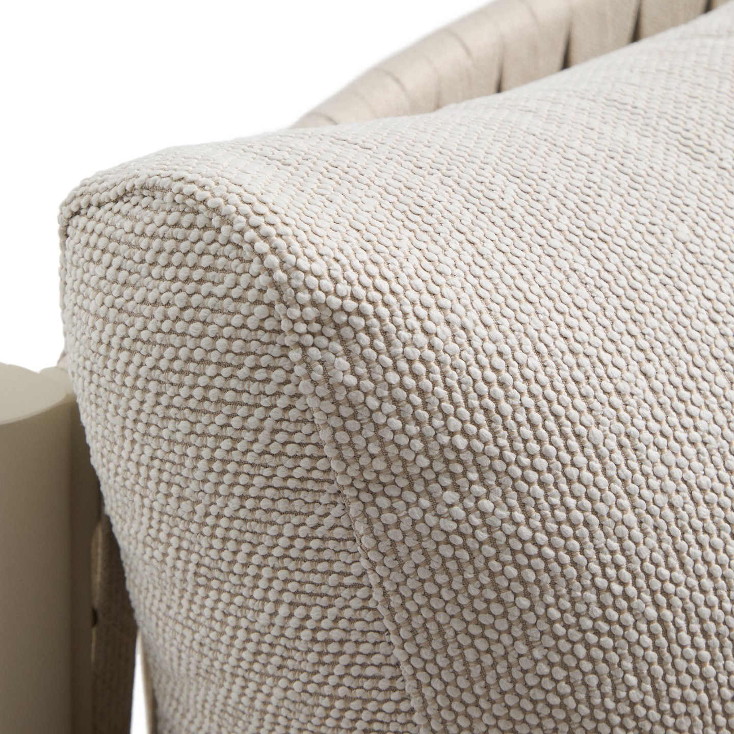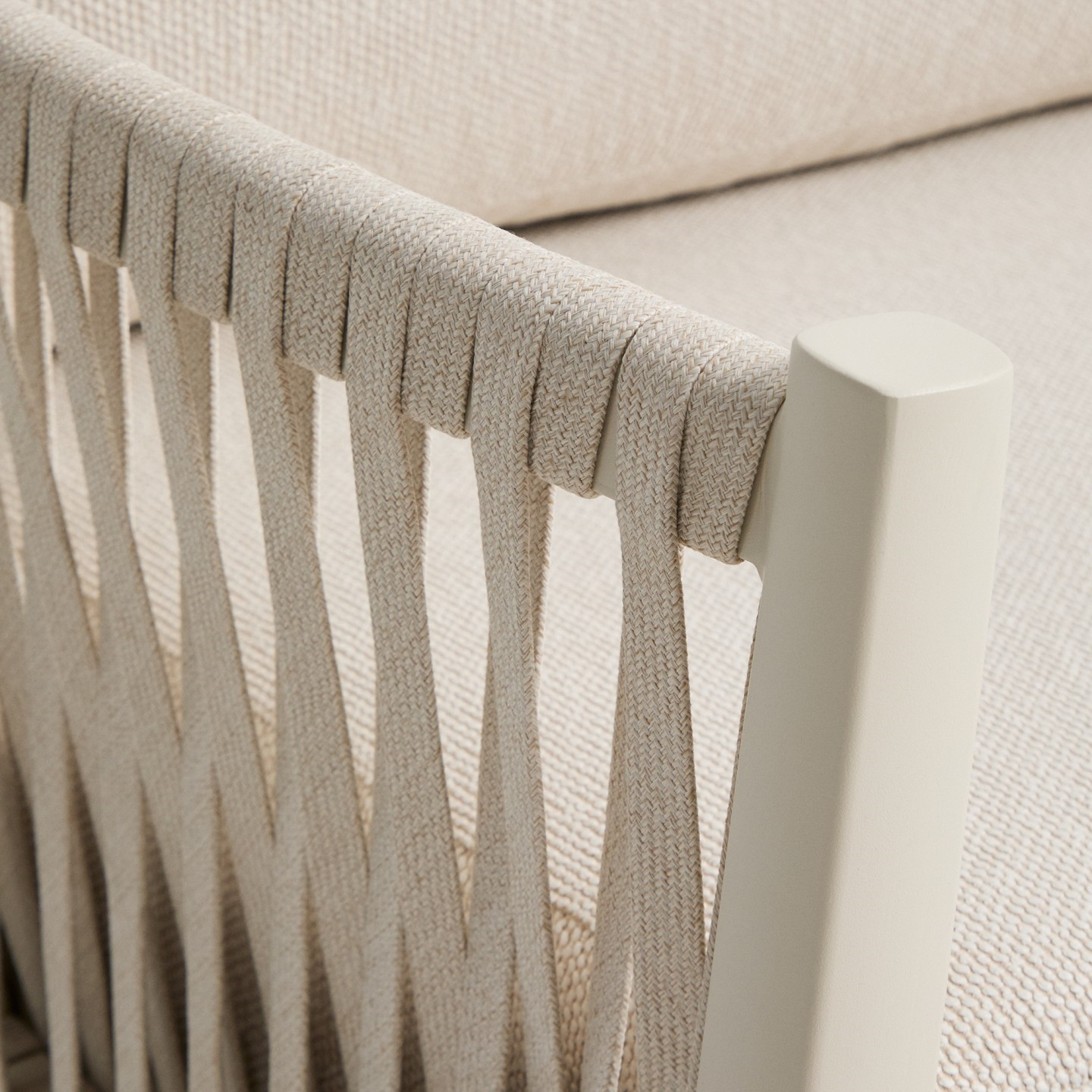 Konstrukcja mebli wykonana została z lekkiego i trwałego aluminium, a oparcia wykończono ręcznie plecioną liną syntetyczną odporną na warunki zewnętrzne. Połączenie tych materiałów sprawia, że zestaw jest nie tylko wytrzymały, ale również prezentuje się nowocześnie i elegancko. Naturalna plecionka nadaje całości przytulnego charakteru, dzięki czemu zestaw Aleria świetnie wpisuje się w aranżacje ogrodów, tarasów i stref wypoczynkowych.