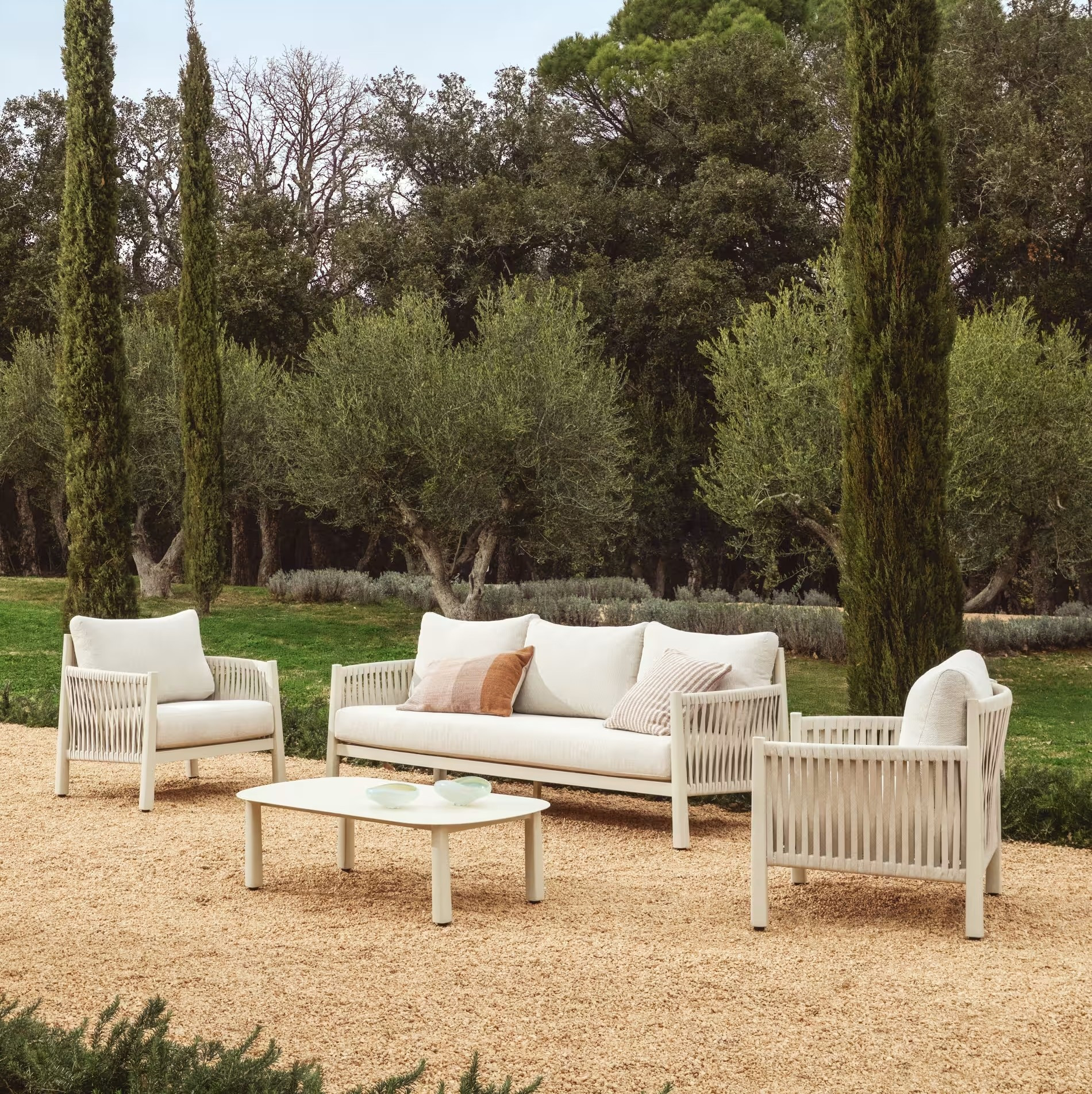 Zestaw ogrodowy Aleria to stylowa propozycja dla osób, które chcą stworzyć wygodną strefę relaksu na tarasie, balkonie lub w ogrodzie. Komplet składa się z przestronnej sofy trzyosobowej, dwóch komfortowych foteli oraz praktycznego stolika kawowego, który doskonale sprawdzi się podczas spotkań przy kawie czy letniego odpoczynku na świeżym powietrzu.