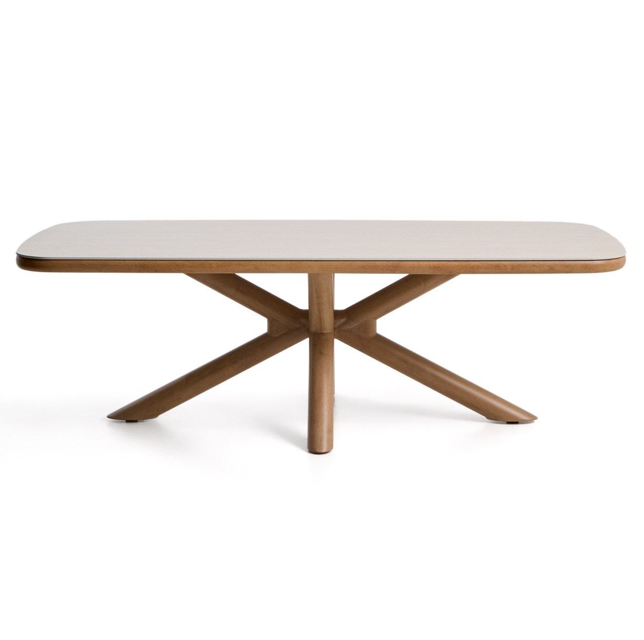 Zestaw stół Mirtia z krzesłami Sirte to elegancka i funkcjonalna propozycja do ogrodu, tarasu czy na patio. Blat stołu wykonano z kamienia spiekanego o gładkiej, przyjemnej w dotyku powierzchni, która jest odporna na zarysowania, plamy, wodę i ekstremalne temperatury, zapewniając trwałość na lata. Aluminiowa konstrukcja z wykończeniem imitującym drewno dodaje meblowi lekkości, stabilności i naturalnego charakteru, a plastikowe ochraniacze na nogach chronią podłogę przed uszkodzeniami.