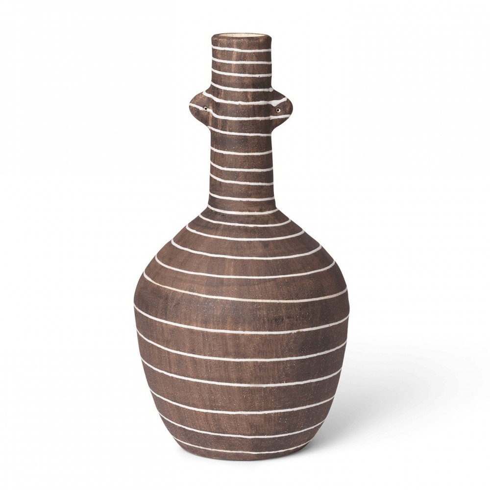 Wazon Brura charakteryzuje się wydłużoną szyjką i smukłym korpusem ozdobionym białymi paskami, które wdzięcznie wiją się wokół jego formy. Wykonany z terakoty emanuje rustykalną elegancją, wzmocnioną szkliwem w kolorze kawy, które nadaje poczucie głębi i bogactwa. Ręcznie malowane paski podkreślają kontury wazonu, podczas gdy miniaturowe uszy po obu stronach dodają kapryśnej osobowości i uroku temu wyjątkowemu przedmiotowi.
