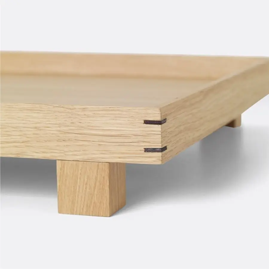 Dębowa taca na nóżkach z kolekcji Bon duńskiej marki Ferm Living. Świetnie się sprawdzi w łazience jako miejsce na kosmetyki czy drobną biżuterię jak i w kuchni gdzie wyeksponujesz np; drewniane młynki do soli i pieprzu czy dekoracyjne świece.