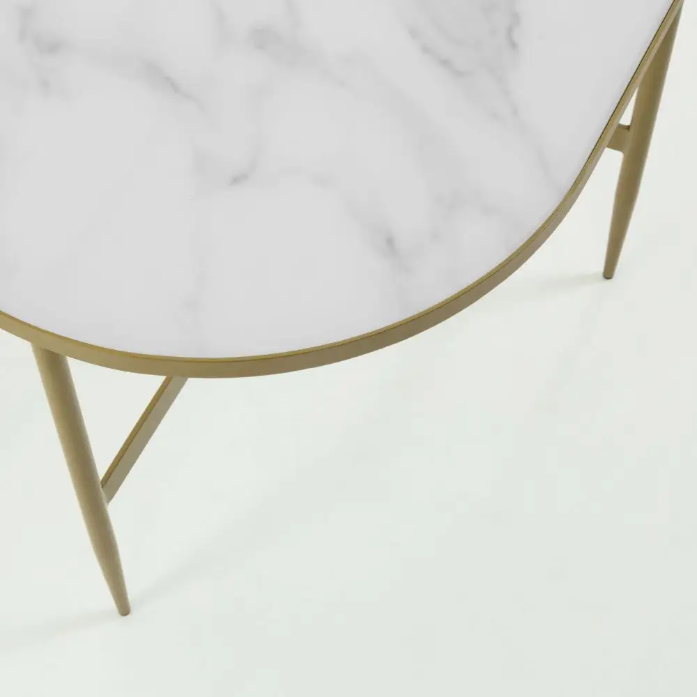 Konsola Elisenda z pewnością będzie mile widzianym dodatkiem np; w Twoim salonie czy przedpokoju. Konsola posiada owalny, szklany blat imitujący marmur oraz stalową ramę w złotym wykończeniu.