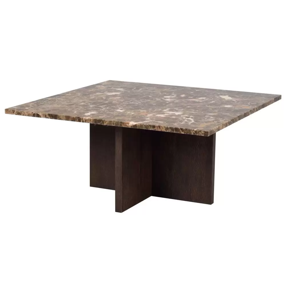Prezentowany stolik kawowy jest częścią serii Brooksville, w której możesz wybierać między nogami z brązowego lub bielonego drewna, a okrągłym lub kwadratowym blatem z brązowego lub białego marmuru.