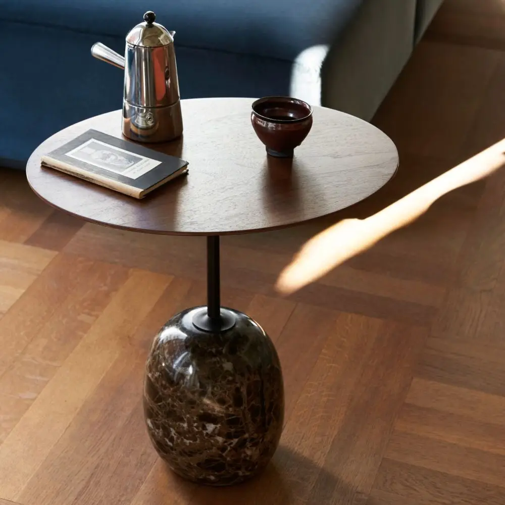 Stolik LATO LN9 występuje w 5 wariantach kolorystycznych; Deep Green & Verde Alpi marble, Warm Black & Emparador marble, Ivory White & Crema Diva marble, Lacquered Walnut w. Emparador marble oraz Lacquered Oak w. Crema Diva marble.