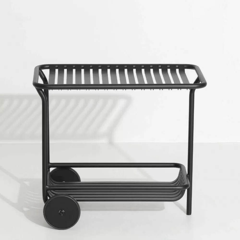 Wózek barowy z kolekcji mebli ogrodowych Week-End francuskiej marki Petite Friture. Wykonany z aluminium malowanego proszkowo odpornego na niekorzystne warunki atmosferyczne. Ażurowe półki z praktycznego punktu widzenia sprawdzą się podczas deszczu (szczeliny pozwalają na swobodny przepływ wody, która nie tworzy na powierzchni blatów kałuż, a tym samym nie niszczy powierzchni wózka).