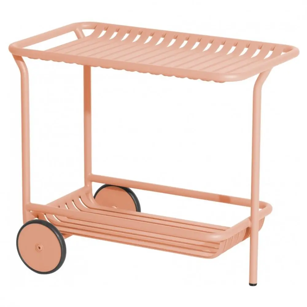 Wózek barowy z kolekcji mebli ogrodowych Week-End francuskiej marki Petite Friture. Wykonany z aluminium malowanego proszkowo odpornego na niekorzystne warunki atmosferyczne. Ażurowe półki z praktycznego punktu widzenia sprawdzą się podczas deszczu (szczeliny pozwalają na swobodny przepływ wody, która nie tworzy na powierzchni blatów kałuż, a tym samym nie niszczy powierzchni wózka).