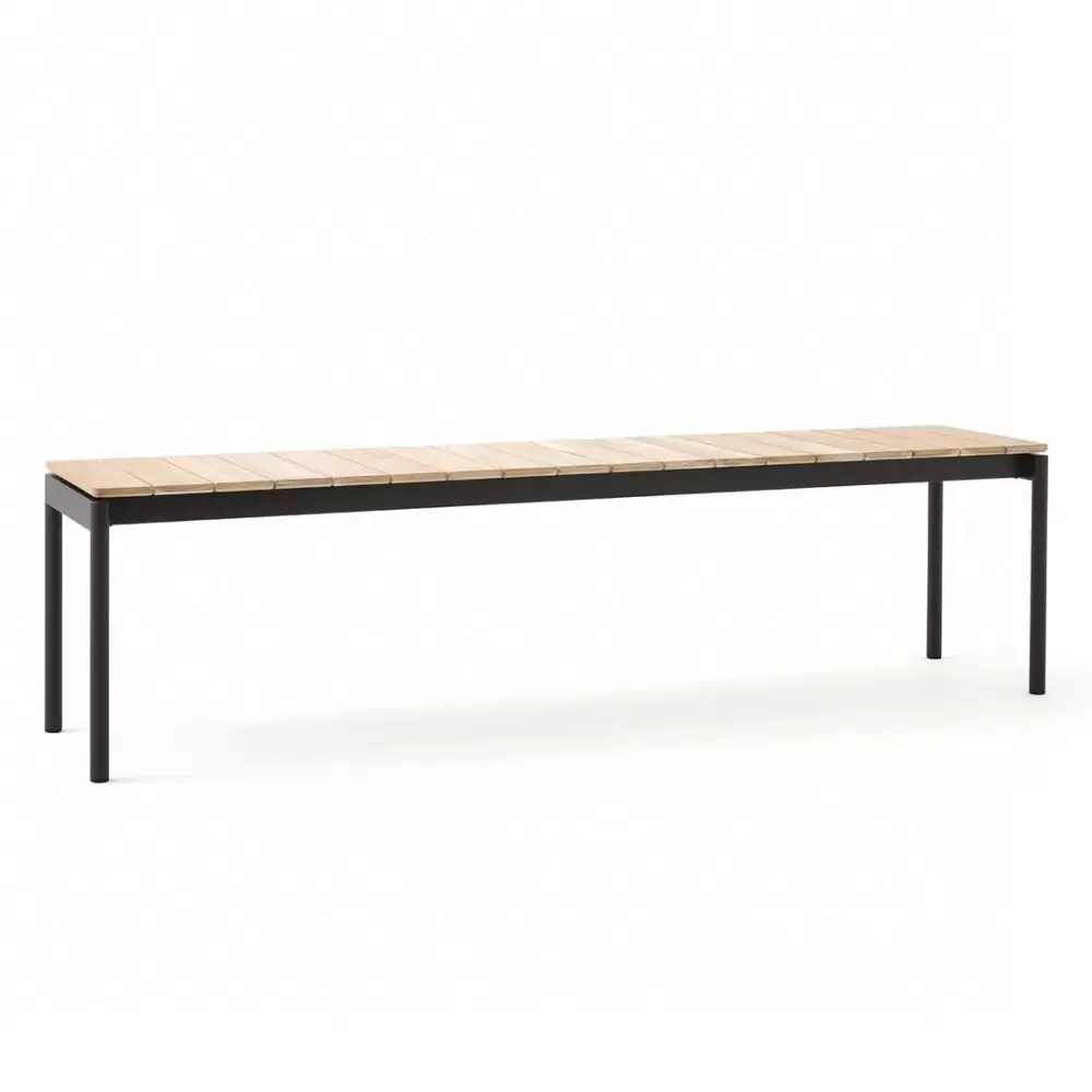 Ławka ogrodowa z serii Ville duńskiej marki &Tradition. Ta nowoczesna kolekcja mebli do ogrodu została zaprojektowana w celu zaspokojenia potrzeb dla przestrzeni zewnętrznych zarówno domowych jak i komercyjnych. Siedzisko ławki wykonane zostało z odpornego na wilgoć i czynniki atmosferyczne drewna teak natomiast podstawa z metalu malowanego proszkowo. Ażurowe siedzisko z praktycznego punktu widzenia sprawdzi się podczas deszczu (szczeliny pozwalają na swobodny przepływ wody, która nie tworzy na powierzchni kałuż, a tym samym nie niszczy materiału).